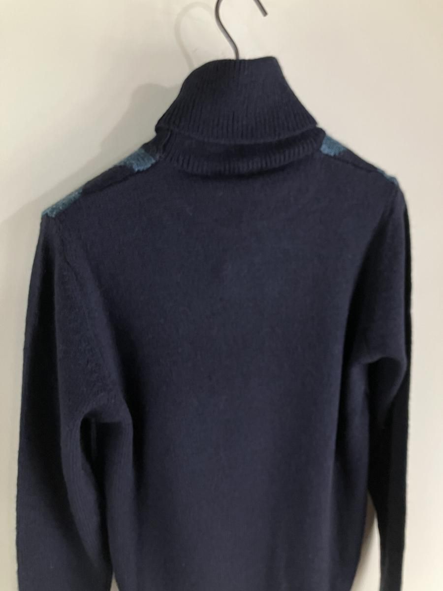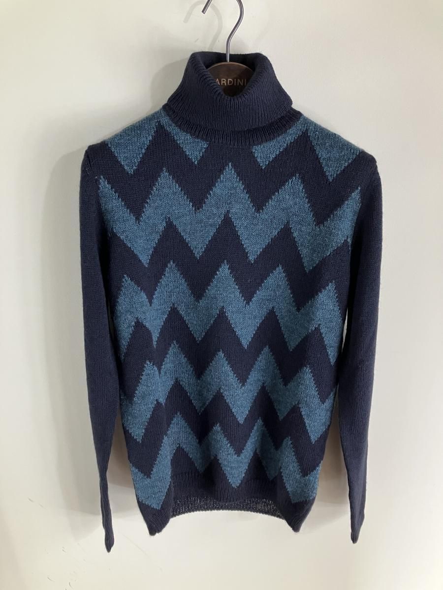 ラルディーニの変形アーガイルタートルネックセーター。アルパカならではのとても柔らかい手触りと、ネイビーとブルーの配色の前身ごろに全面にはいる柄がとてもラルディーニらしい洗練された感じのタートルネックのニットです。肩幅は小さめでフィットした感じで着ていただけます。 【秋冬商品】