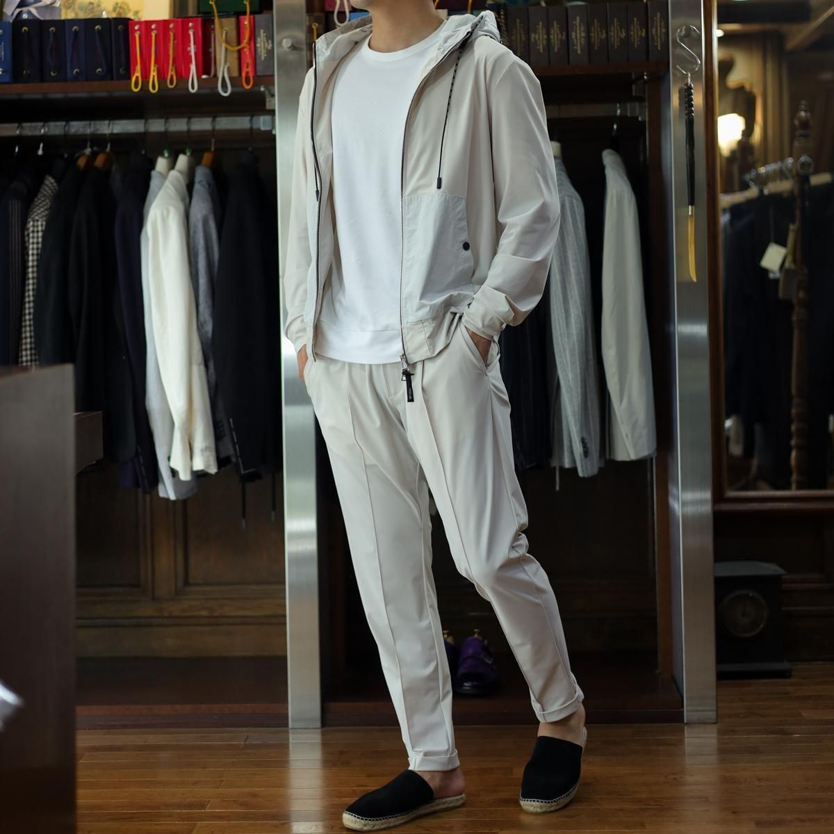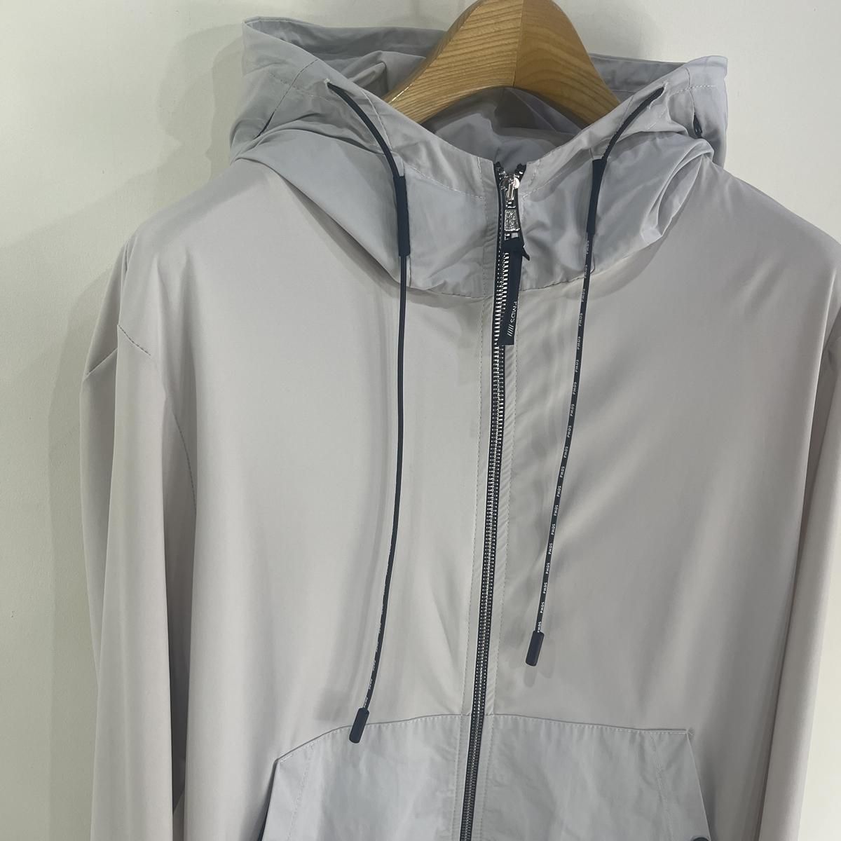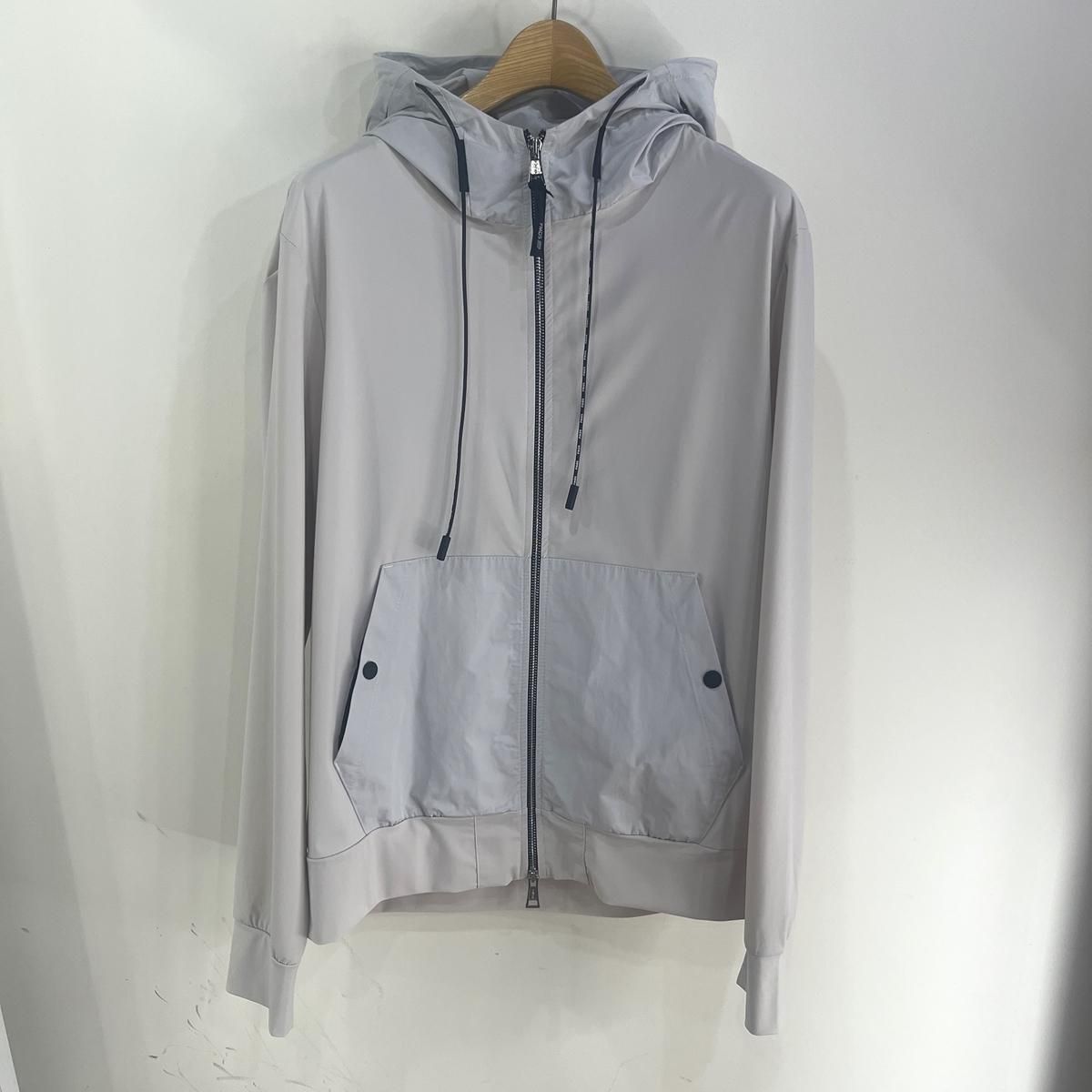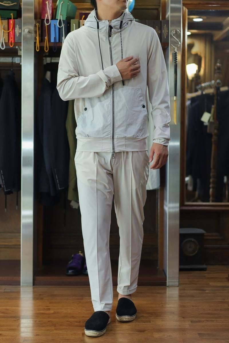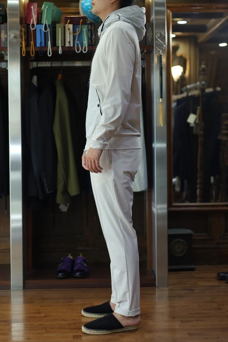 毎回好評をいただいているハイパーストレッチのパーカーセットアップです。カルビコ社製の29%のポリウレタンの着心地は最高。綺麗目にスポーティーにタウンユースでご利用いただいても、問題なくお召しいただけます。この一枚で中をシンプルなTシャツでデニムにも合わせますし、ゴルフなどのスポーツシーンでも大活躍しそうですね。とにかく伸び感が最高です。キックバック性能も高いので膝や肘がでたりすることはありません。非常に薄いので夏まで着用いただけます。オールシーズン通してご利用頂ける素材。色はアイスグレーで黒ばかりお持ちの方にはとても新鮮です。