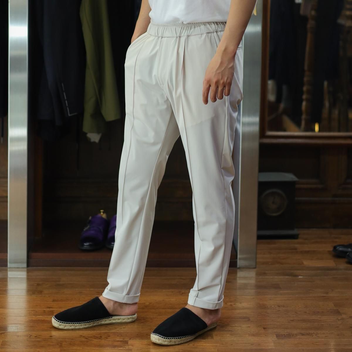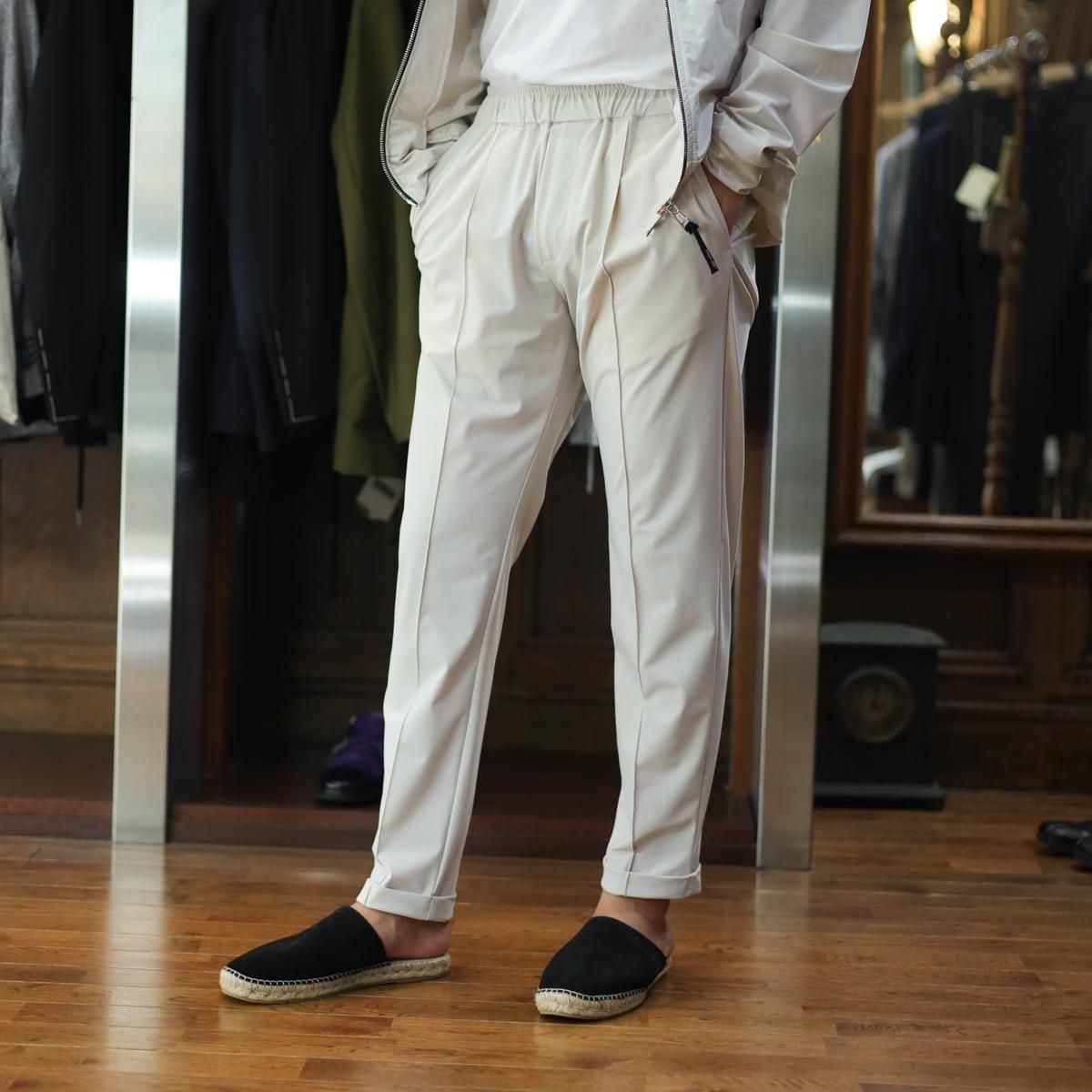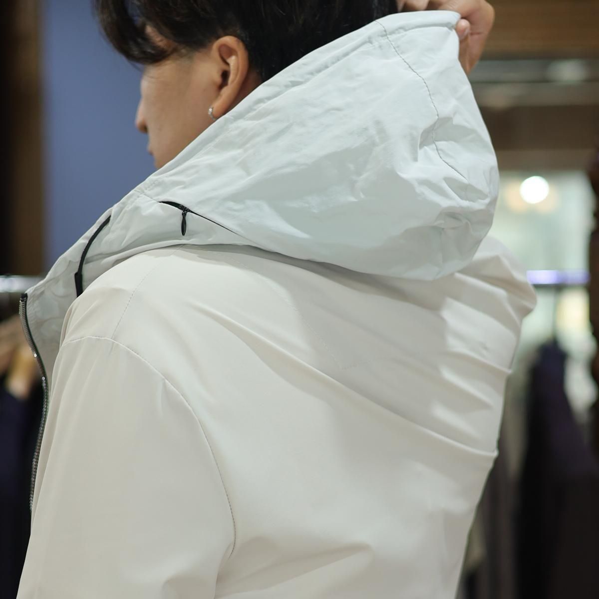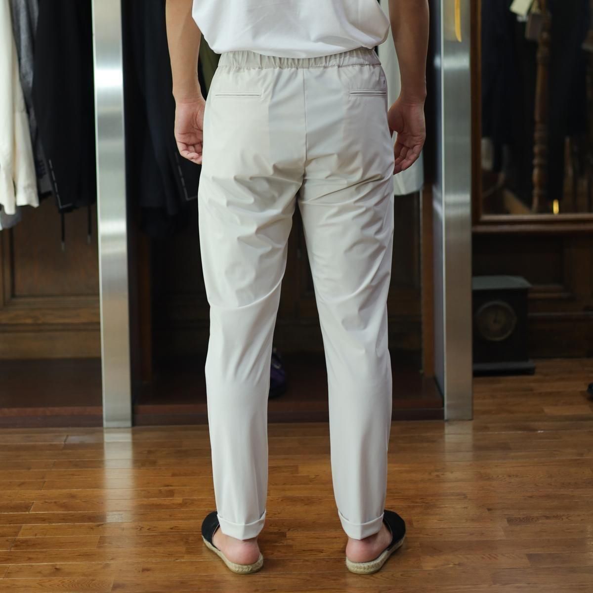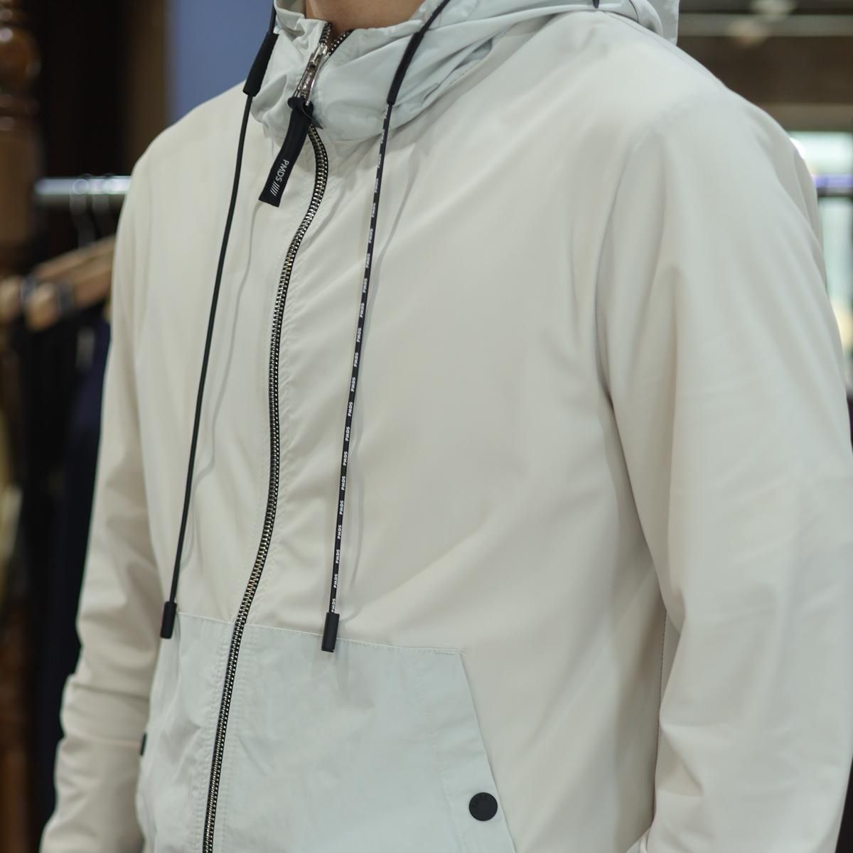 毎回好評をいただいているハイパーストレッチのパーカーセットアップです。カルビコ社製の29%のポリウレタンの着心地は最高。綺麗目にスポーティーにタウンユースでご利用いただいても、問題なくお召しいただけます。この一枚で中をシンプルなTシャツでデニムにも合わせますし、ゴルフなどのスポーツシーンでも大活躍しそうですね。とにかく伸び感が最高です。キックバック性能も高いので膝や肘がでたりすることはありません。非常に薄いので夏まで着用いただけます。オールシーズン通してご利用頂ける素材。色はアイスグレーで黒ばかりお持ちの方にはとても新鮮です。