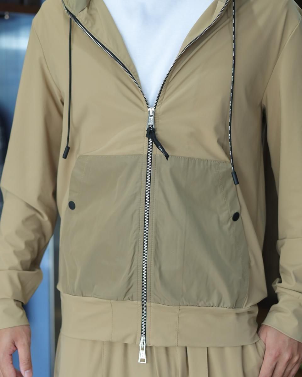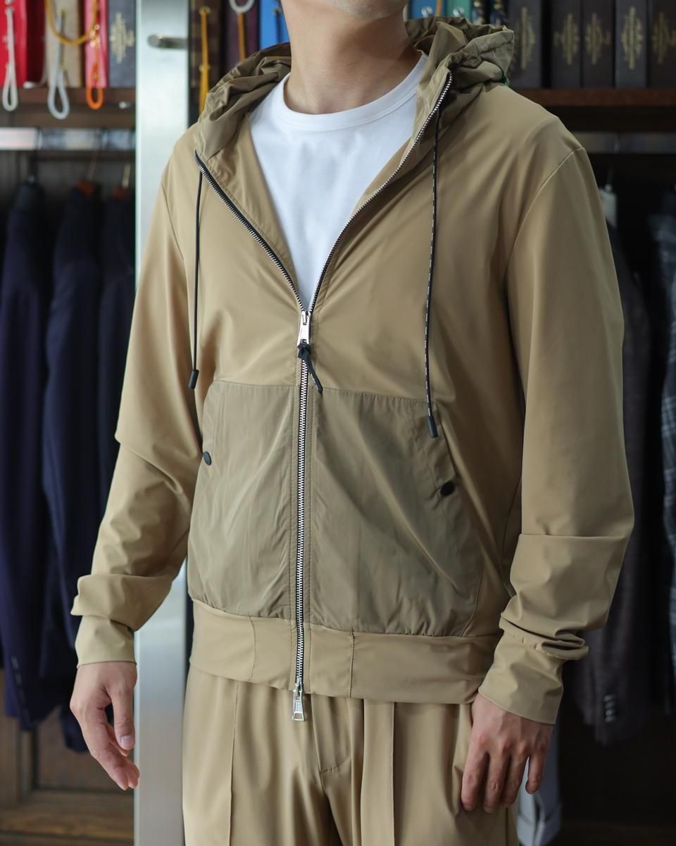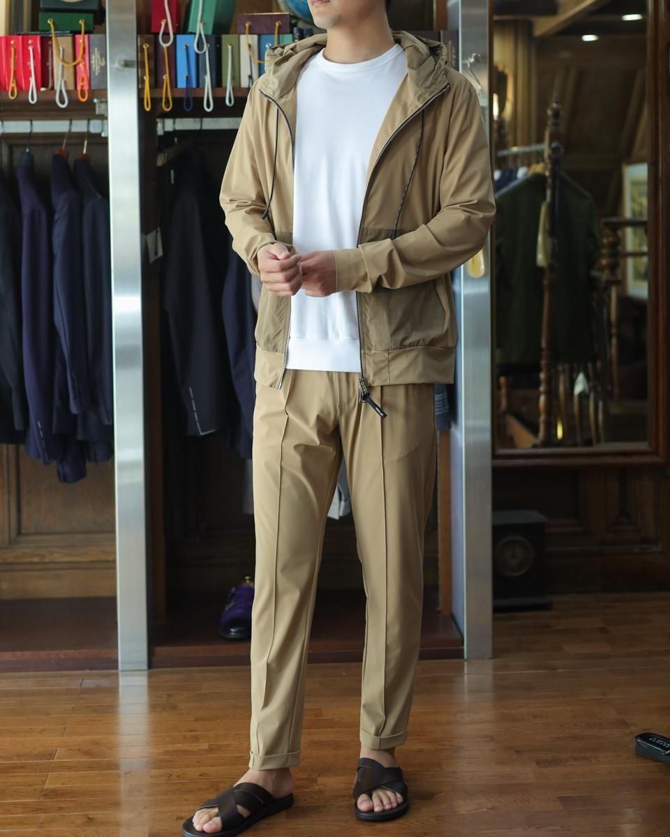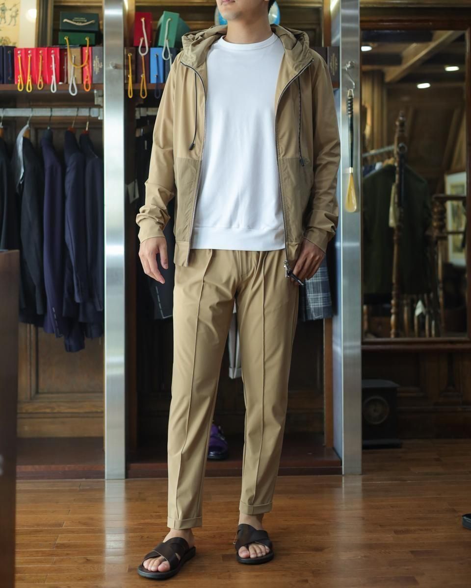 毎回好評をいただいているハイパーストレッチのパーカーセットアップです。カルビコ社製の29%のポリウレタンの着心地は最高。綺麗目にスポーティーにタウンユースでご利用いただいても、問題なくお召しいただけます。この一枚で中をシンプルなTシャツでデニムにも合わせますし、ゴルフなどのスポーツシーンでも大活躍しそうですね。とにかく伸び感が最高です。キックバック性能も高いので膝や肘がでたりすることはありません。非常に薄いので夏まで着用いただけます。オールシーズン通してご利用頂ける素材。色はキャメルで黒ばかりお持ちの方にはとても新鮮です。