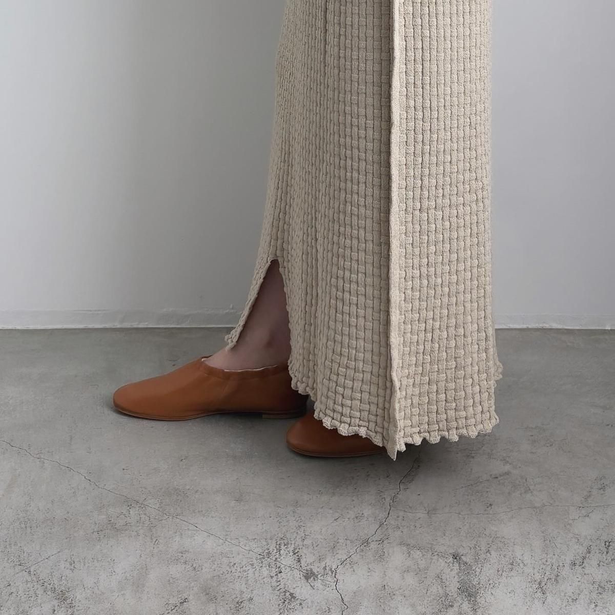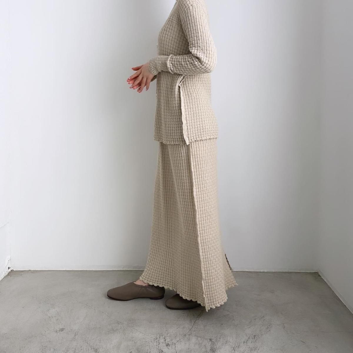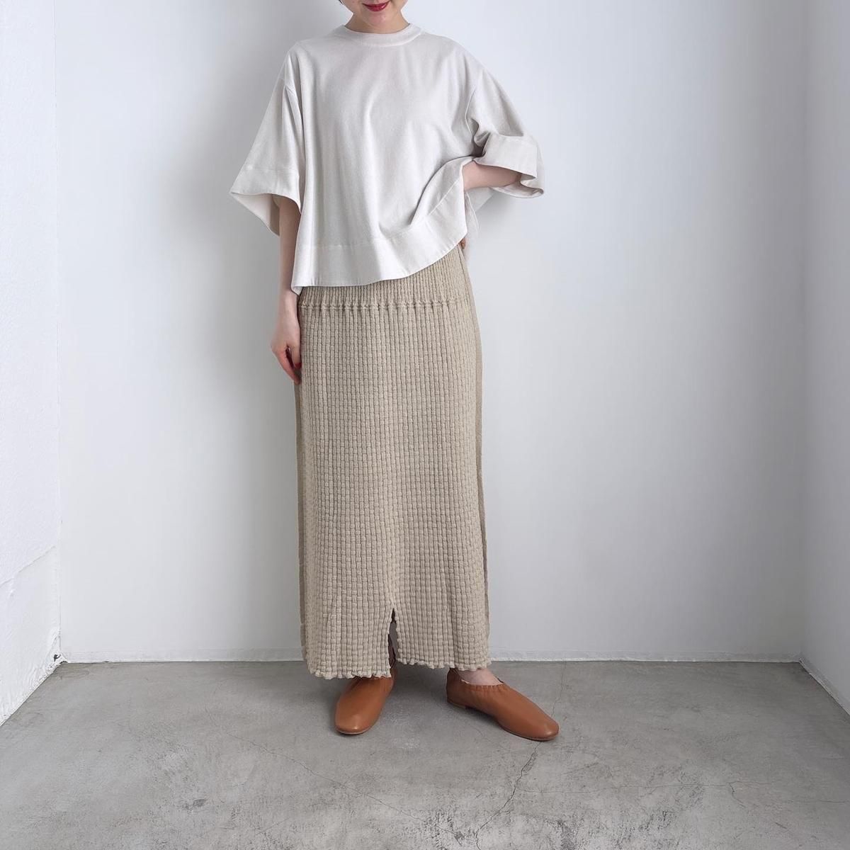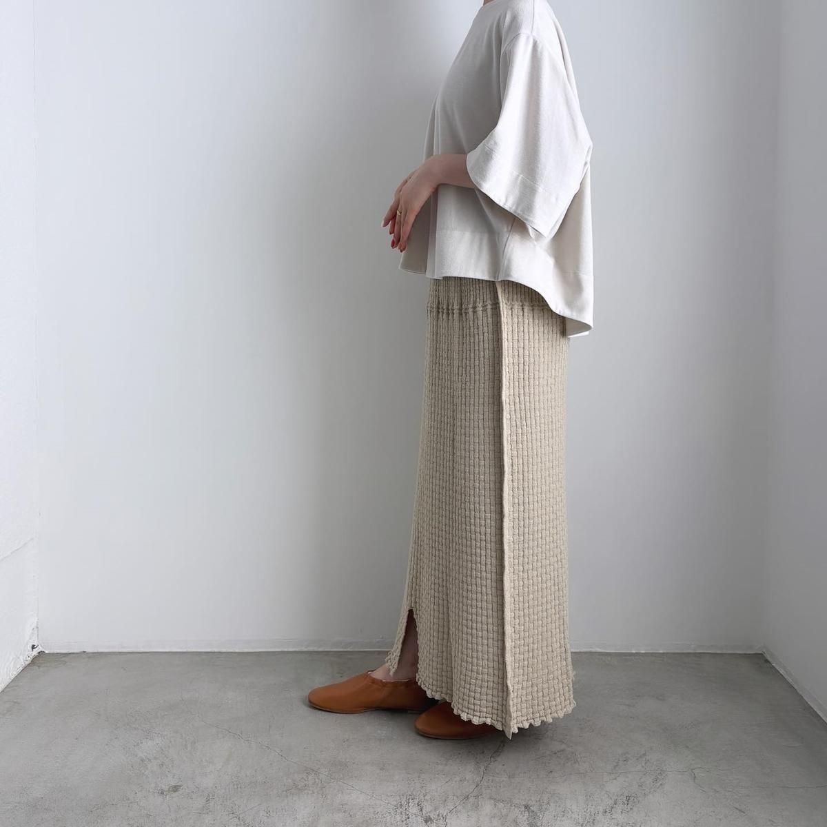 ウエストにタック編みをふんだんに作り、ぴったりしすぎずゆとりを持ったシルエットになるように考えてつくられています。着用前の見た目はとても細いですが、ニットなので伸びます。裾中心のスリットは前後どちらでも着られますので、その日のお好みで合わせてください。