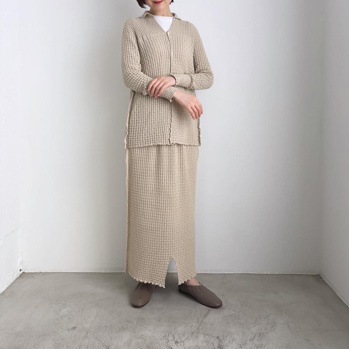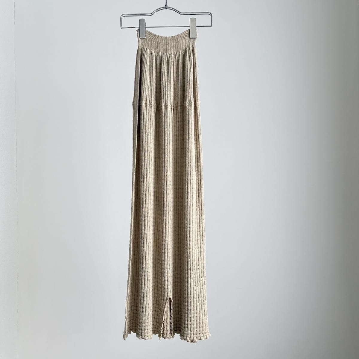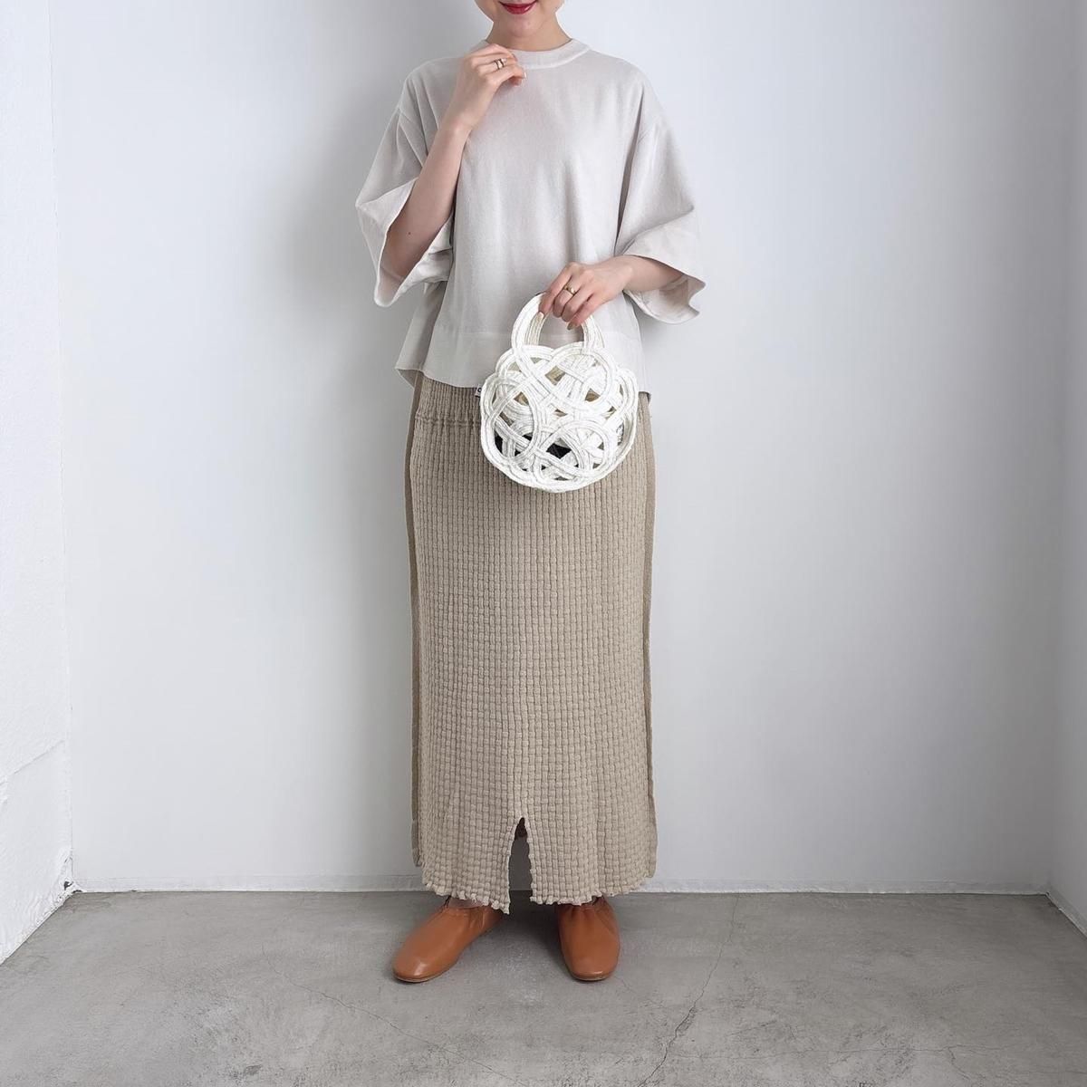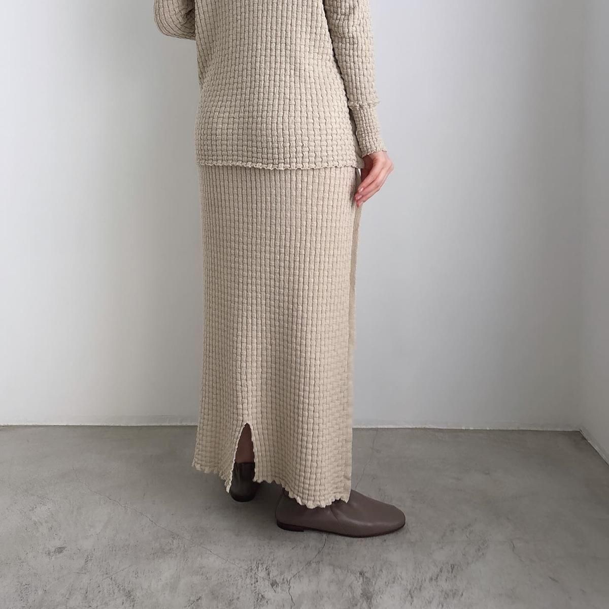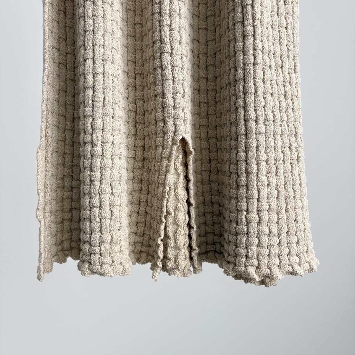 ウエストにタック編みをふんだんに作り、ぴったりしすぎずゆとりを持ったシルエットになるように考えてつくられています。着用前の見た目はとても細いですが、ニットなので伸びます。裾中心のスリットは前後どちらでも着られますので、その日のお好みで合わせてください。