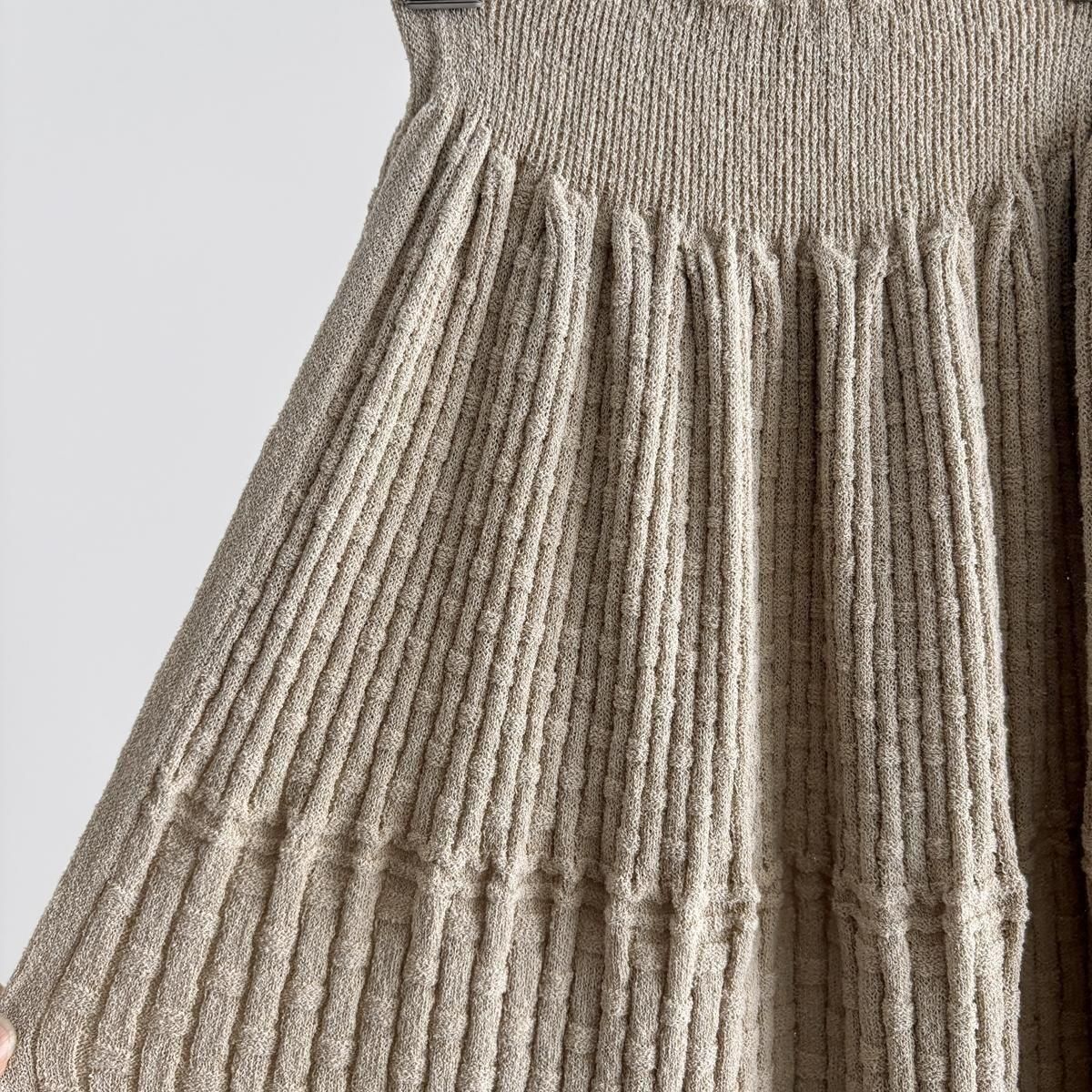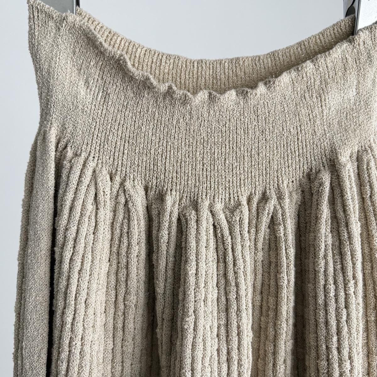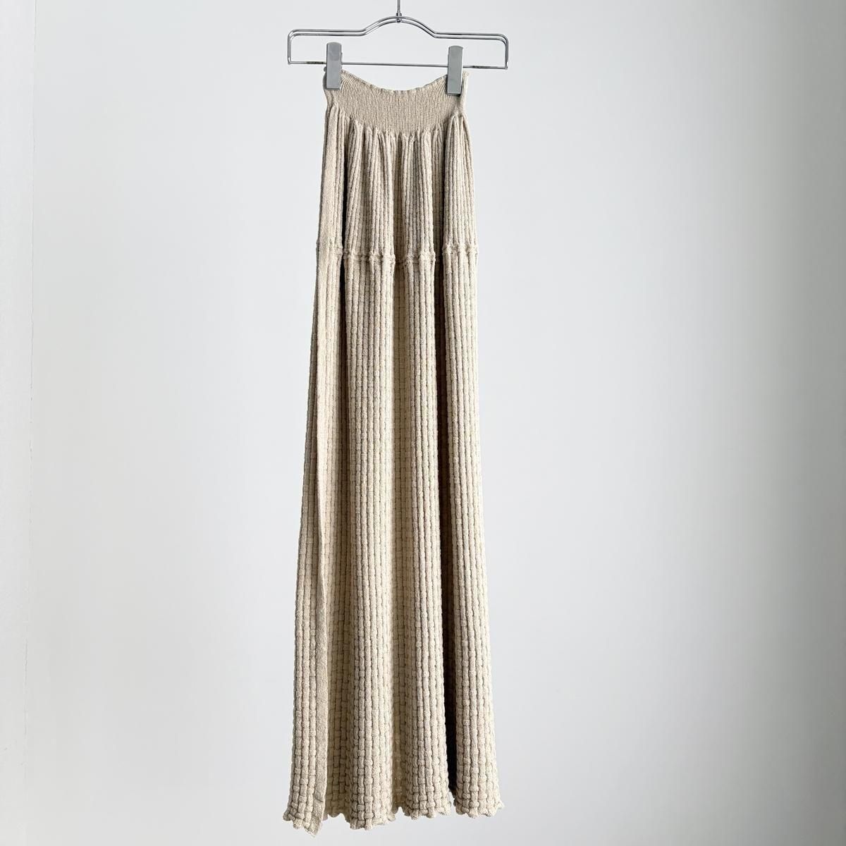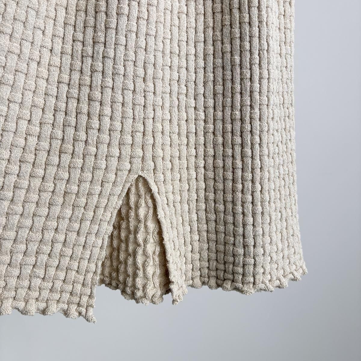 ウエストにタック編みをふんだんに作り、ぴったりしすぎずゆとりを持ったシルエットになるように考えてつくられています。着用前の見た目はとても細いですが、ニットなので伸びます。裾中心のスリットは前後どちらでも着られますので、その日のお好みで合わせてください。