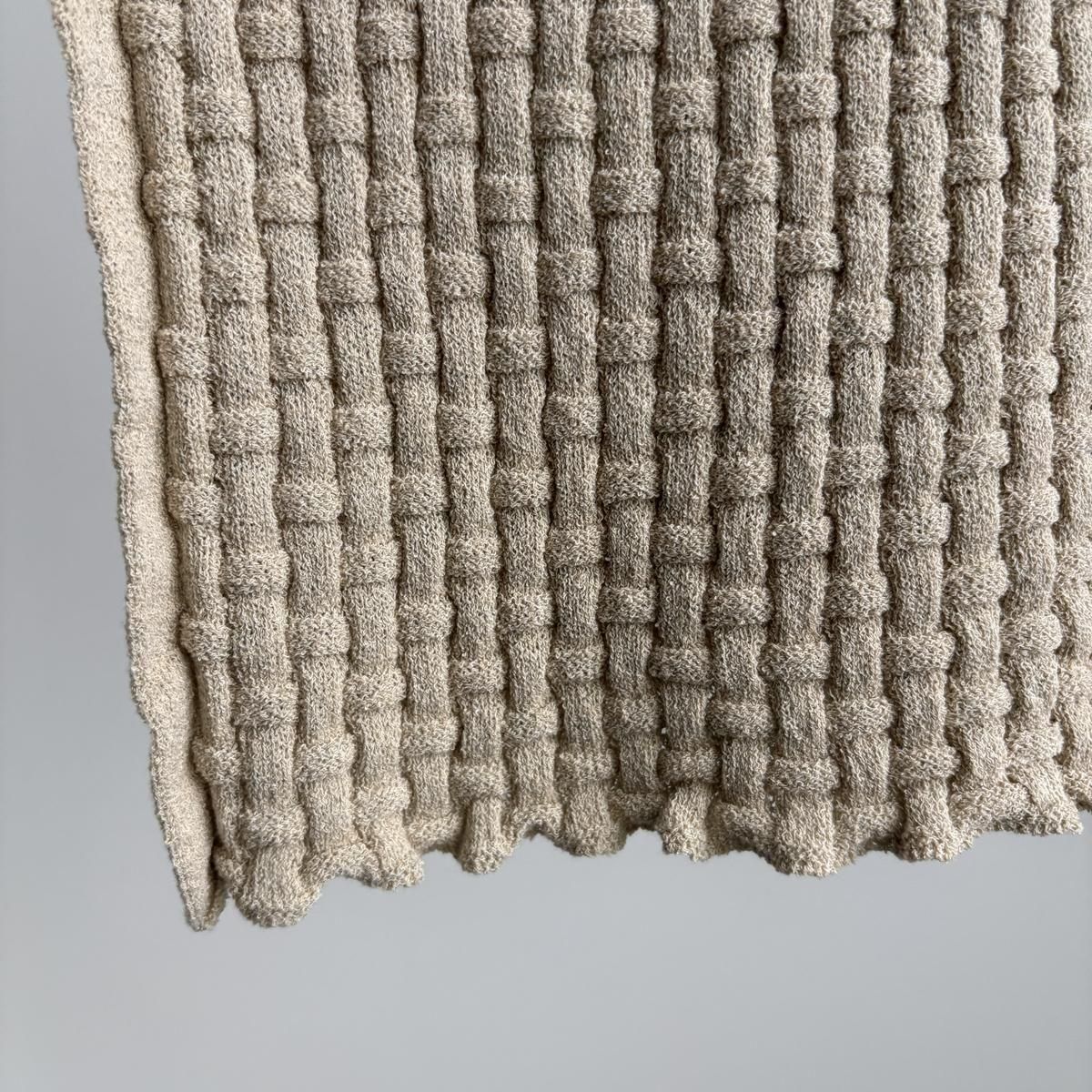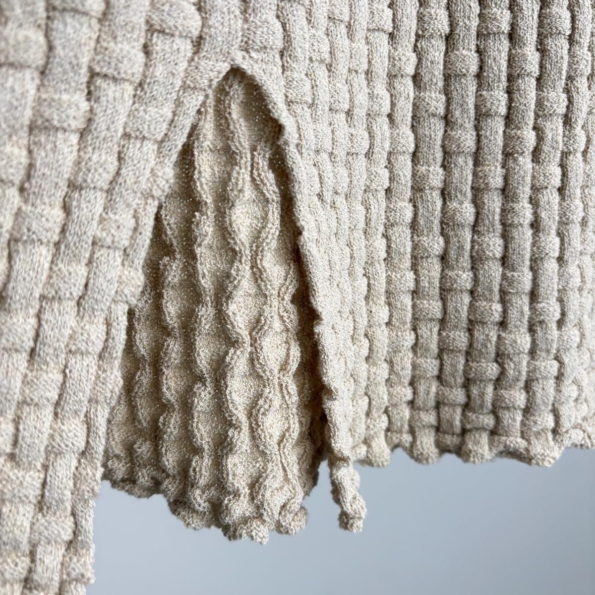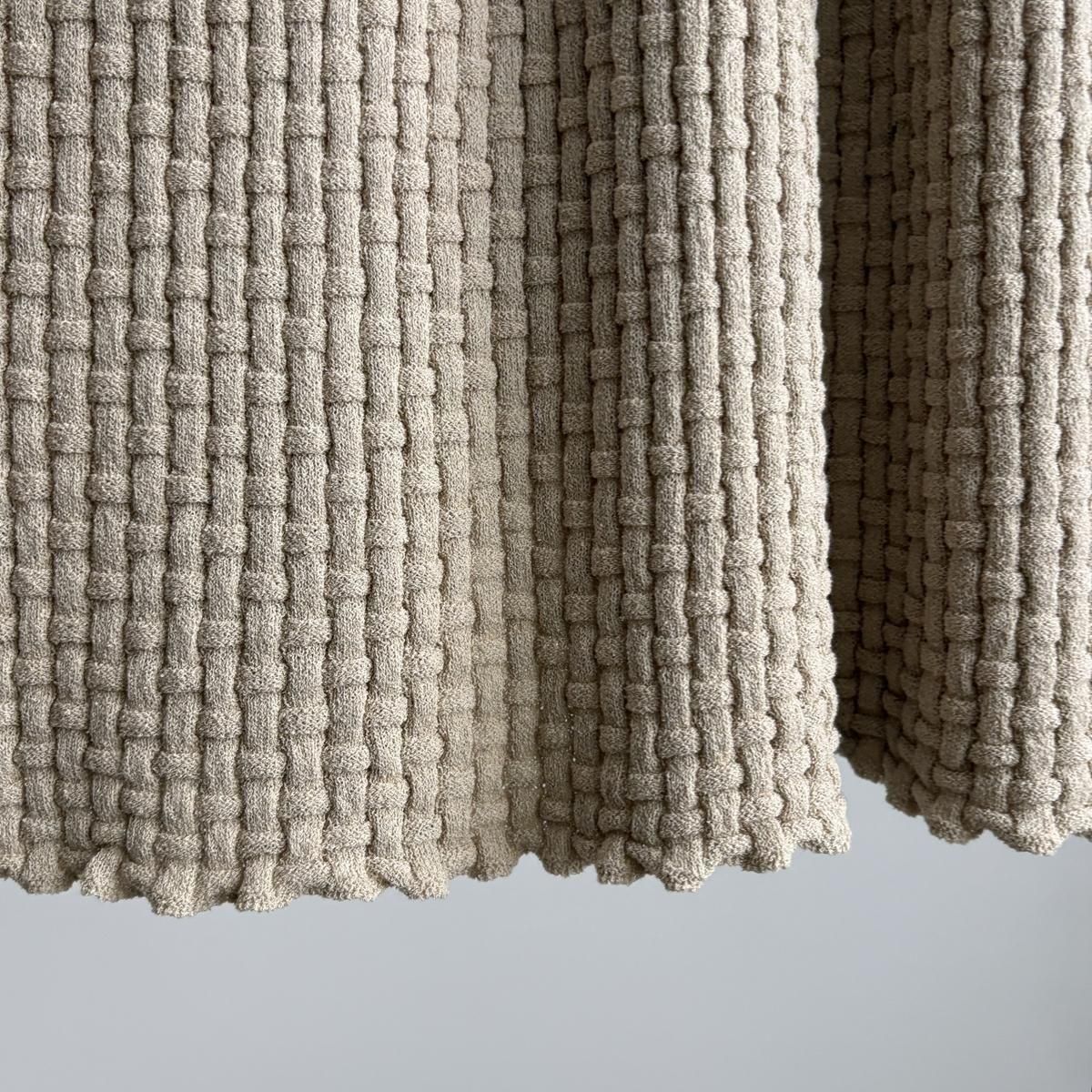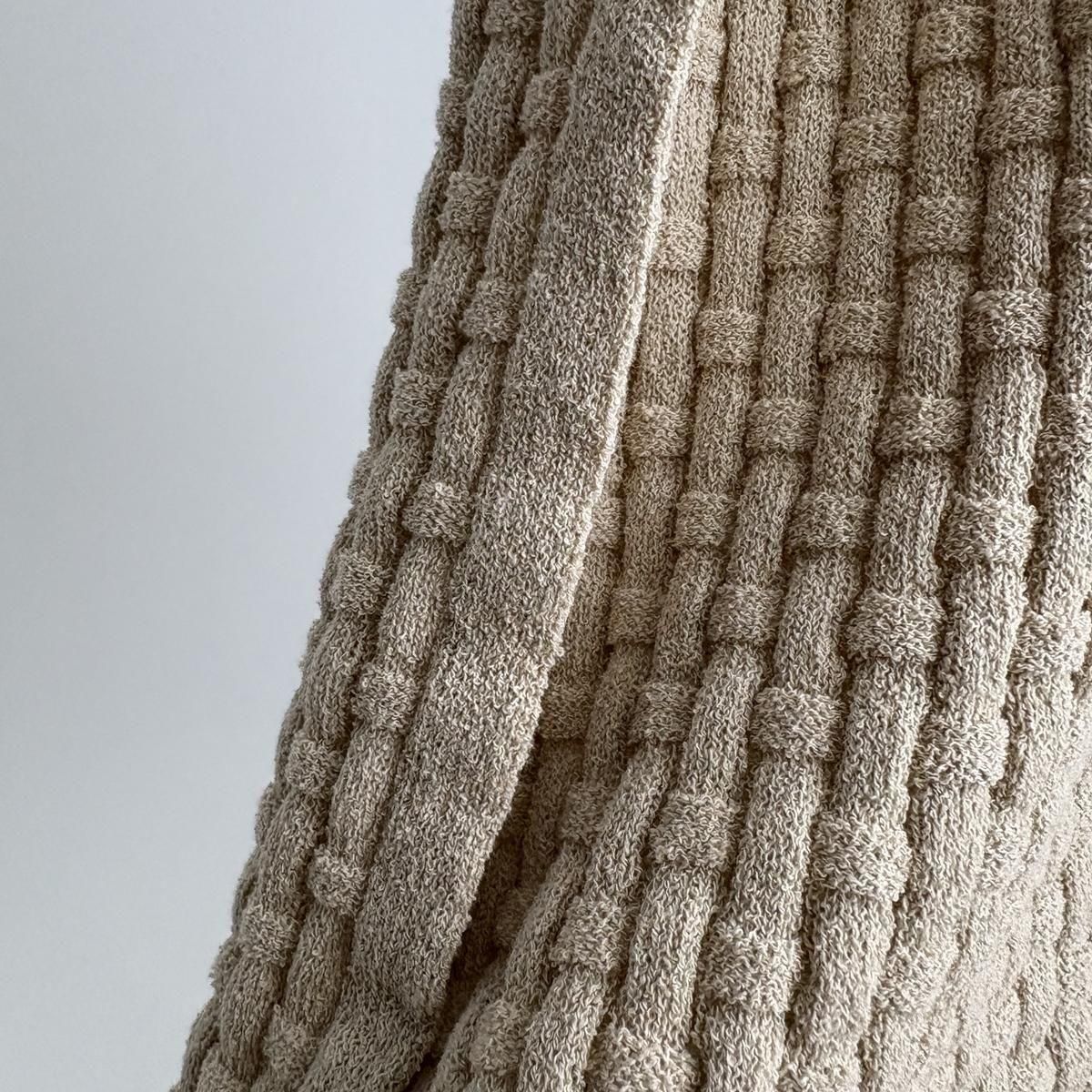 ありそうでない凝った凹凸のある編み柄は籠模様をイメージされています。ウエスト下あたりからの模様の切り替えなど、細かなディテールにも注目です。