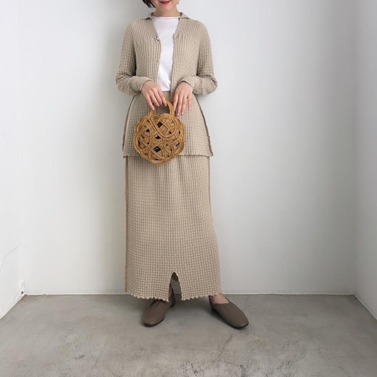 Oni050/Oni051のトップスと合わせるとセットアップになり、より洗練された着こなしもお楽しみいただけます。もちろん単体ではロング丈のニットスカートは大人っぽさもありつつ、他にない編柄の表情が雰囲気たっぷりです。そして意外にも何でもマッチしてしまう懐の深さがあります。