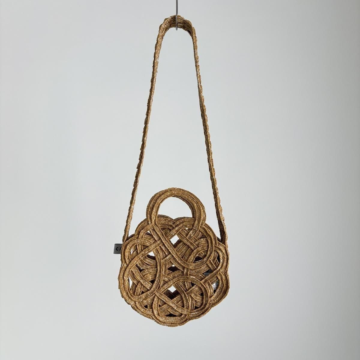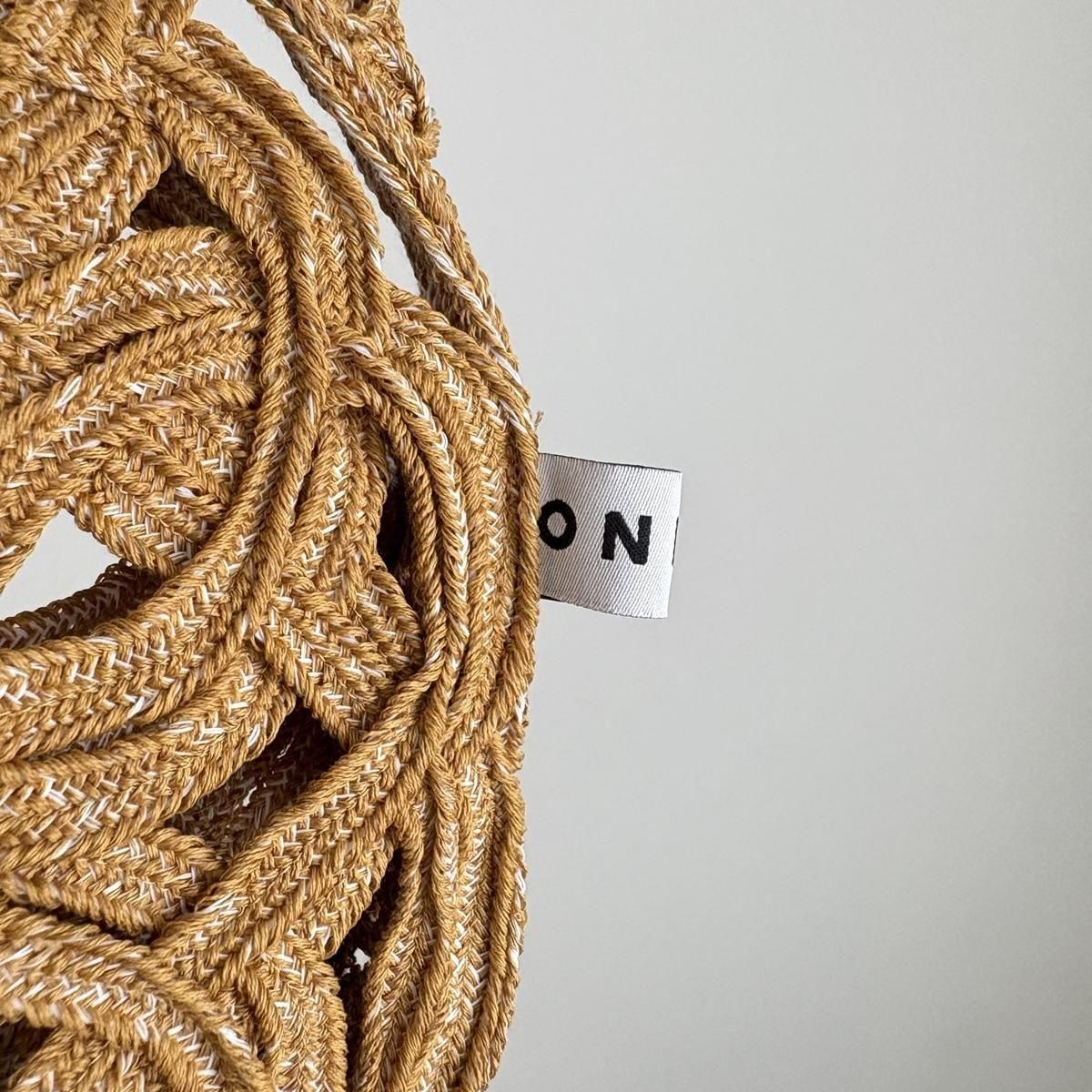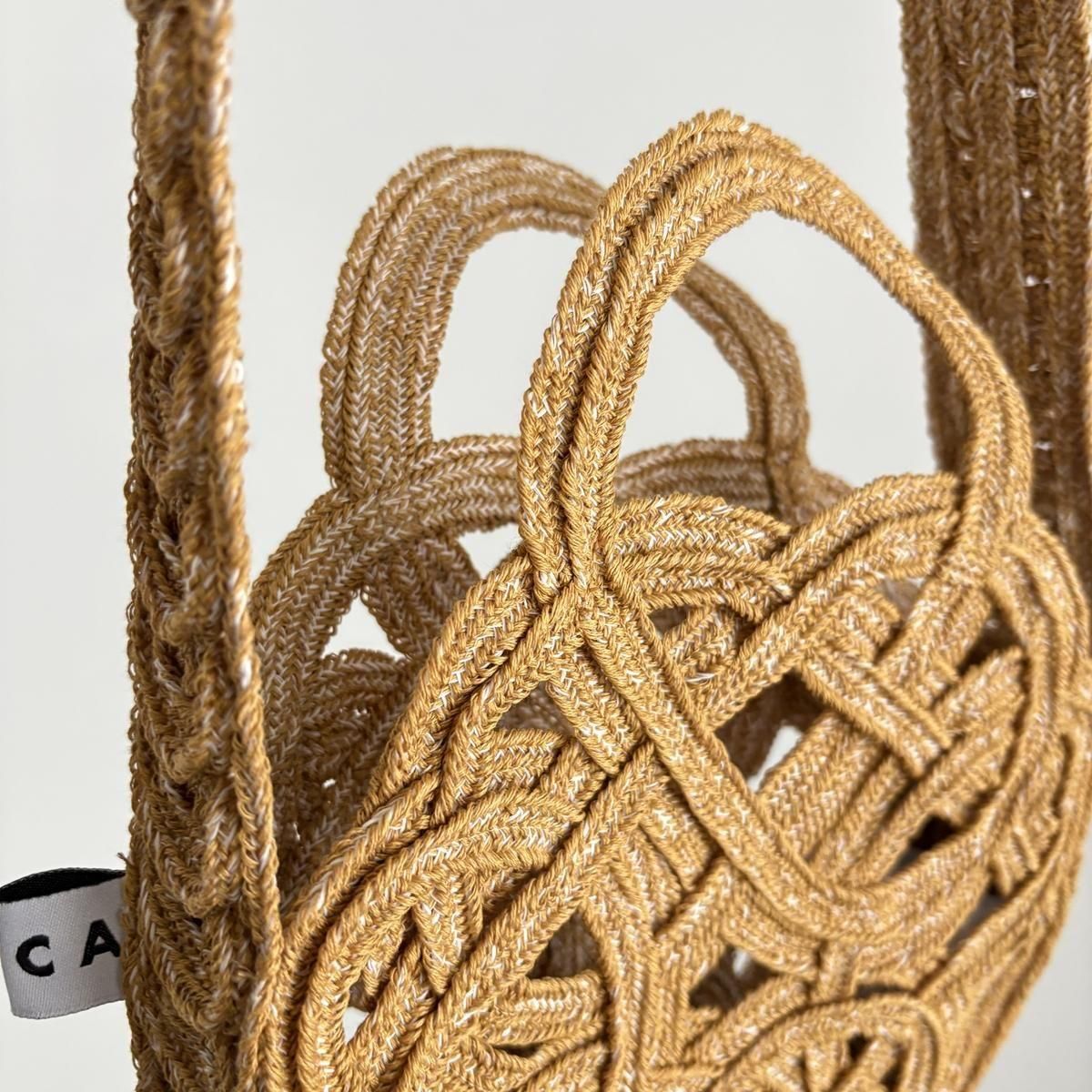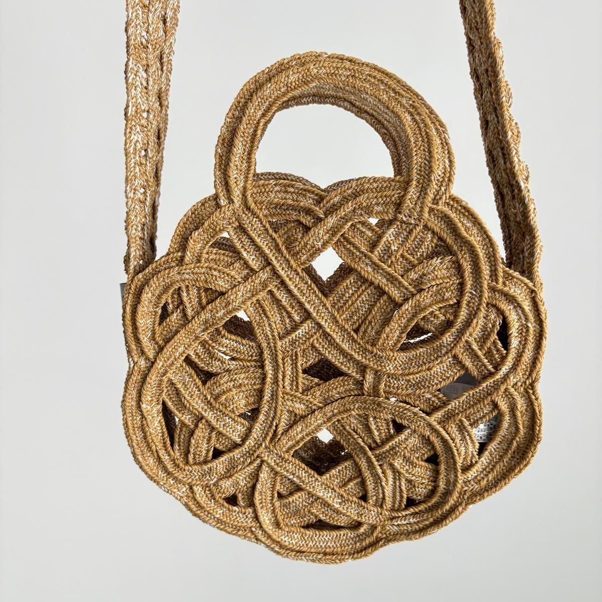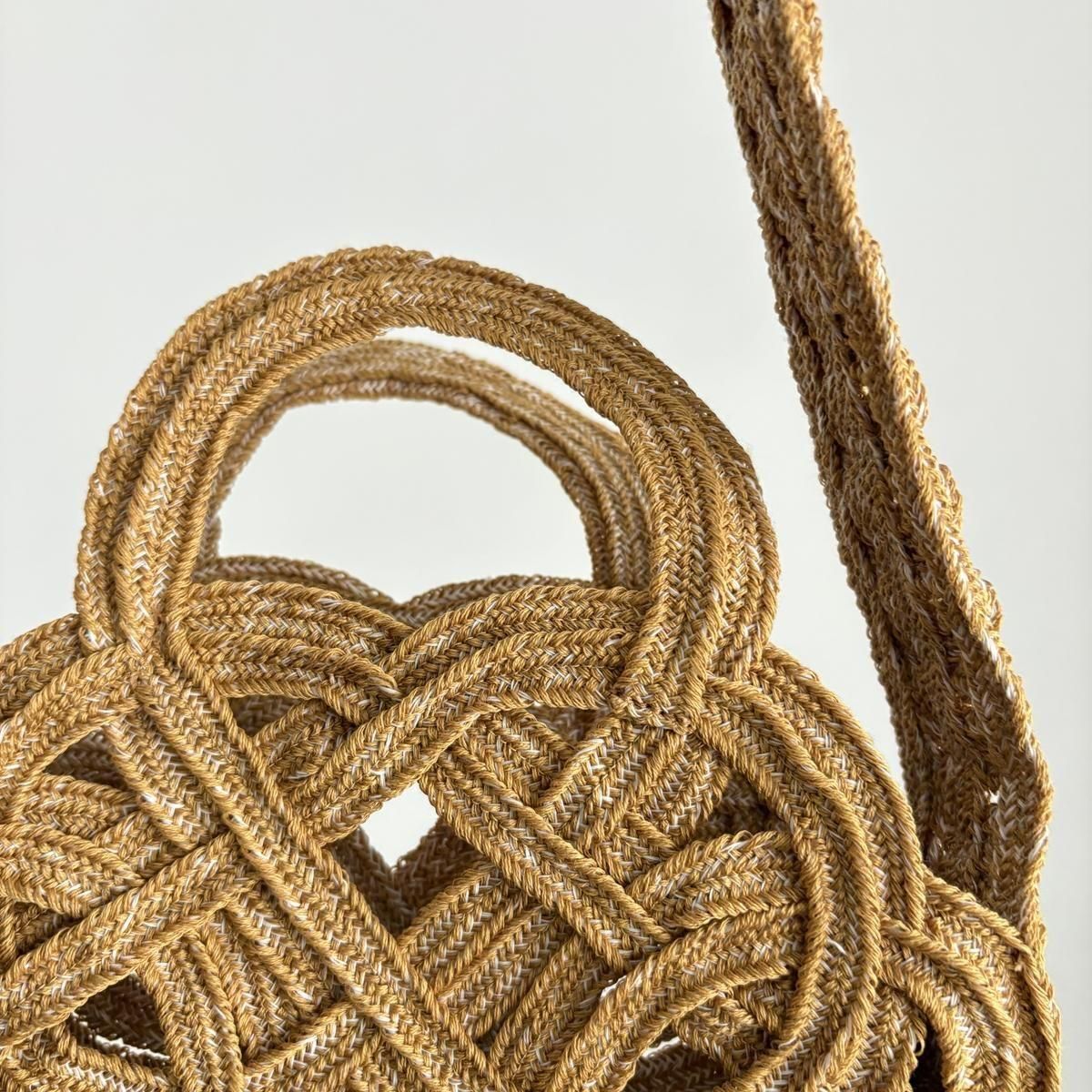 擬麻加工(国産コンニャク由来の樹脂を糸に扁平上糊付けする、日本に古くから伝わる人体や環境にやさしい天然加工)を施した綿糸と熱硬化糸を合わせてオリジナルのコードを編み、マチ付きのバッグに仕立てられています。他の加工では得られない軽やかでさわやかな風合いが魅力です。