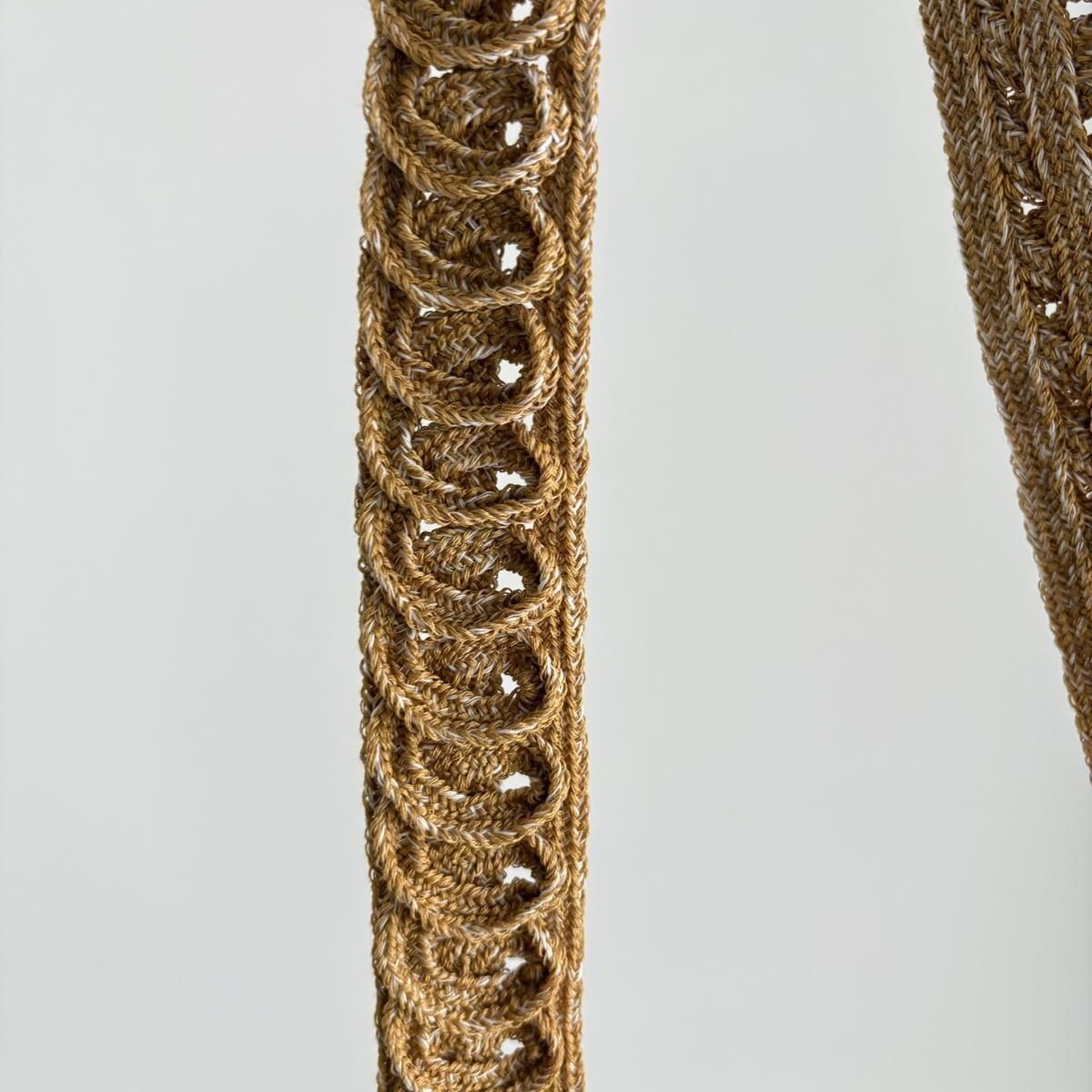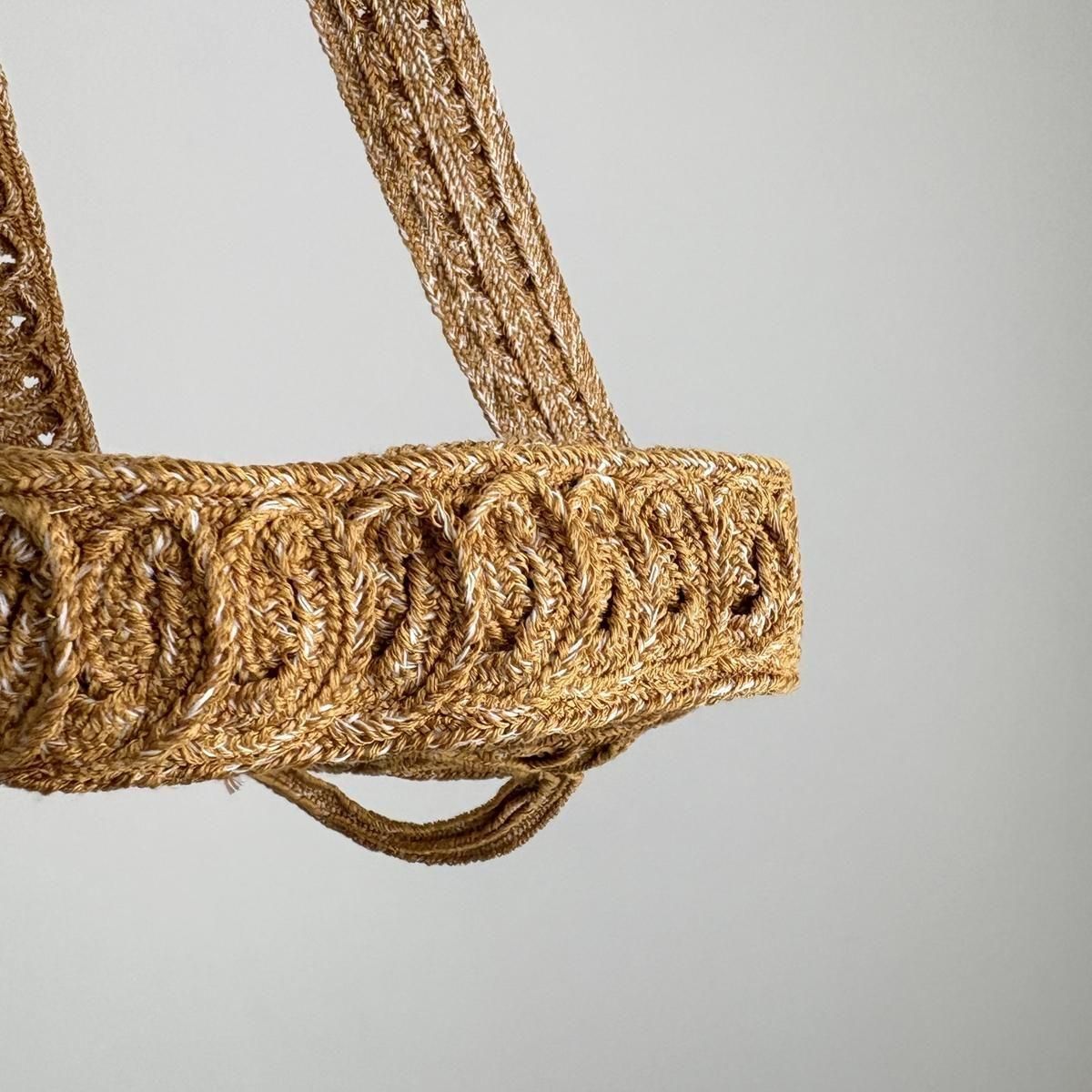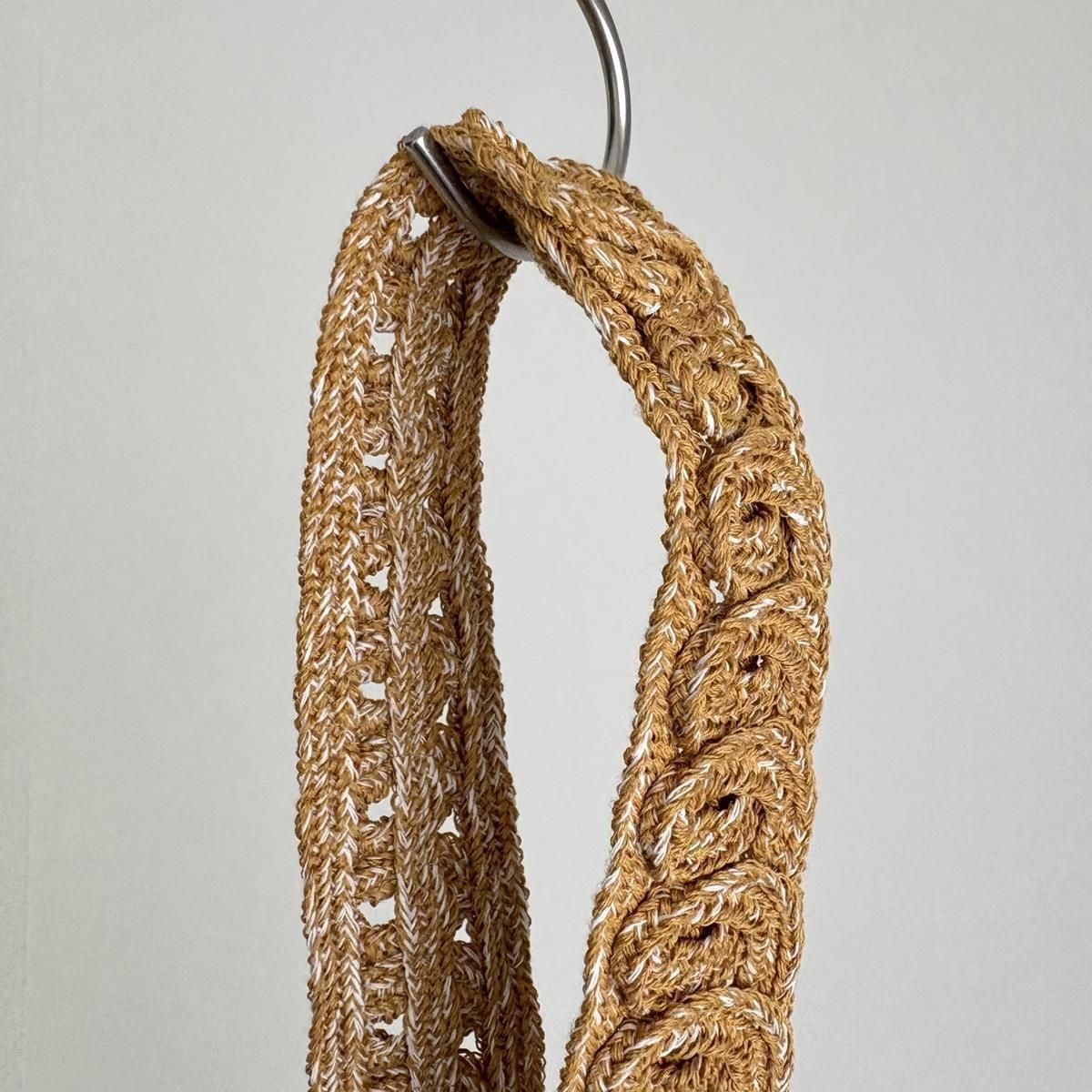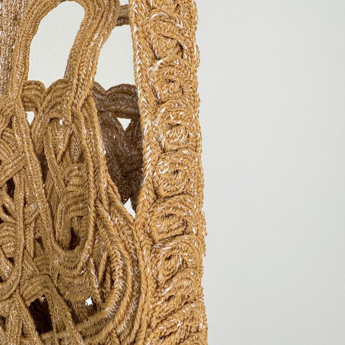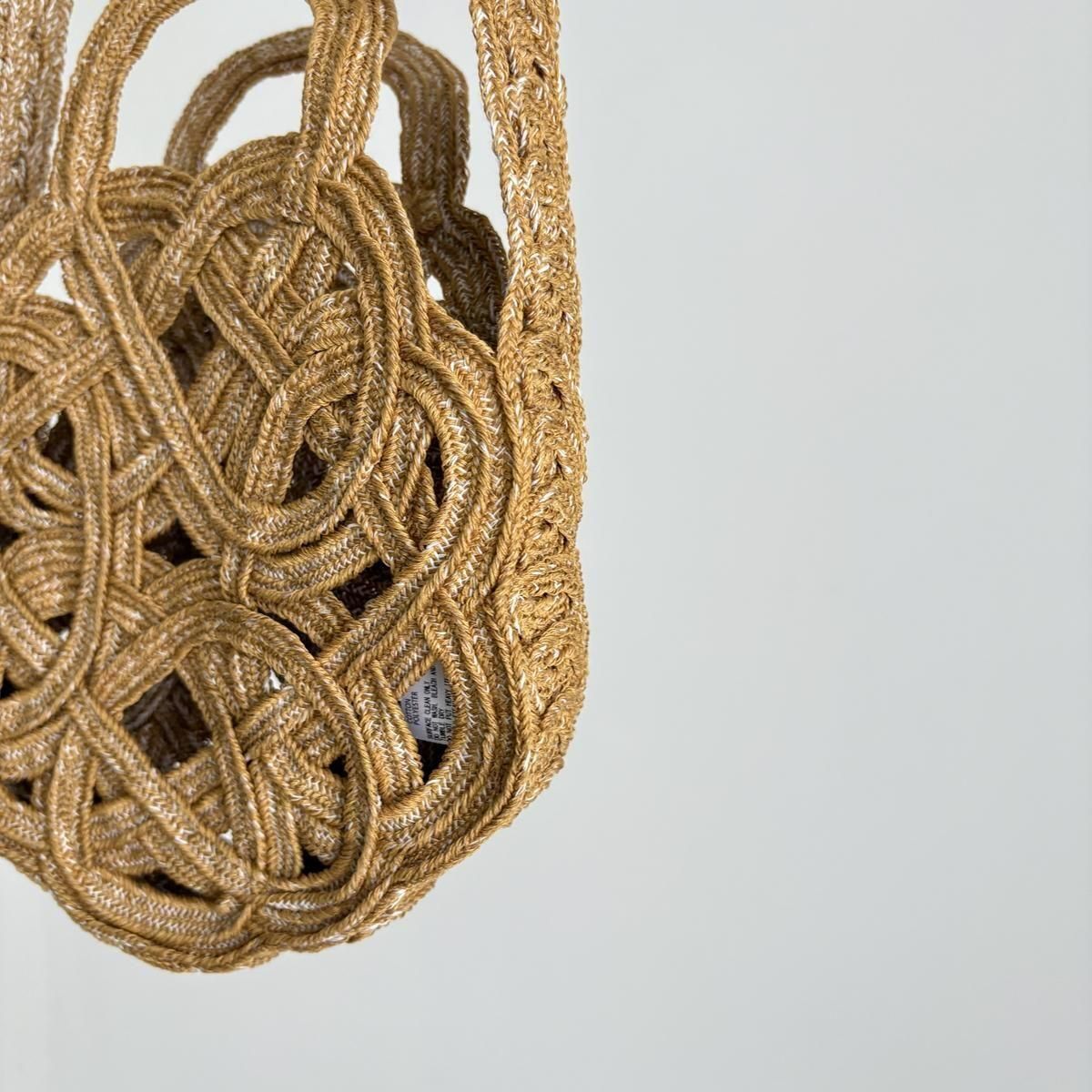 擬麻加工(国産コンニャク由来の樹脂を糸に扁平上糊付けする、日本に古くから伝わる人体や環境にやさしい天然加工)を施した綿糸と熱硬化糸を合わせてオリジナルのコードを編み、マチ付きのバッグに仕立てられています。他の加工では得られない軽やかでさわやかな風合いが魅力です。
