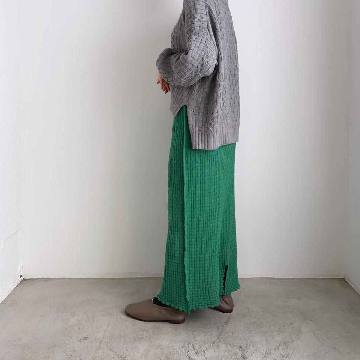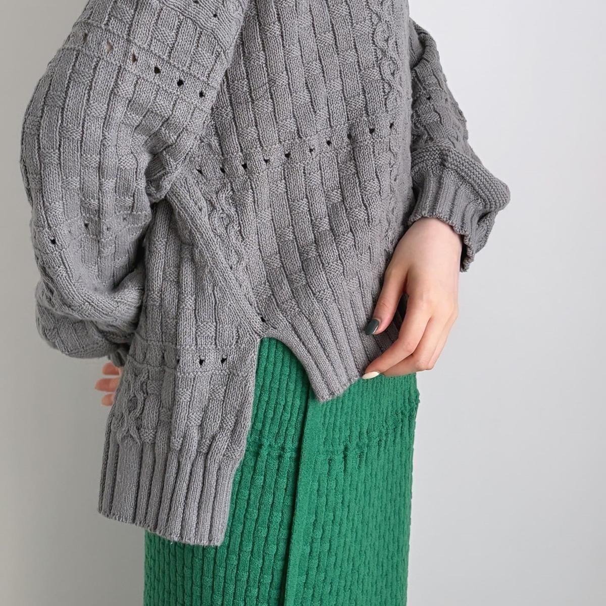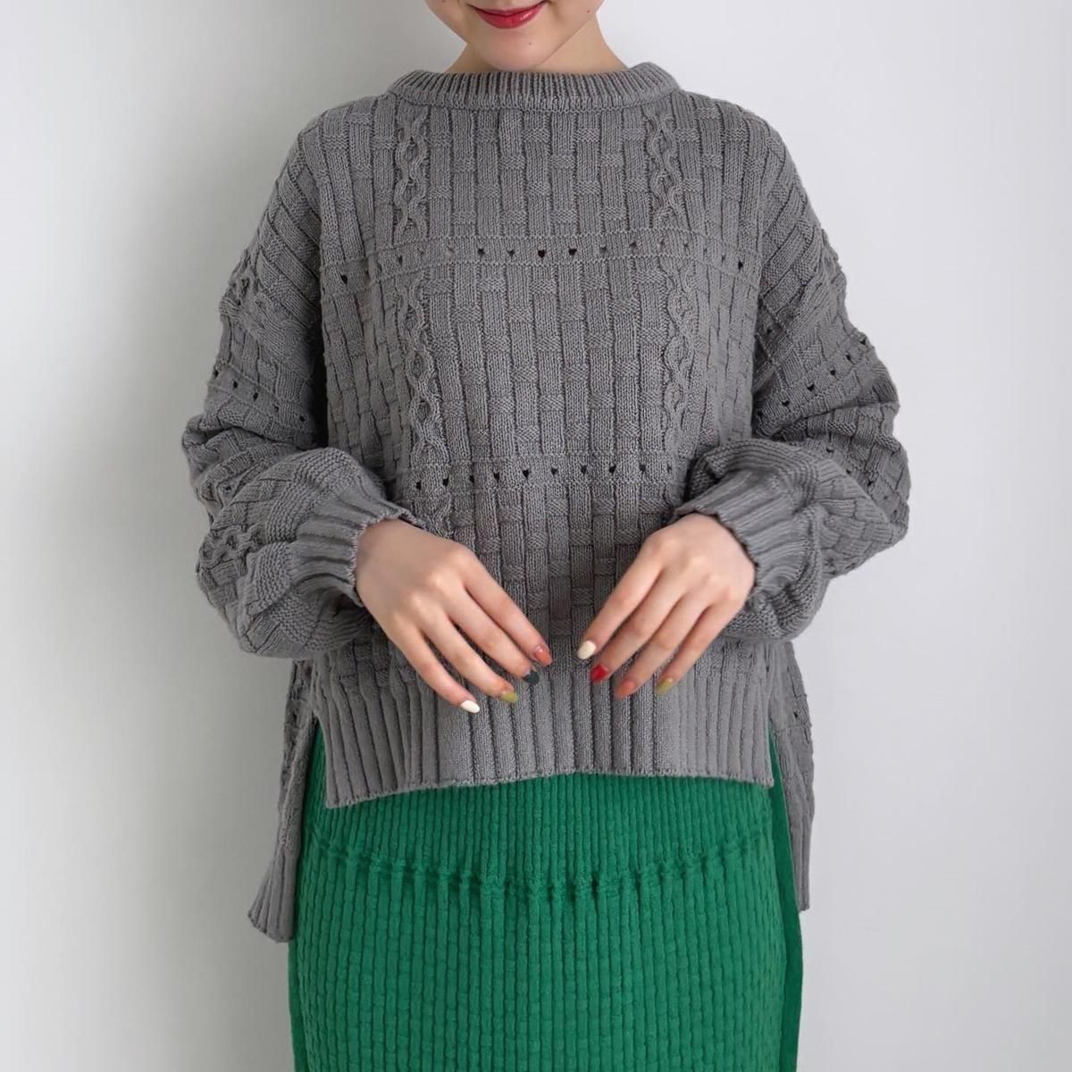 裾のシルエットがきれいに仕上がるように、脇線を前にもってきて前後差のある着丈にしあげれています。フロントの丈感がすっきりとしているので、小柄な方もバランス良く着られニットです。