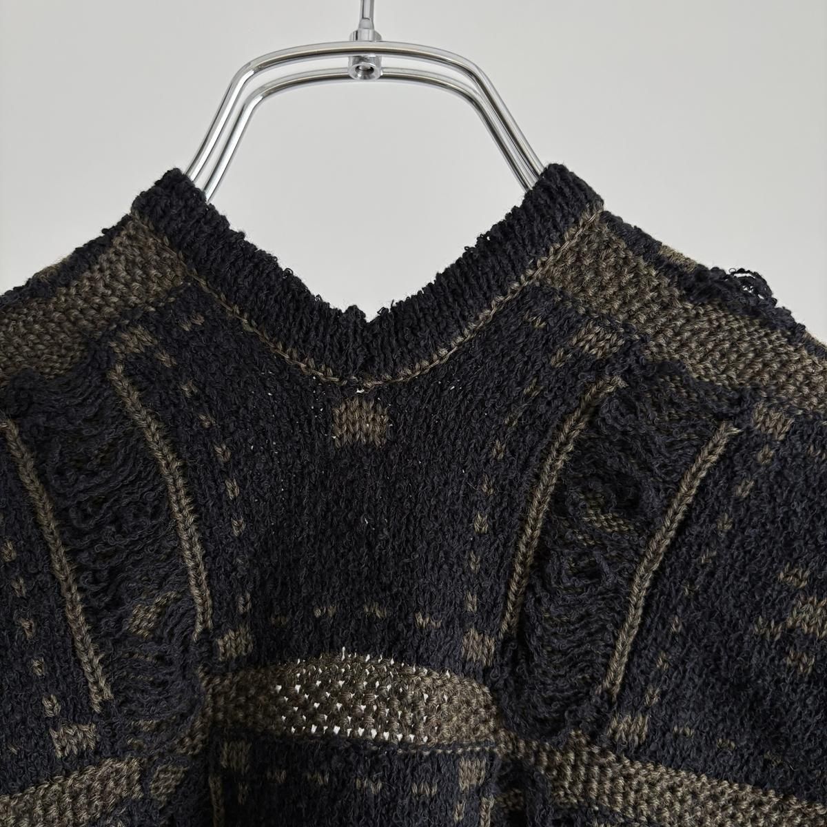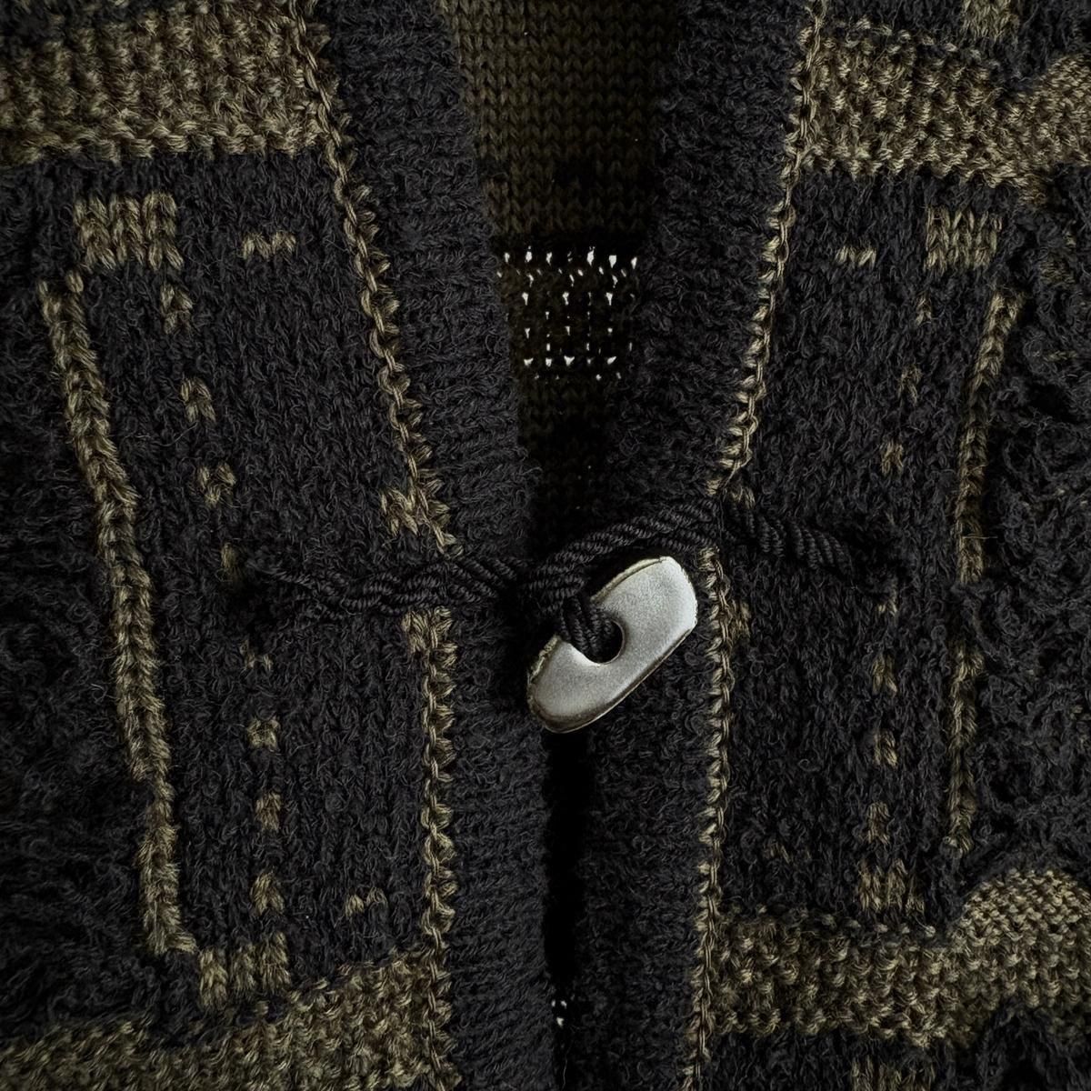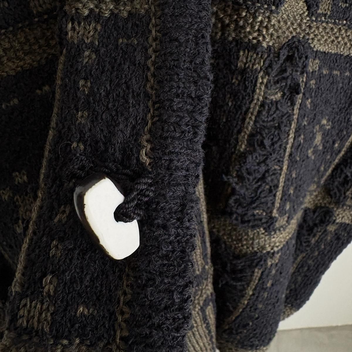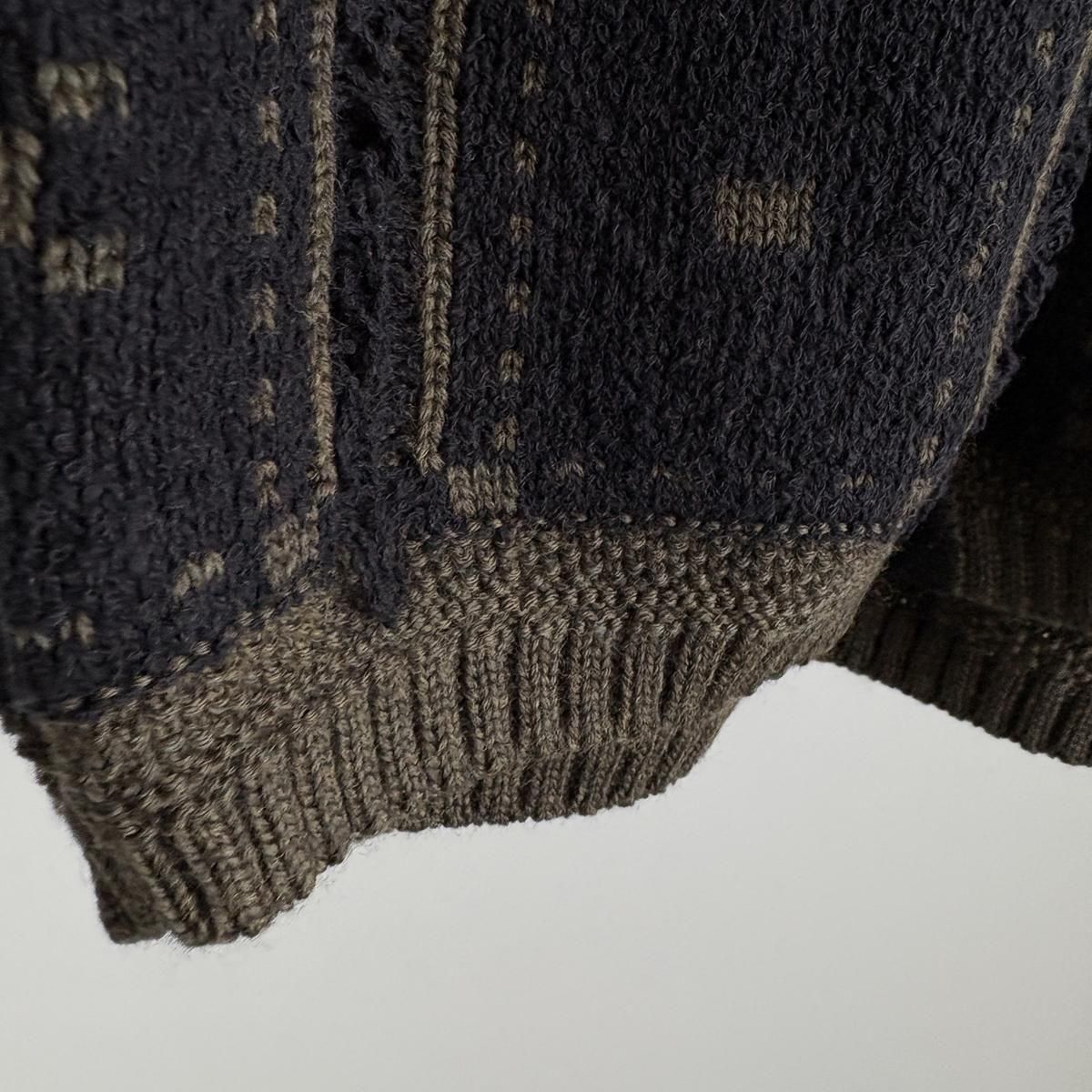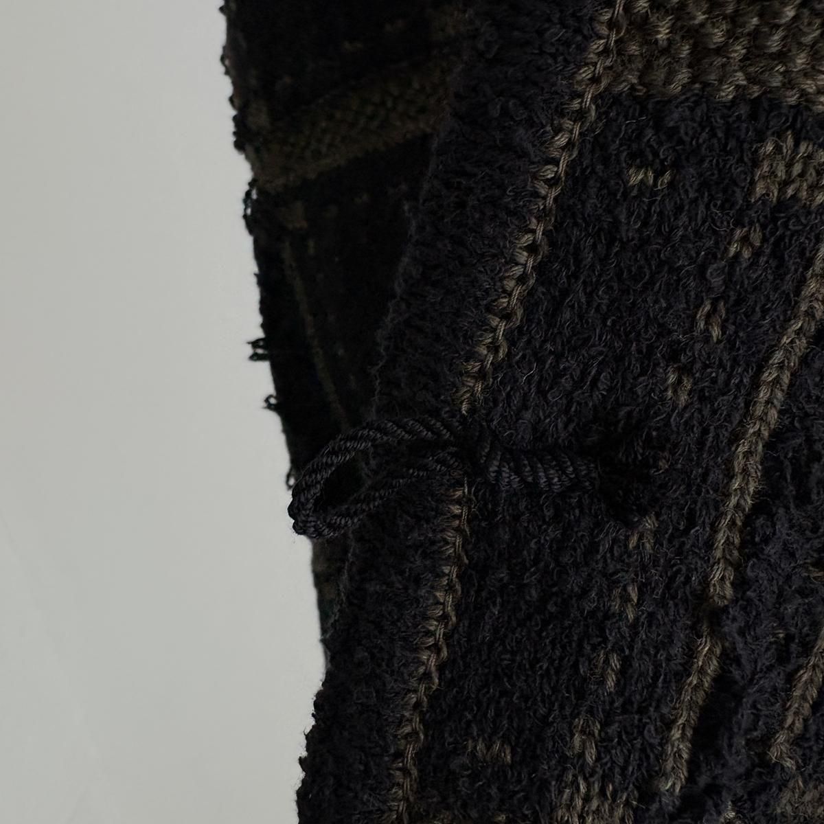 産毛のように柔らかなネップ上の高級綿糸と、柔軟性と弾力を併せ持つメリノ由来のウール糸を使用して質感を感じるブロック柄が編まれています。ひと目見てわかるこだわりたっぷりのオリジナル柄。
