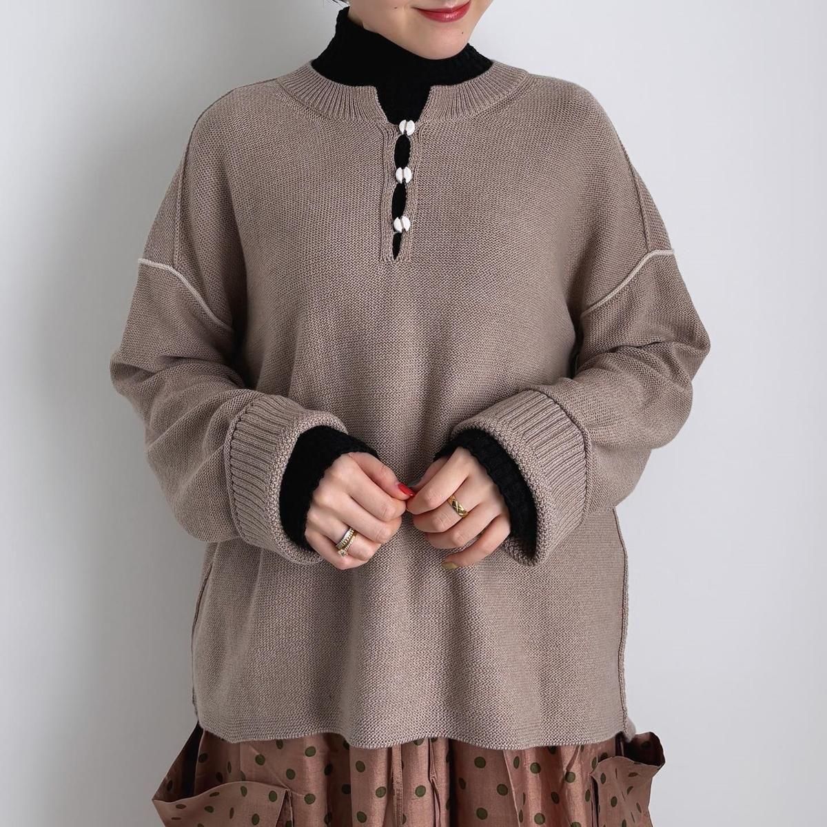 お袖は折り返しての着用でぜひ!内側のかなこ編みの編み柄をちらりと見せて、そのチラッと感がかわいらしいのでロールアップさせての着こなしがおすすめです。