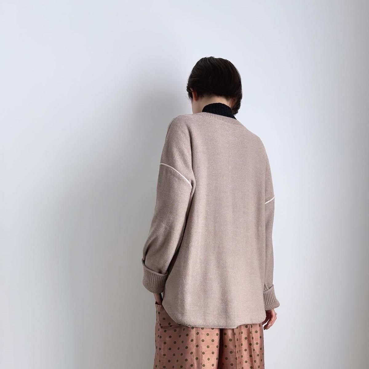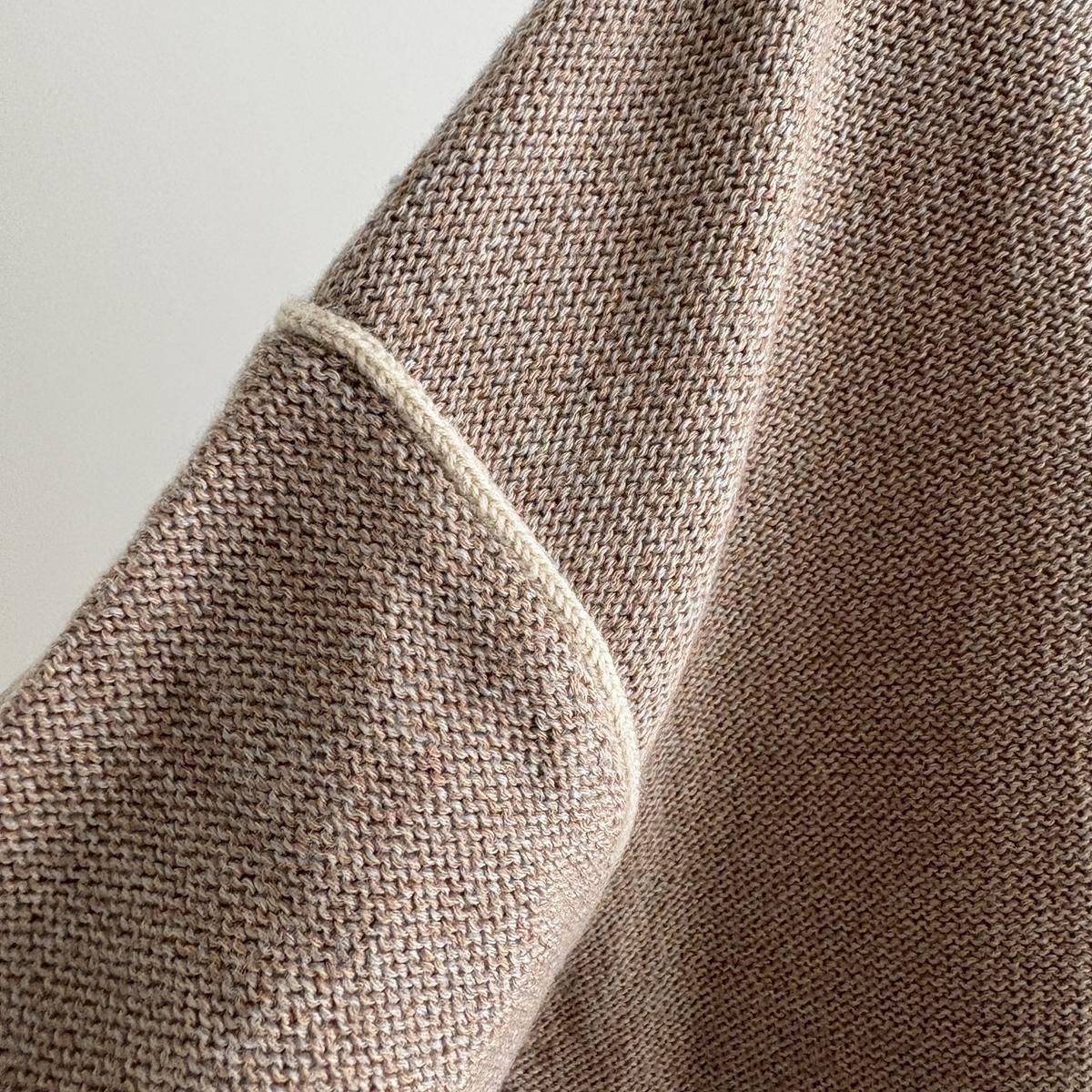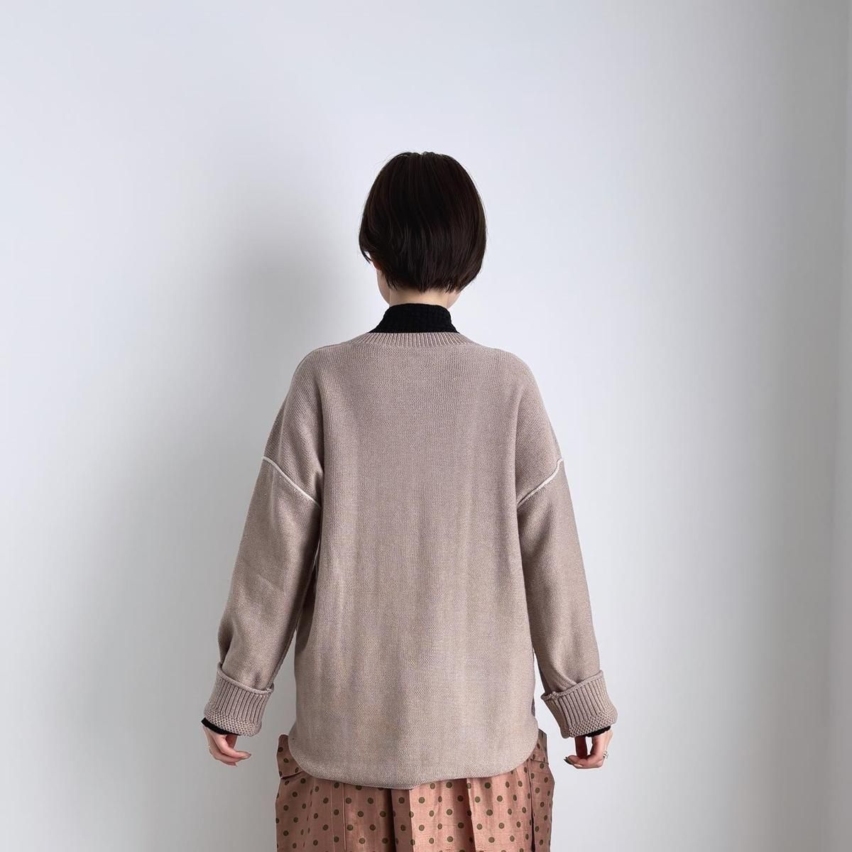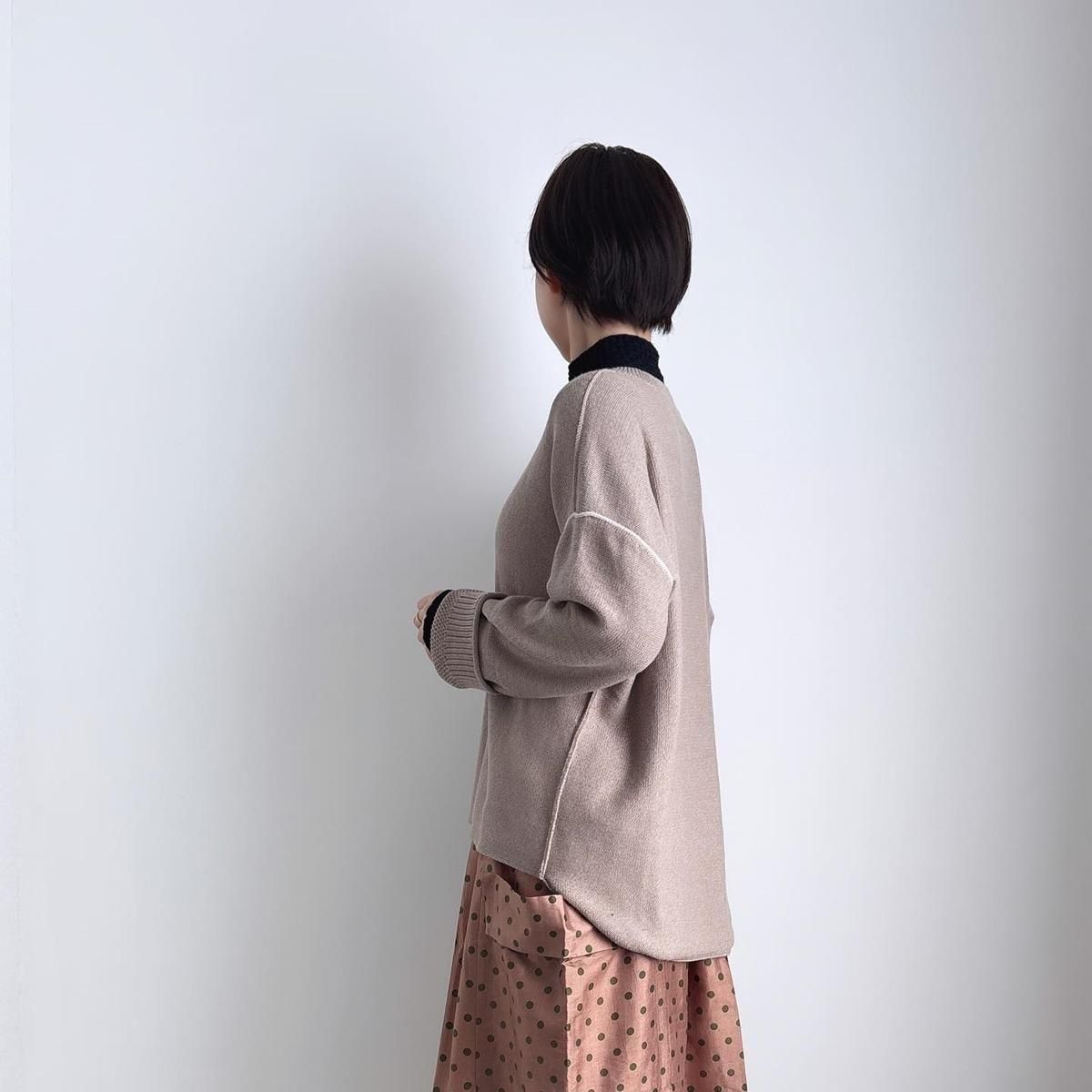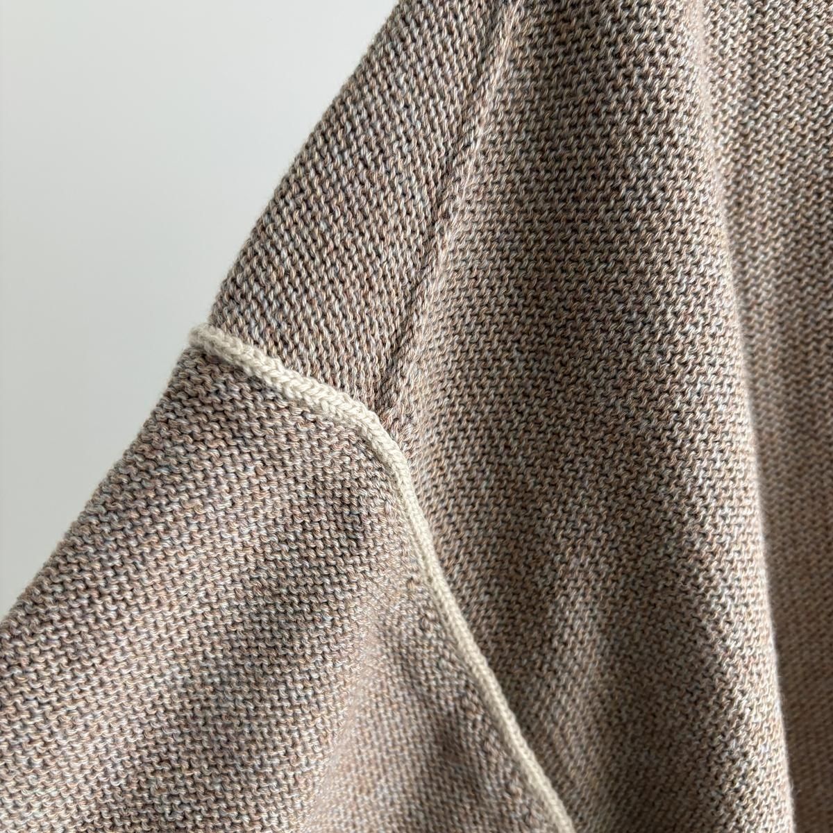 着た時のシルエットの良さも計算され設計されています!後ろ裾をラウンドさせて少し長めに編まれていて、フロントはすっきりとした着丈に仕上がっているので小柄な方が着ても、絶妙なバランスで雰囲気良く着られます。編み端の表情がかわいらしかったということで、脇やお袖は外接ぎにされたとのこと、、、そういった細かなニュアンスがたまらなく愛おしいです。