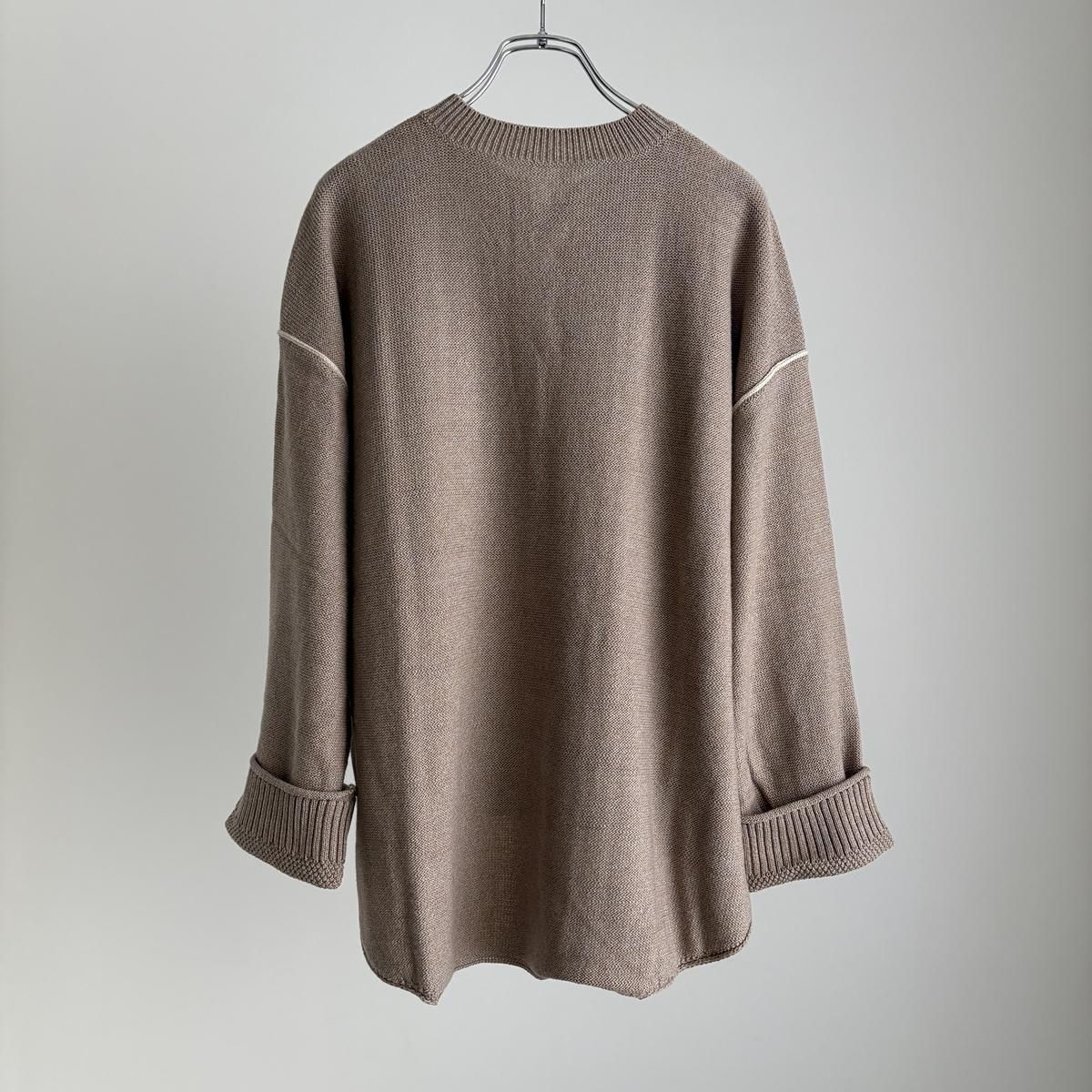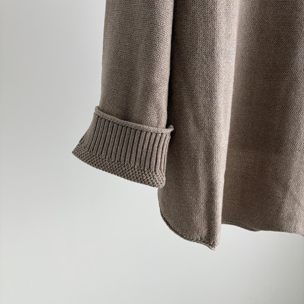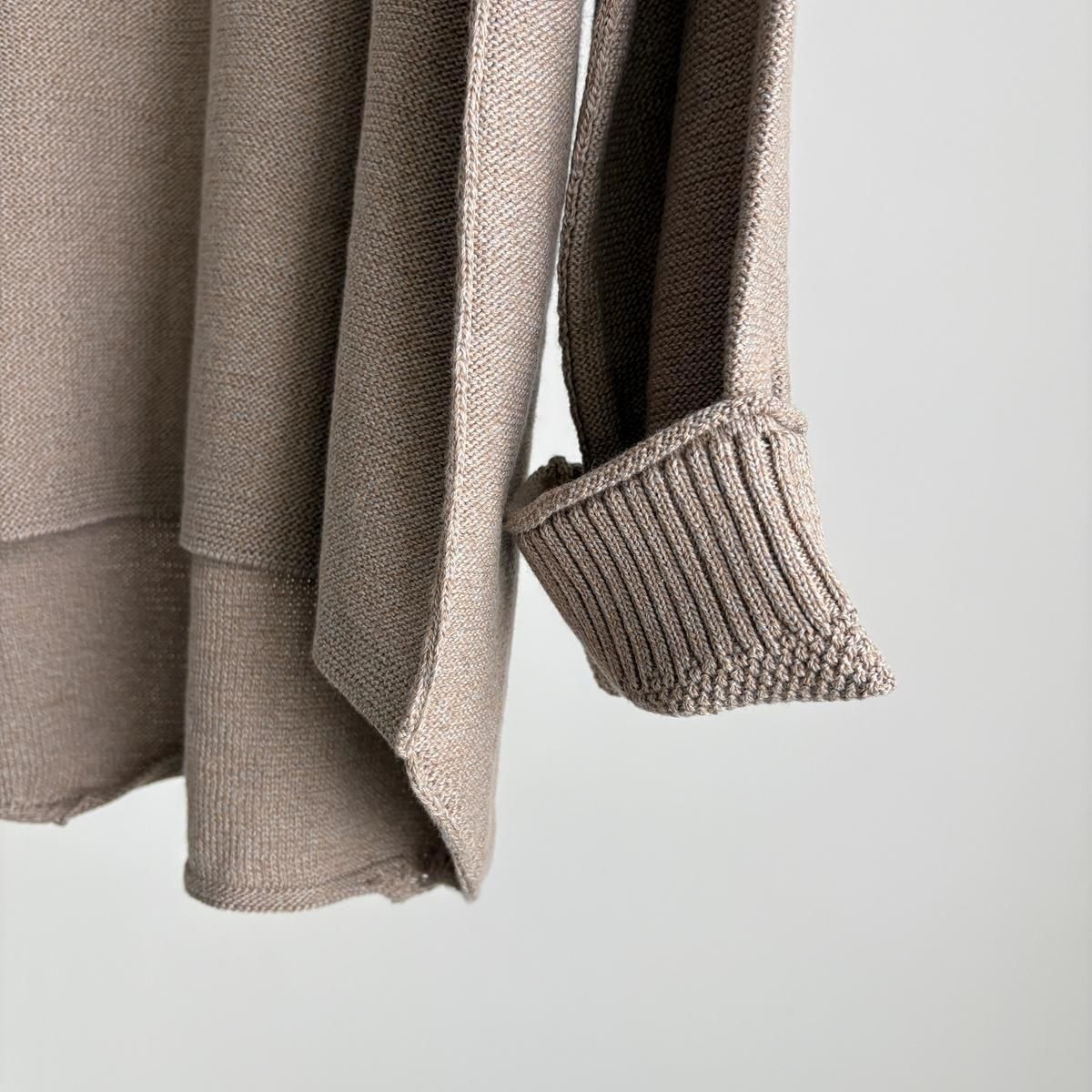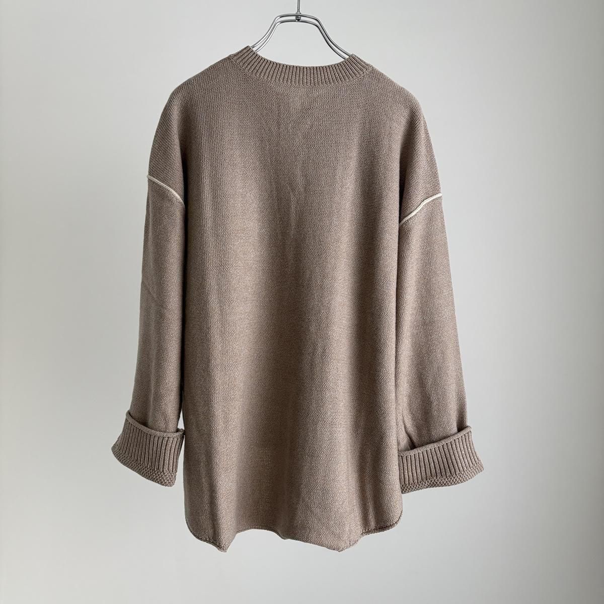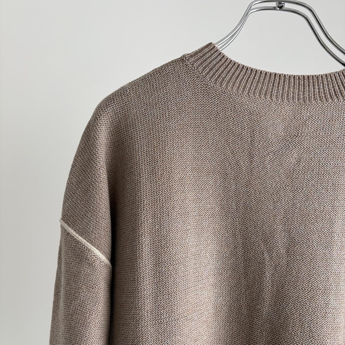着た時のシルエットの良さも計算され設計されています!後ろ裾をラウンドさせて少し長めに編まれていて、フロントはすっきりとした着丈に仕上がっているので小柄な方が着ても、絶妙なバランスで雰囲気良く着られます。編み端の表情がかわいらしかったということで、脇やお袖は外接ぎにされたとのこと、、、そういった細かなニュアンスがたまらなく愛おしいです。