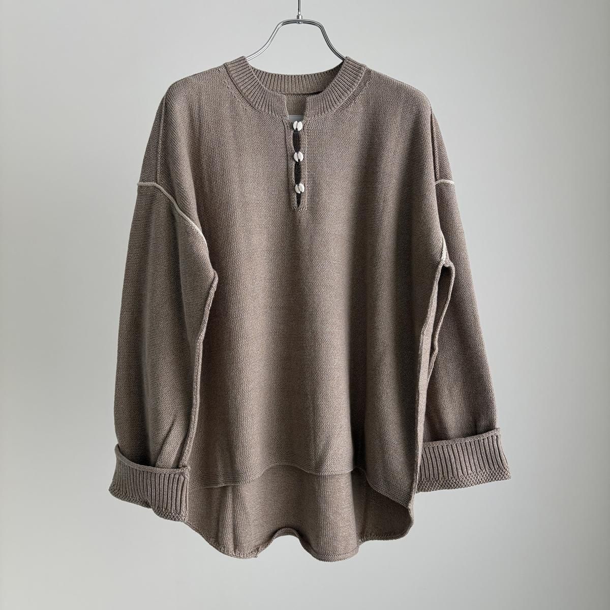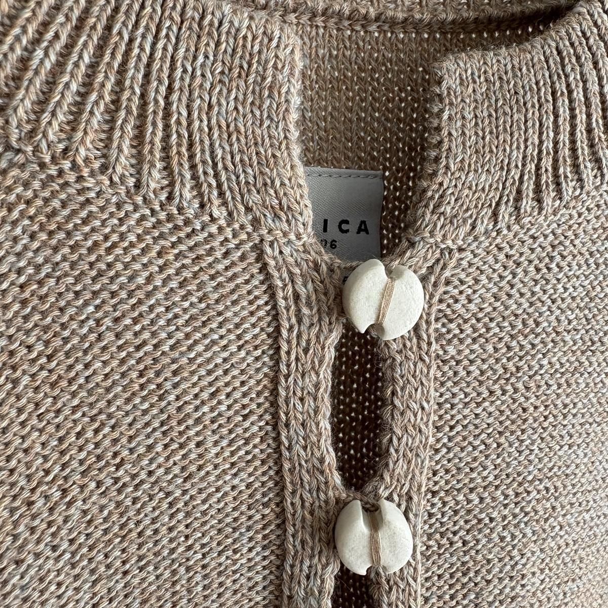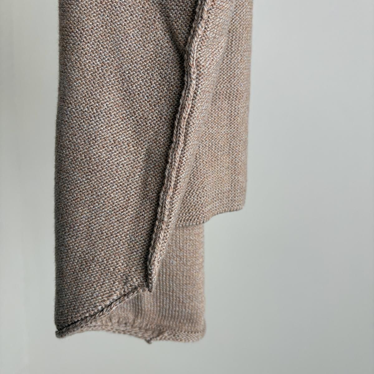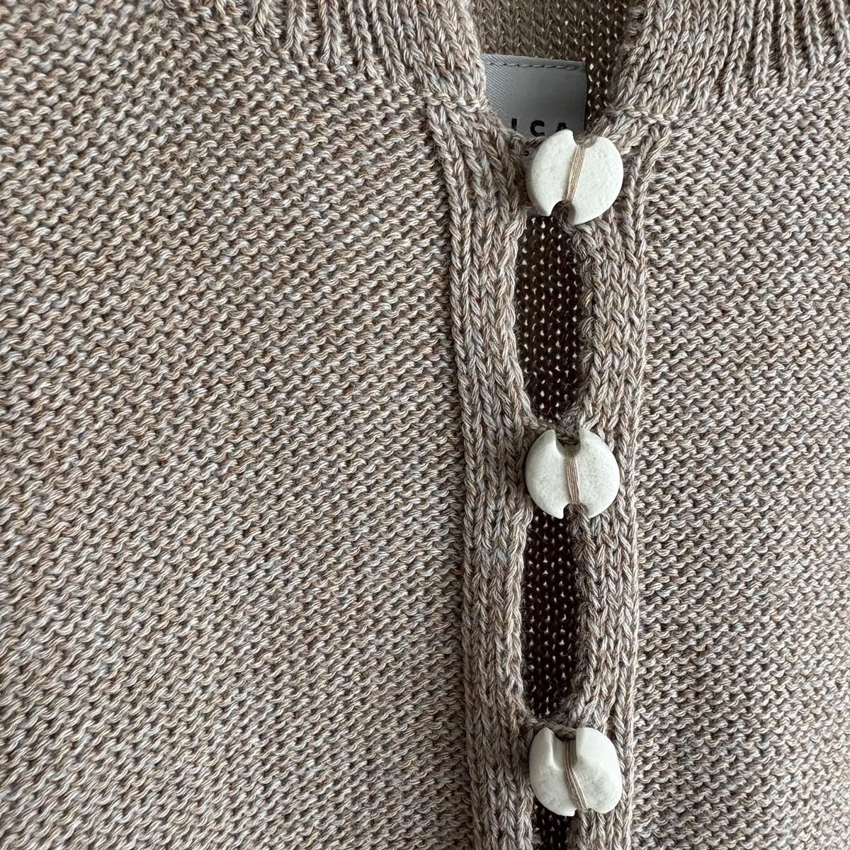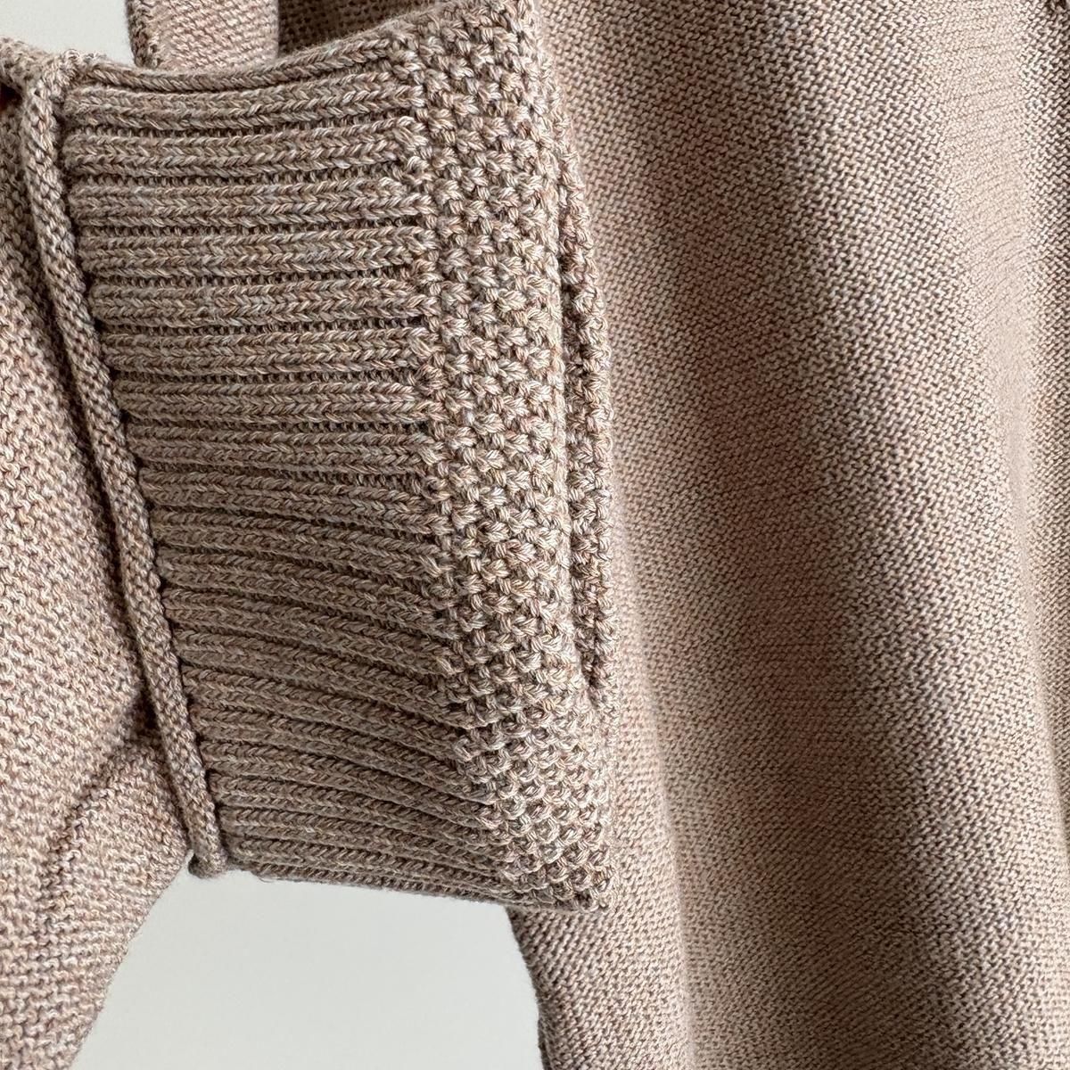着た時のシルエットの良さも計算され設計されています!後ろ裾をラウンドさせて少し長めに編まれていて、フロントはすっきりとした着丈に仕上がっているので小柄な方が着ても、絶妙なバランスで雰囲気良く着られます。編み端の表情がかわいらしかったということで、脇やお袖は外接ぎにされたとのこと、、、そういった細かなニュアンスがたまらなく愛おしいです。