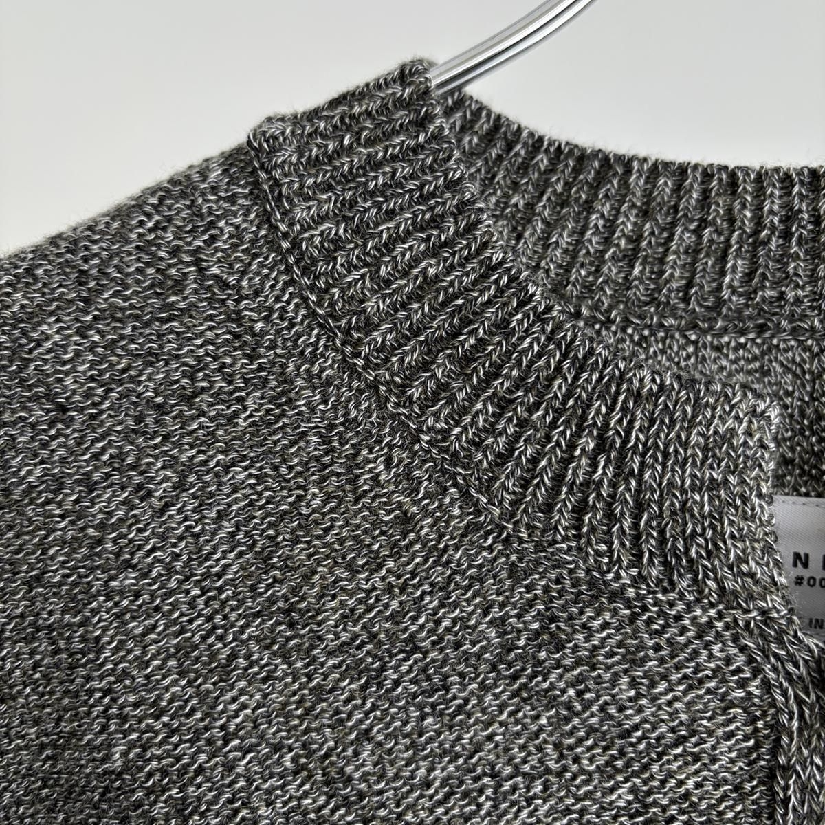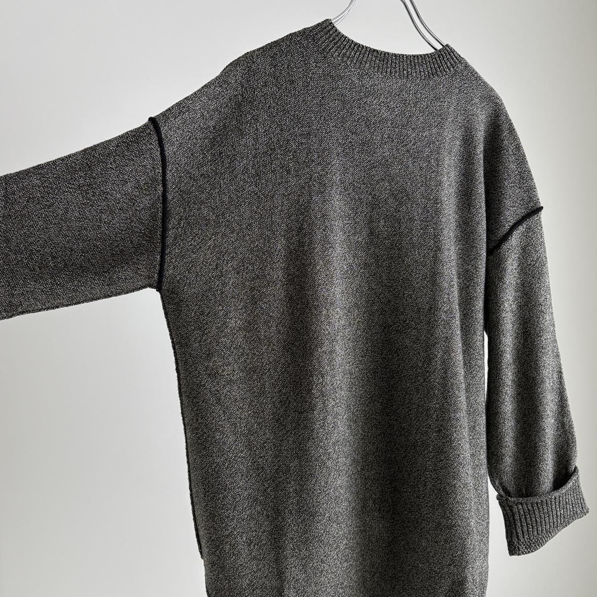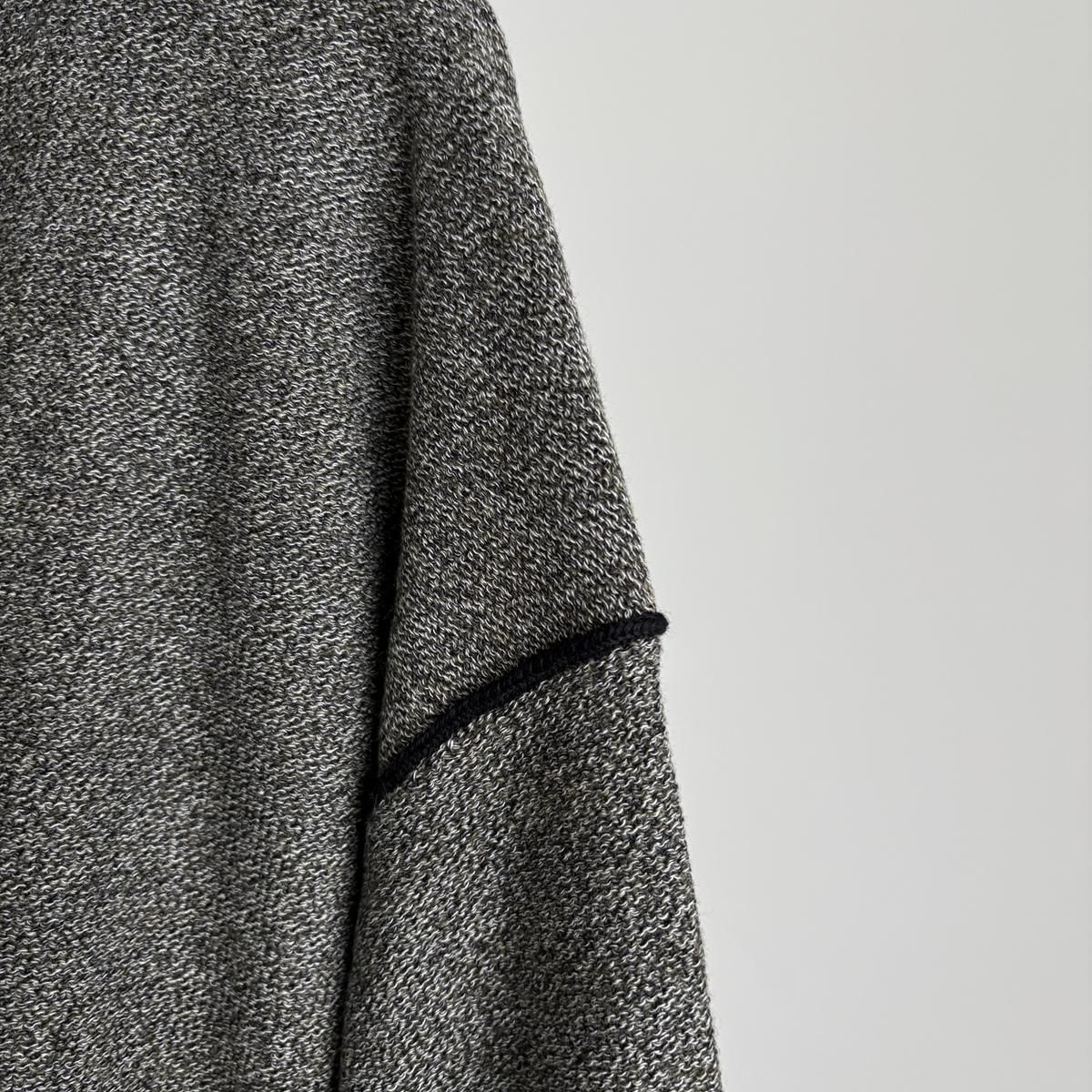 異なる3種類の細糸を複数回より合わせ、奥行きのある繊細な色味の杢糸を作られたとのこと。単色無地とは異なる何とも言えないお色が魅力的。ニットを近くでみていただくとそのお色のニュアンスがよくわかります。