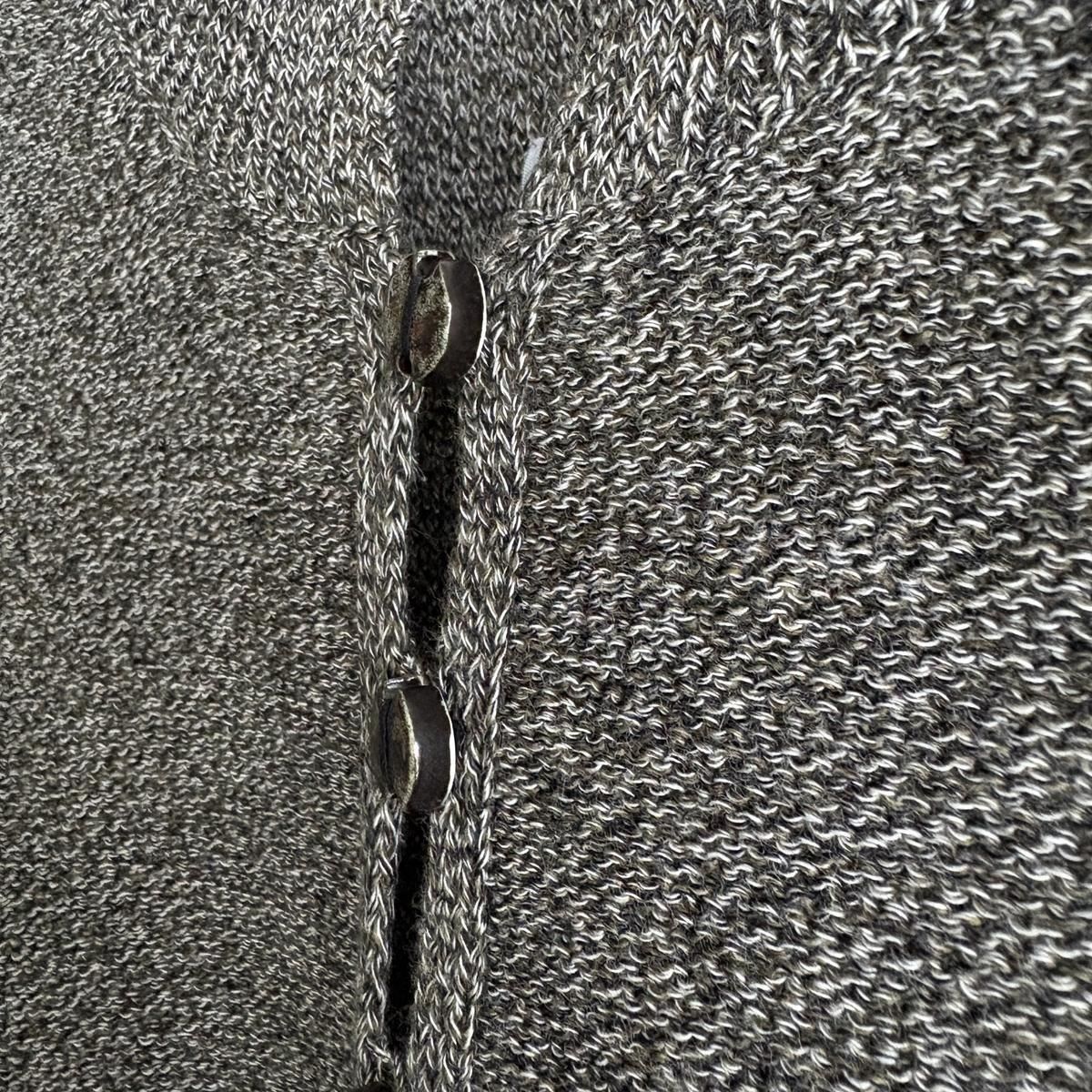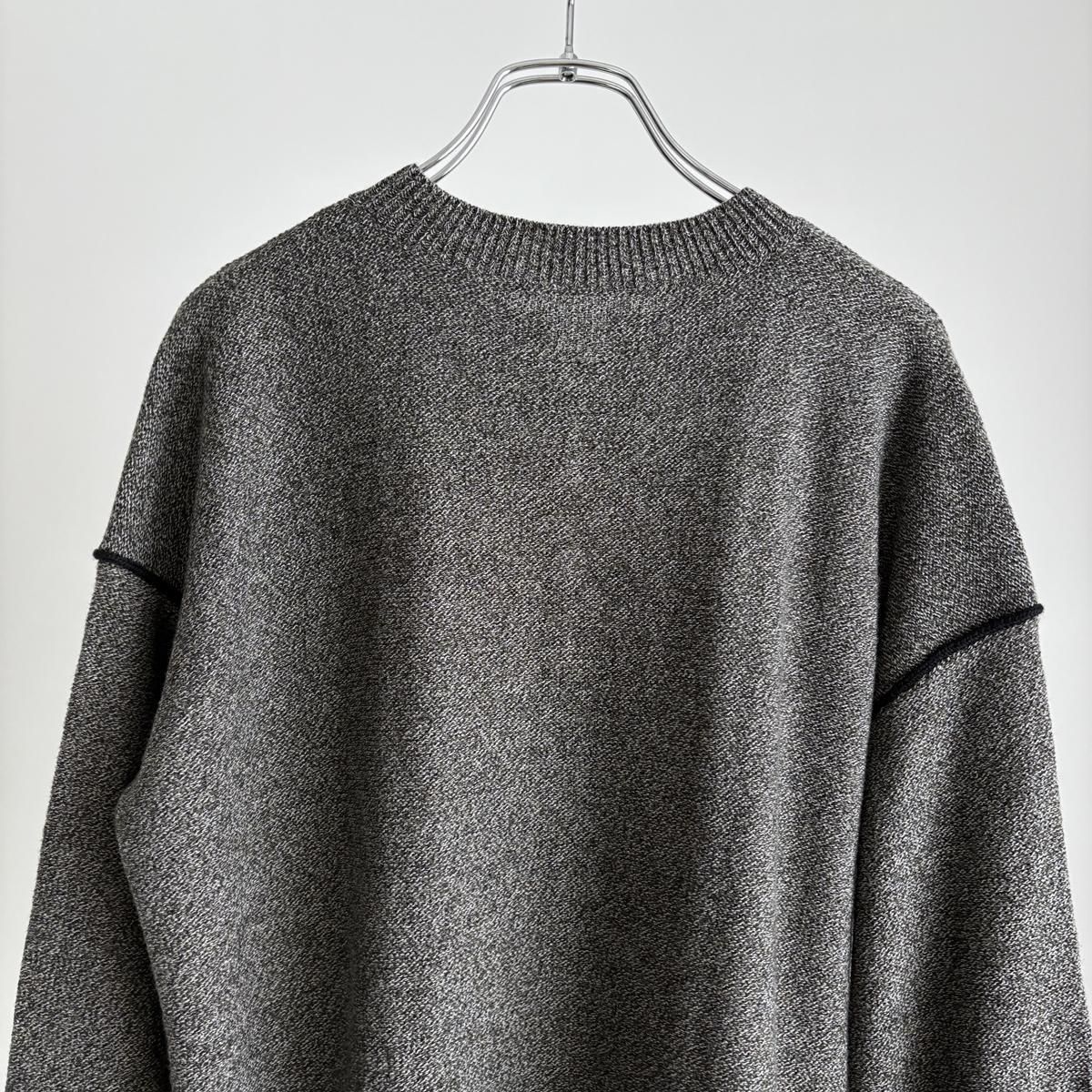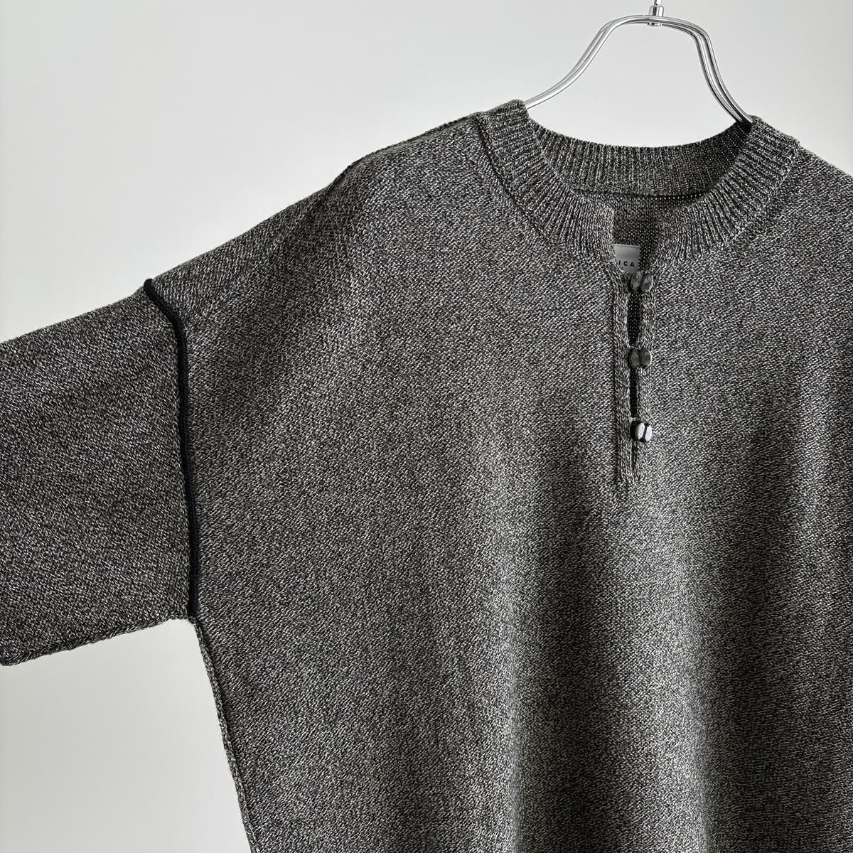 異なる3種類の細糸を複数回より合わせ、奥行きのある繊細な色味の杢糸を作られたとのこと。単色無地とは異なる何とも言えないお色が魅力的。ニットを近くでみていただくとそのお色のニュアンスがよくわかります。