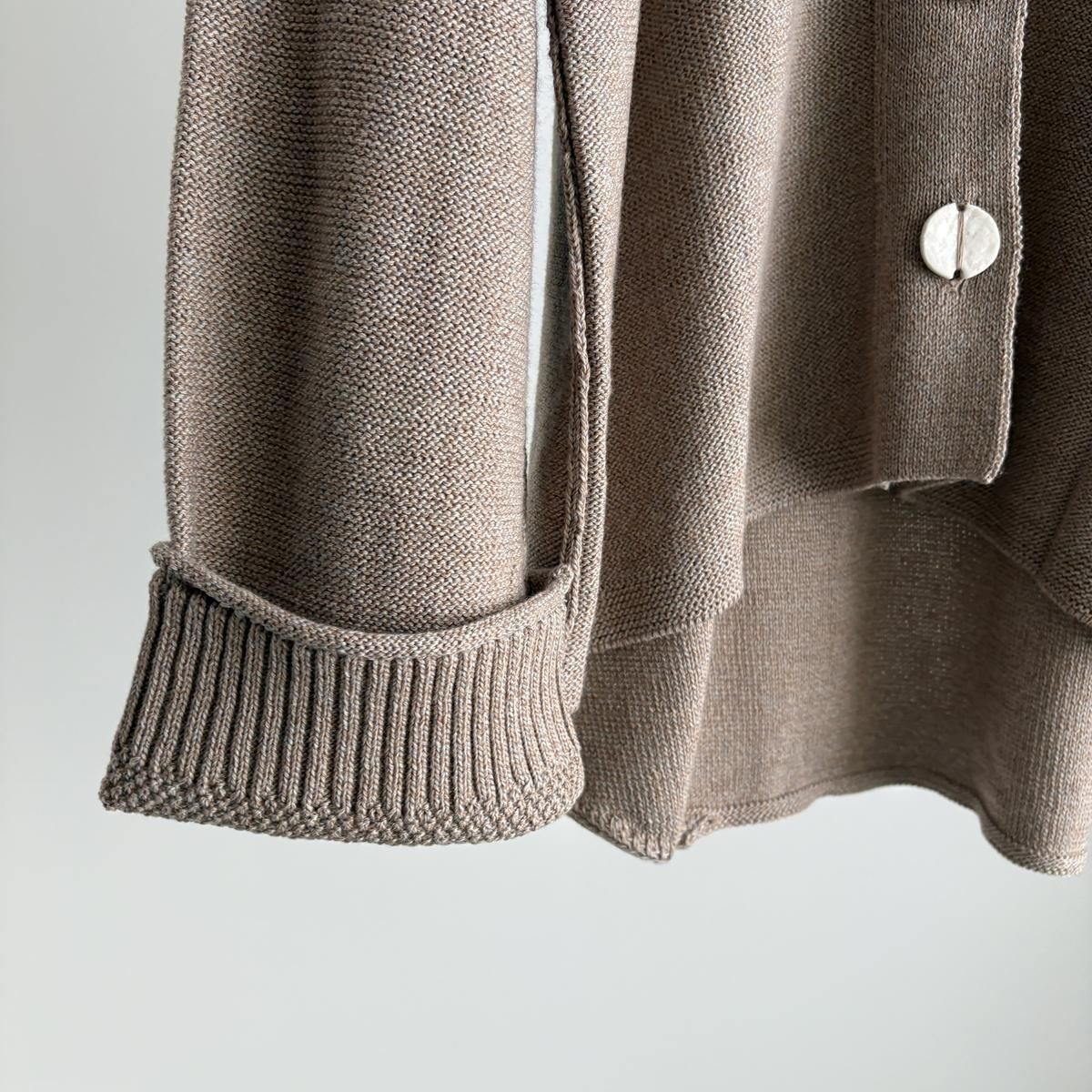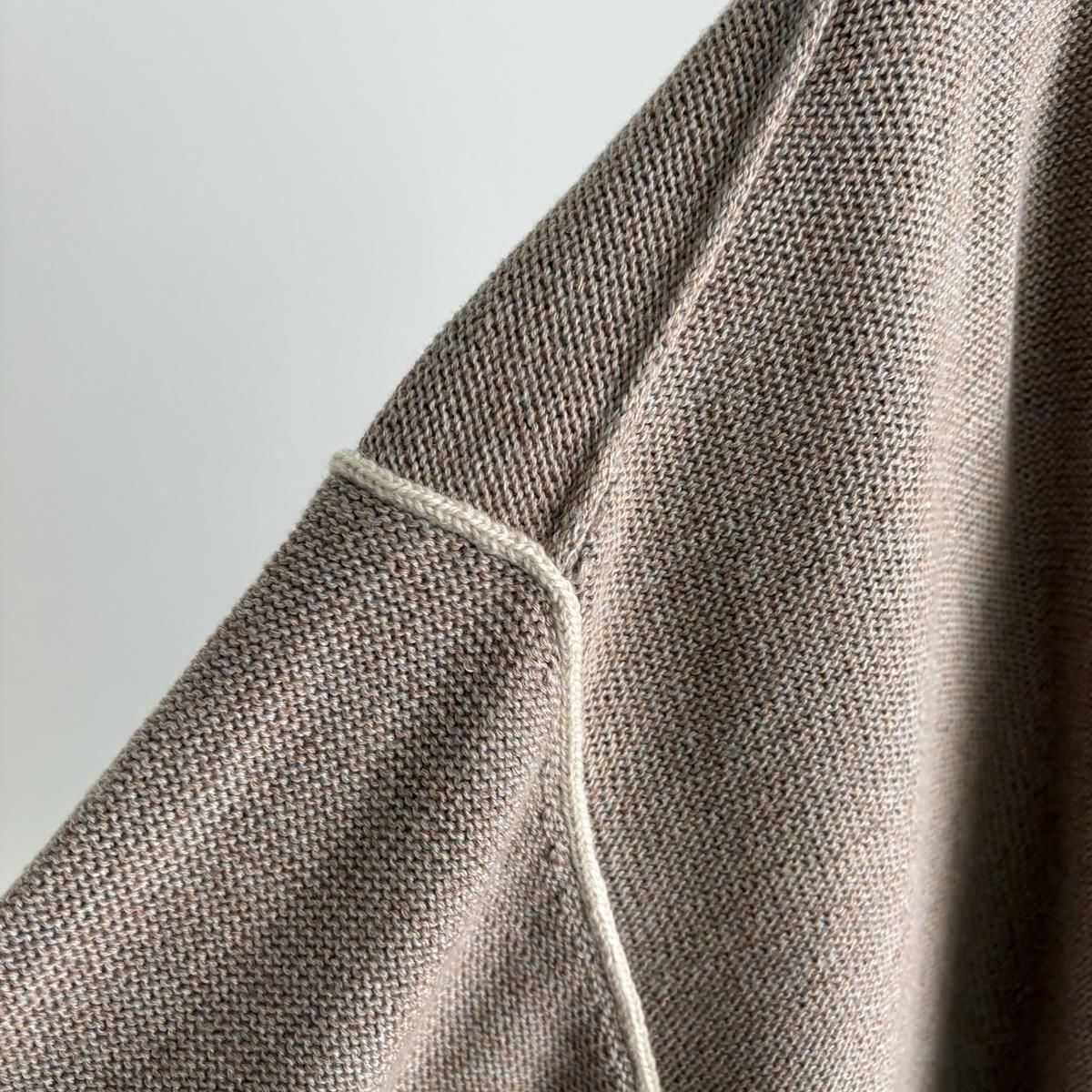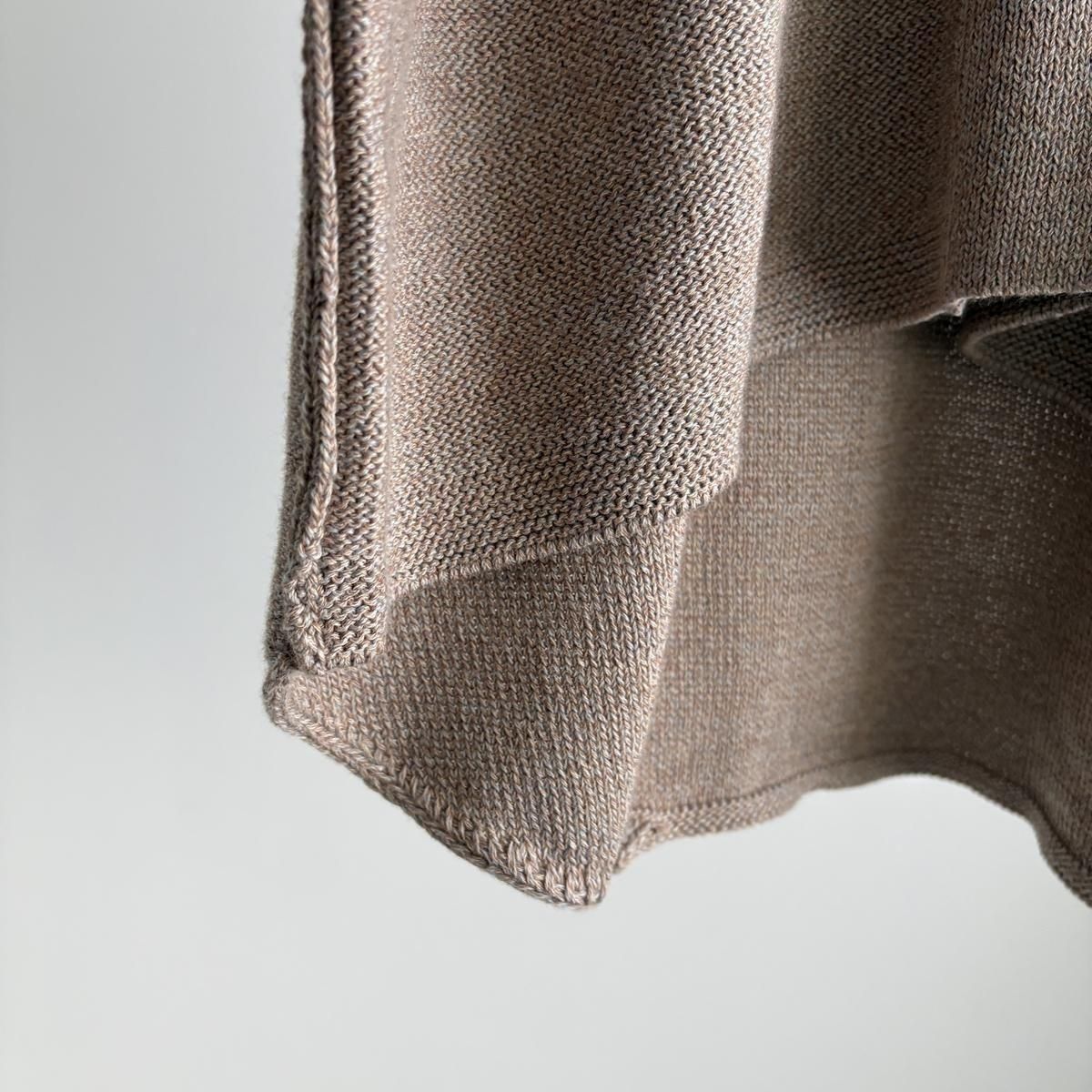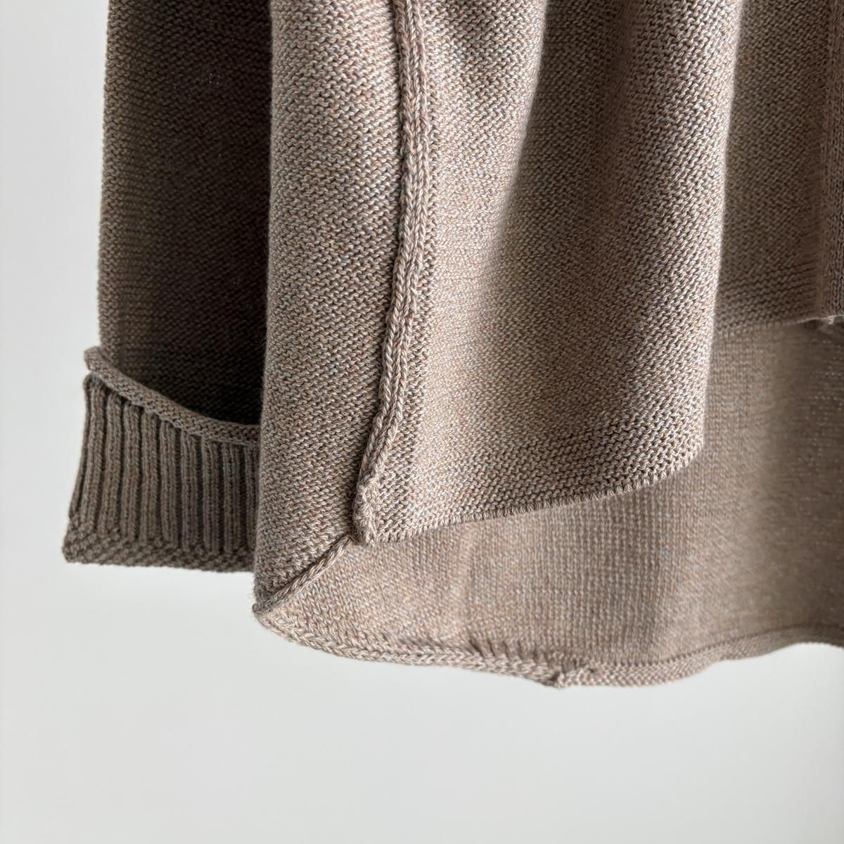 着た時のシルエットの良さも計算され設計されています!後ろ裾をラウンドさせて少し長めに編まれていて、フロントはすっきりとした着丈に仕上がっているので小柄な方が着ても、絶妙なバランスで雰囲気良く着られます。編み端の表情がかわいらしかったということで、脇やお袖は外接ぎにされたとのこと、、、そういった細かなニュアンスがたまらなく愛おしいです。