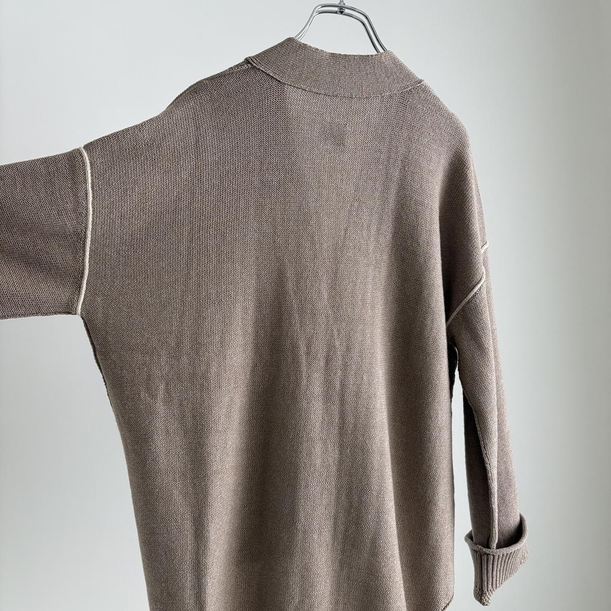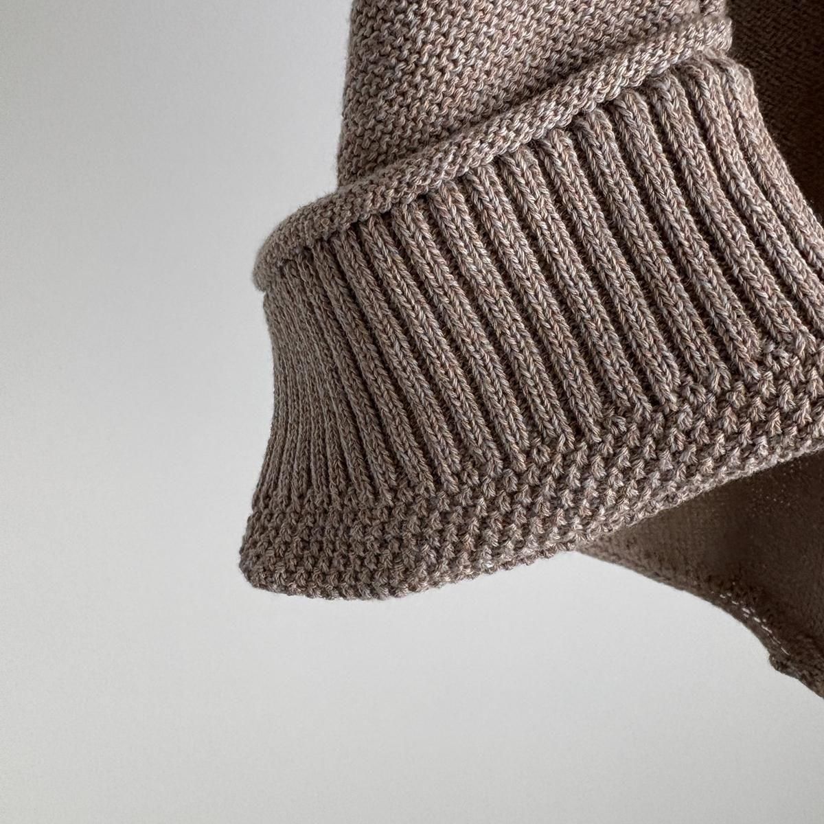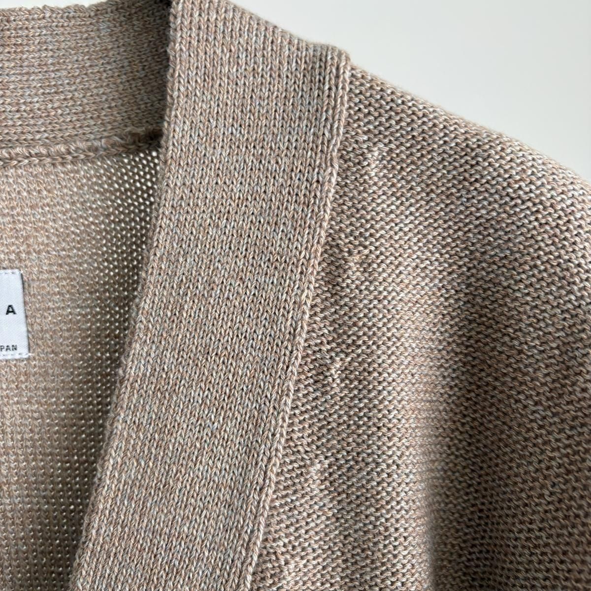 着た時のシルエットの良さも計算され設計されています!後ろ裾をラウンドさせて少し長めに編まれていて、フロントはすっきりとした着丈に仕上がっているので小柄な方が着ても、絶妙なバランスで雰囲気良く着られます。編み端の表情がかわいらしかったということで、脇やお袖は外接ぎにされたとのこと、、、そういった細かなニュアンスがたまらなく愛おしいです。