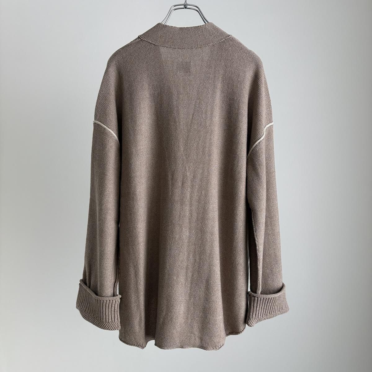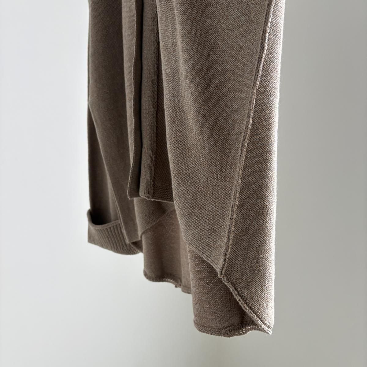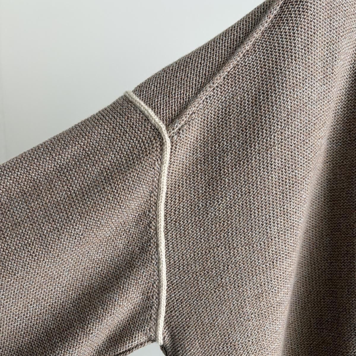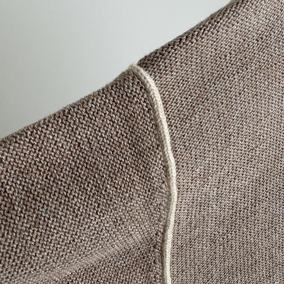 着た時のシルエットの良さも計算され設計されています!後ろ裾をラウンドさせて少し長めに編まれていて、フロントはすっきりとした着丈に仕上がっているので小柄な方が着ても、絶妙なバランスで雰囲気良く着られます。編み端の表情がかわいらしかったということで、脇やお袖は外接ぎにされたとのこと、、、そういった細かなニュアンスがたまらなく愛おしいです。