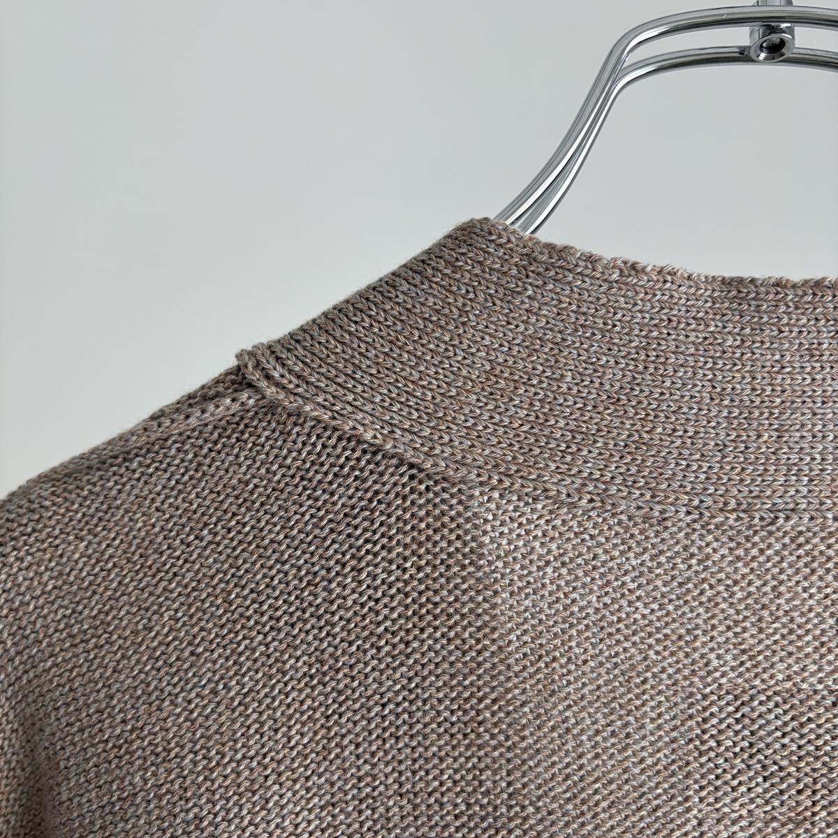 異なる3種類の細糸を複数回より合わせ、奥行きのある繊細な色味の杢糸を作られたとのこと。単色無地とは異なる何とも言えないお色が魅力的。ニットを近くでみていただくとそのお色のニュアンスがよくわかります。