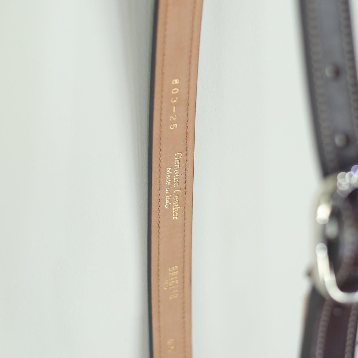 ブリリアのシルバーバックルの牛革レザーベルト。巾25mm、厚さ4mmのとてもしっかりしたステッチダウンベルト。白いステッチは一見カジュアルぽいですが、シルバーのバックルがラウンドタイプでとてもチャーミングなバックル使いなので、あえてスラックスにはずしで合わせてもいい感じのベルトです。とにかく厚さがある程度あるのでとてもしっかりしてコーディネイトしやすいベルトに仕上がっています。