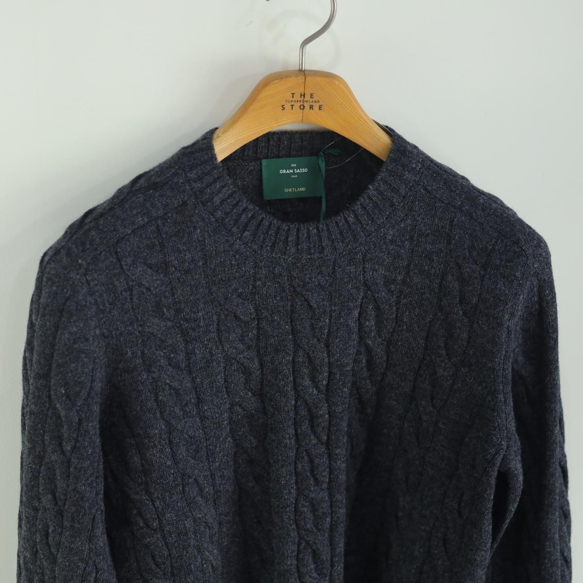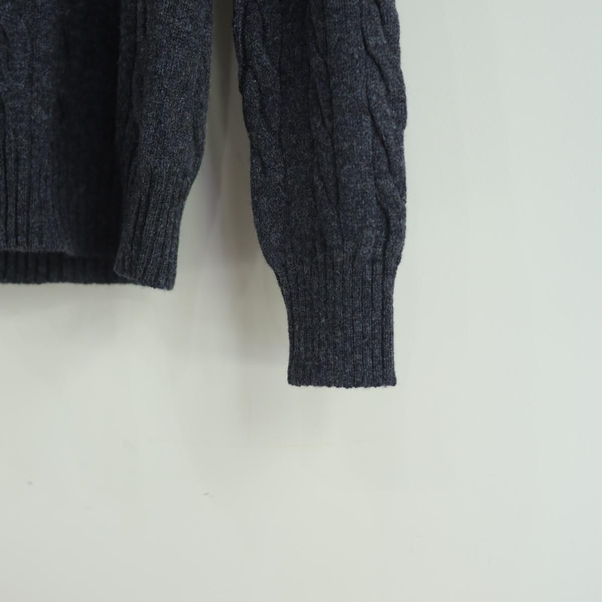 グランサッソのシェトランドウールのケーブルクルーネックニット。ミドルゲージのシェトランドはごわごわしてるのが普通ですが、グランサッソのシェトランドは毛足が柔らかい。そこまで大きいサイズ感ではないですが着用感はイタリアニットらしいエレガントな佇まいのリッチなシルエットです。ピッタリしすぎず大きすぎずインナーにシャツを合わせても上品に着用いただけます。高騰化するニットメーカーの中でリーズナブルでかっこいいニットを提供する数少ないブランドです。