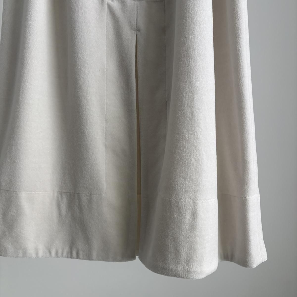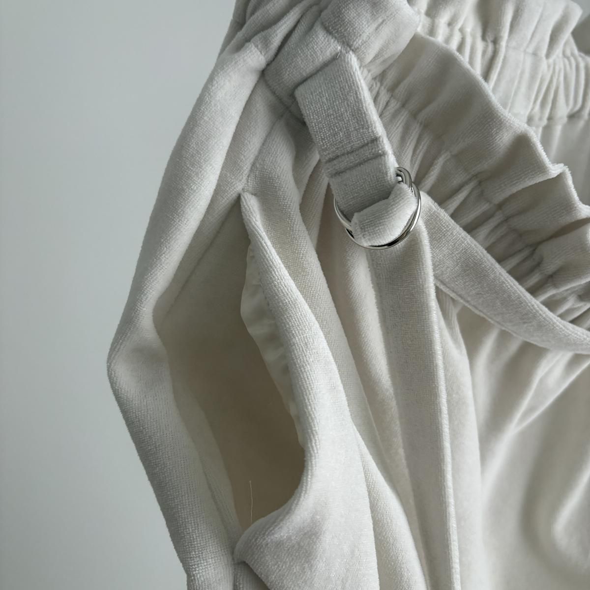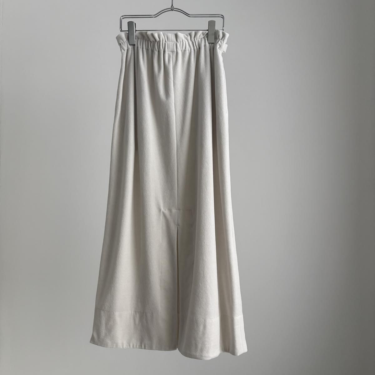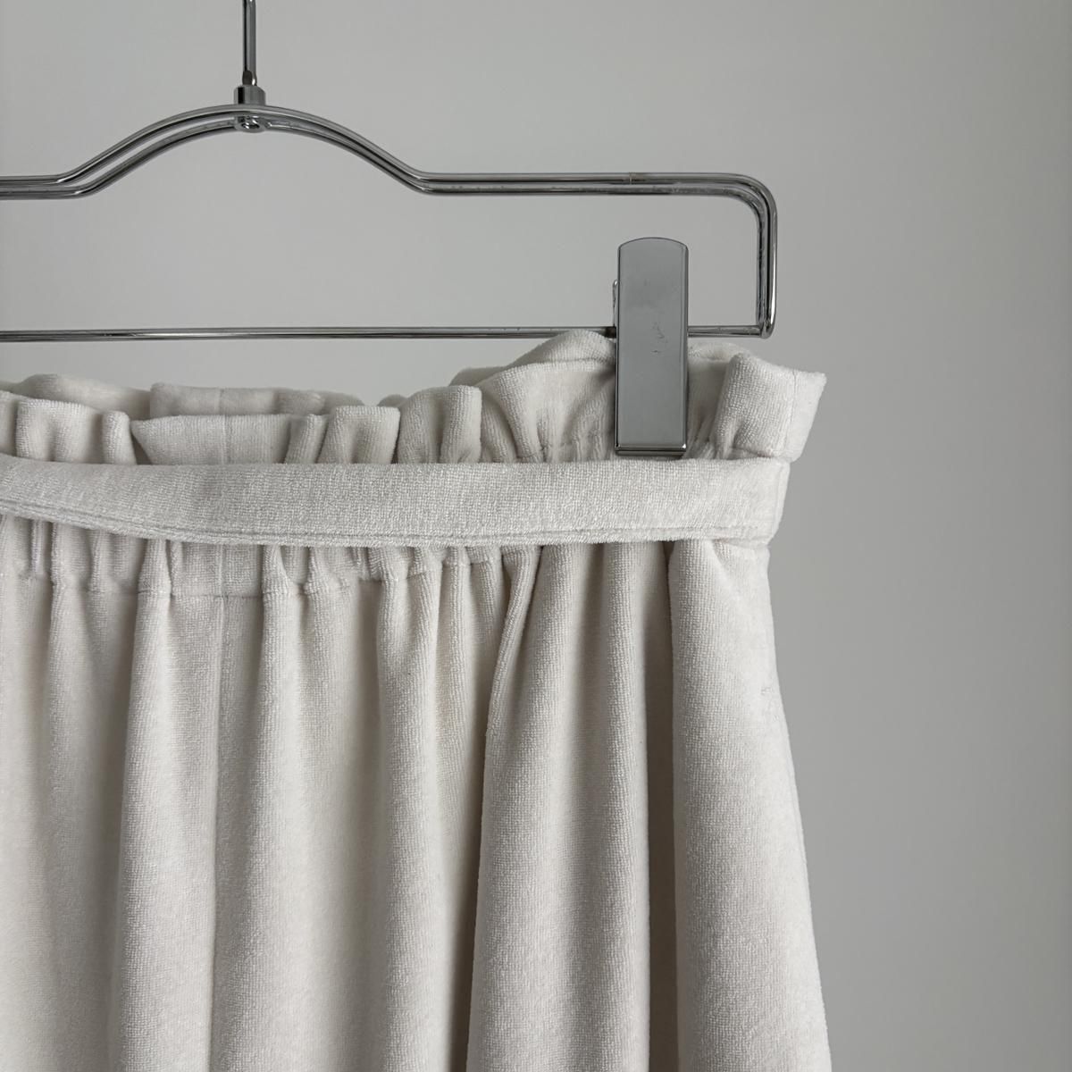 ウエストは総ゴム、裾には深めのスリットがはいり、足さばきがしやすく、かつ女性らしさもうかがえるディテールです。ベロアの生地事態も程よく伸縮性があるので、見た目のタイトとさ以上に動きやすさがあります。
