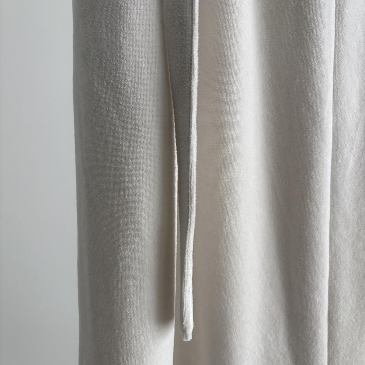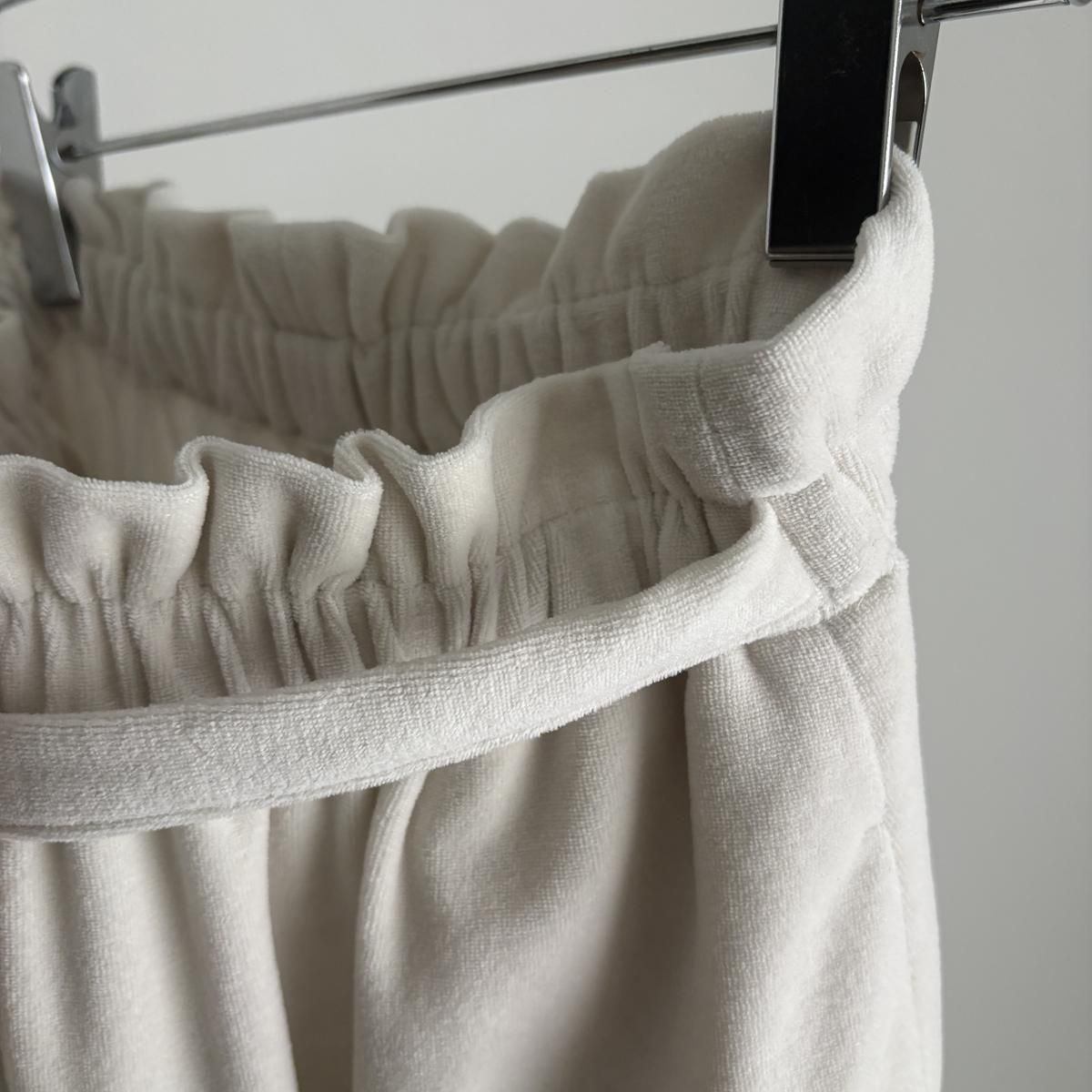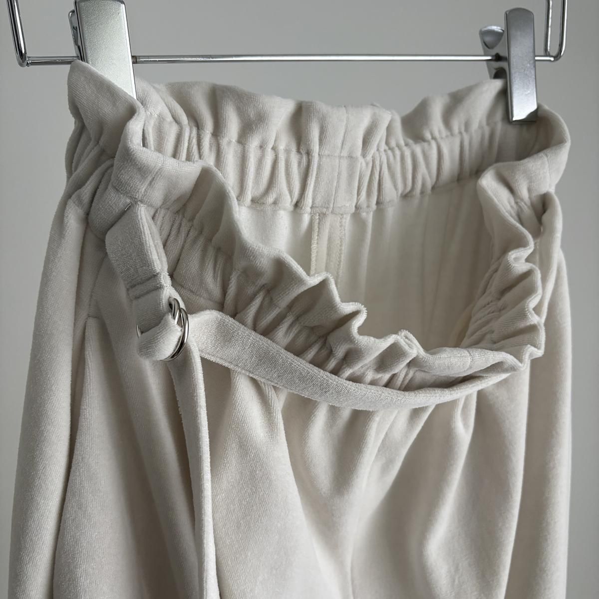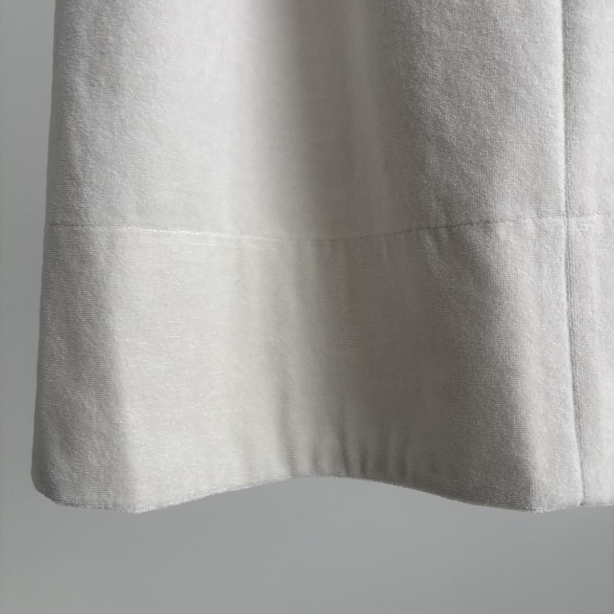 ウエストは総ゴム、裾には深めのスリットがはいり、足さばきがしやすく、かつ女性らしさもうかがえるディテールです。ベロアの生地事態も程よく伸縮性があるので、見た目のタイトとさ以上に動きやすさがあります。