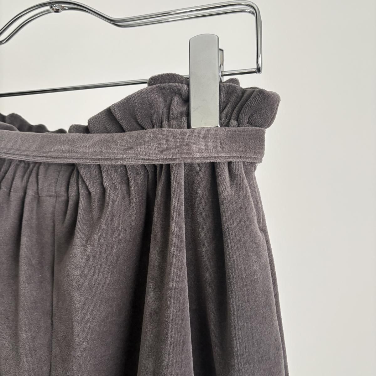 ウエストは総ゴム、裾には深めのスリットがはいり、足さばきがしやすく、かつ女性らしさもうかがえるディテールです。ベロアの生地事態も程よく伸縮性があるので、見た目のタイトとさ以上に動きやすさがあります。