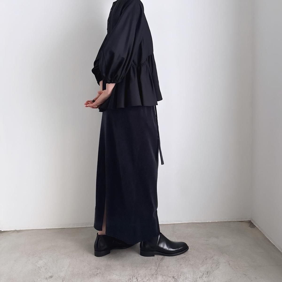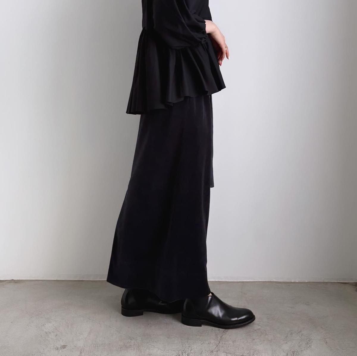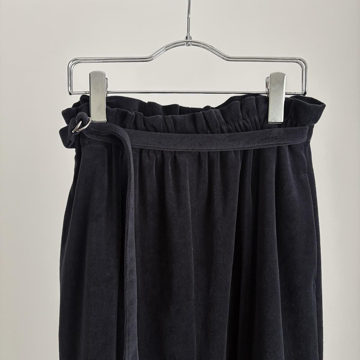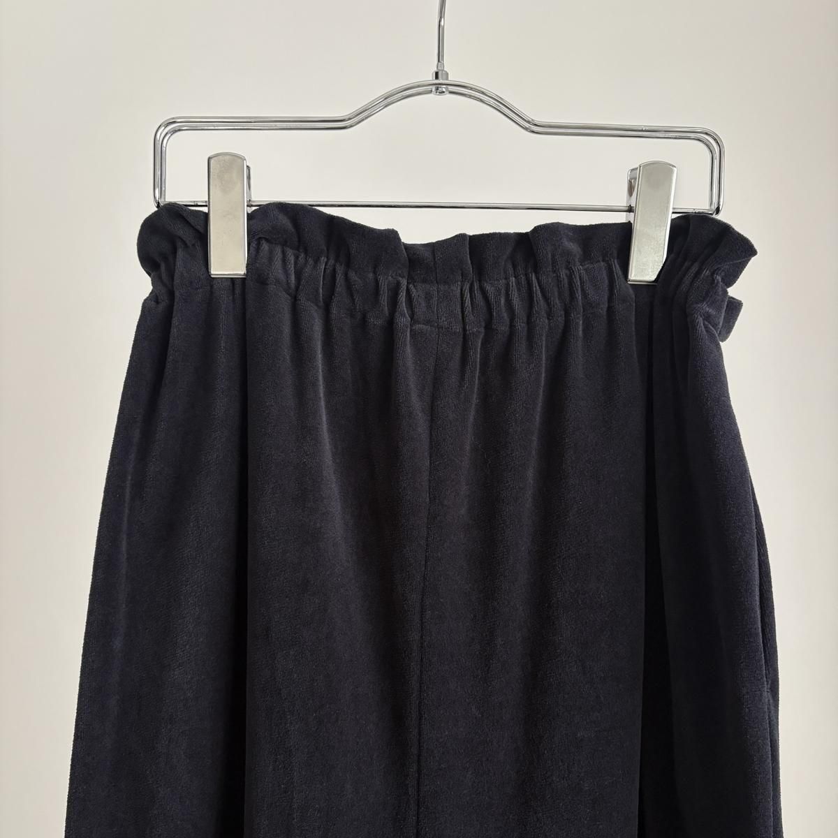 ウエストは総ゴム、裾には深めのスリットがはいり、足さばきがしやすく、かつ女性らしさもうかがえるディテールです。ベロアの生地事態も程よく伸縮性があるので、見た目のタイトとさ以上に動きやすさがあります。
