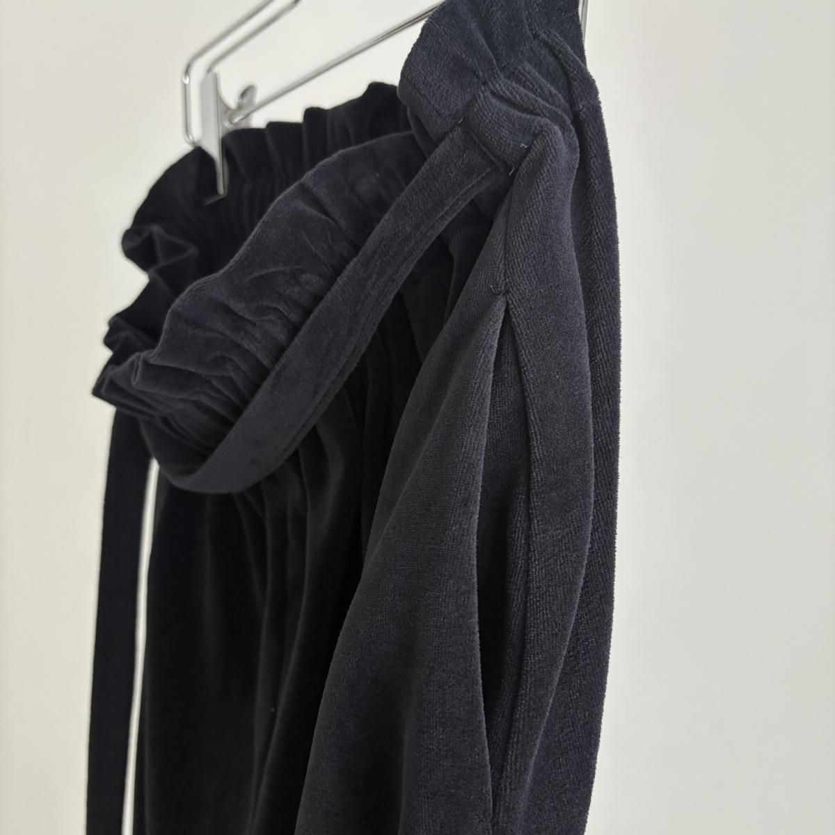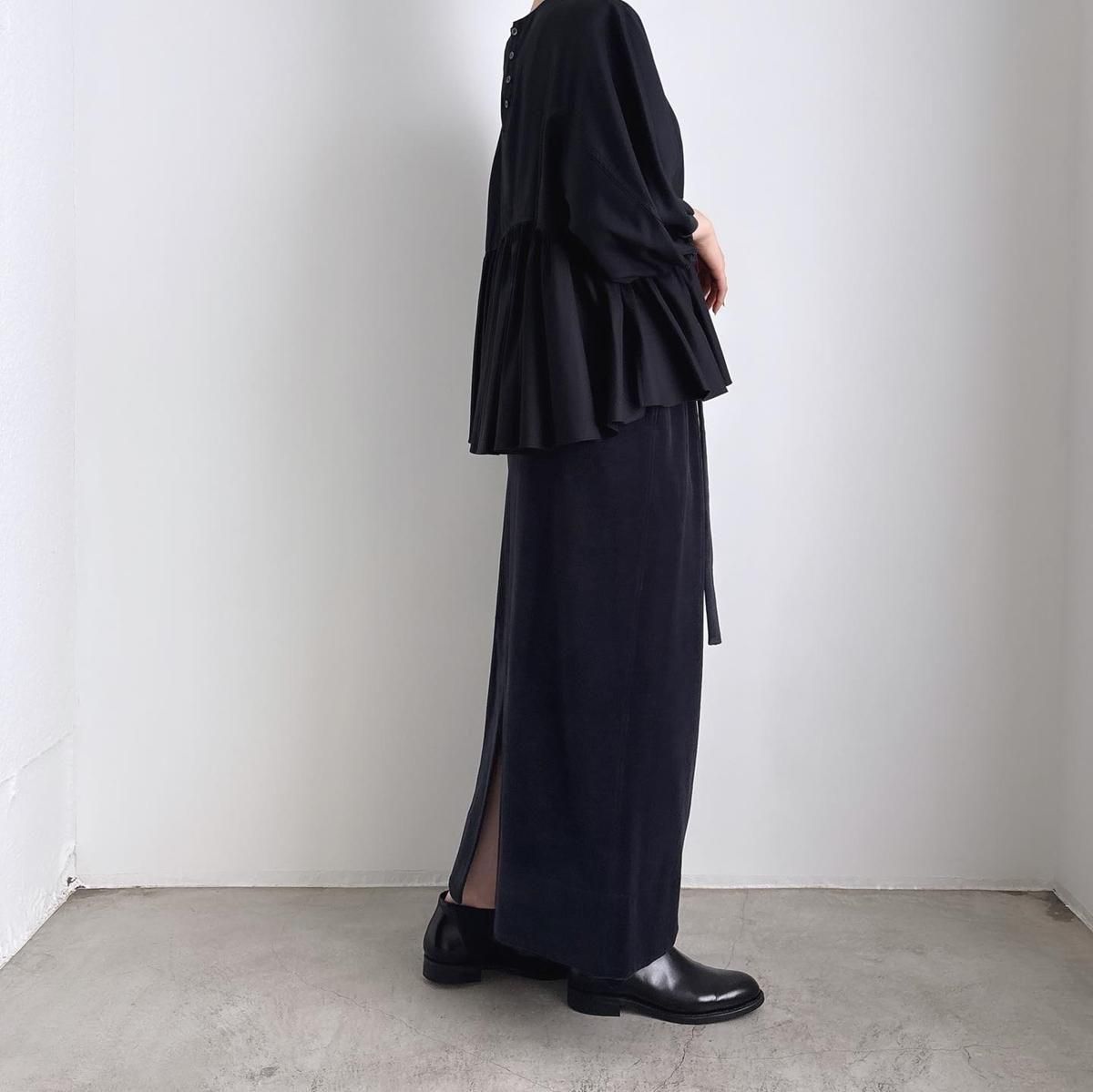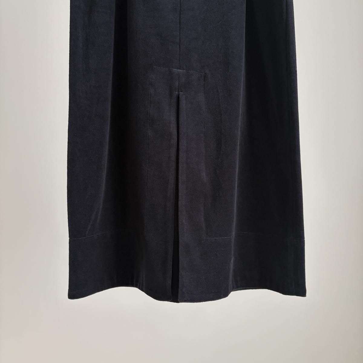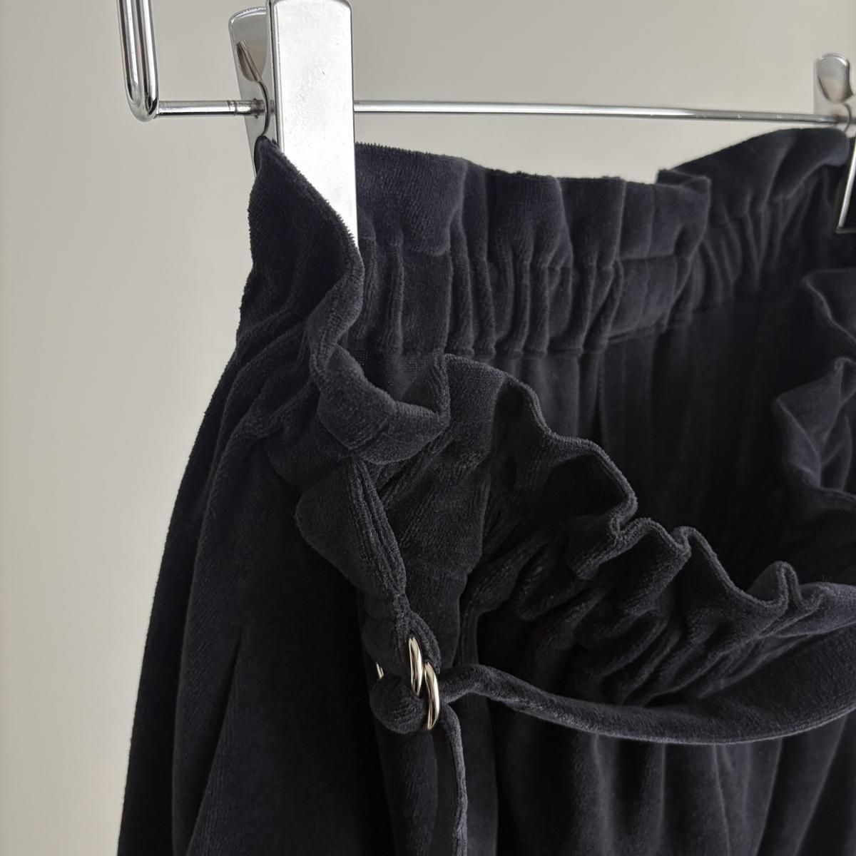 ウエストは総ゴム、裾には深めのスリットがはいり、足さばきがしやすく、かつ女性らしさもうかがえるディテールです。ベロアの生地事態も程よく伸縮性があるので、見た目のタイトとさ以上に動きやすさがあります。