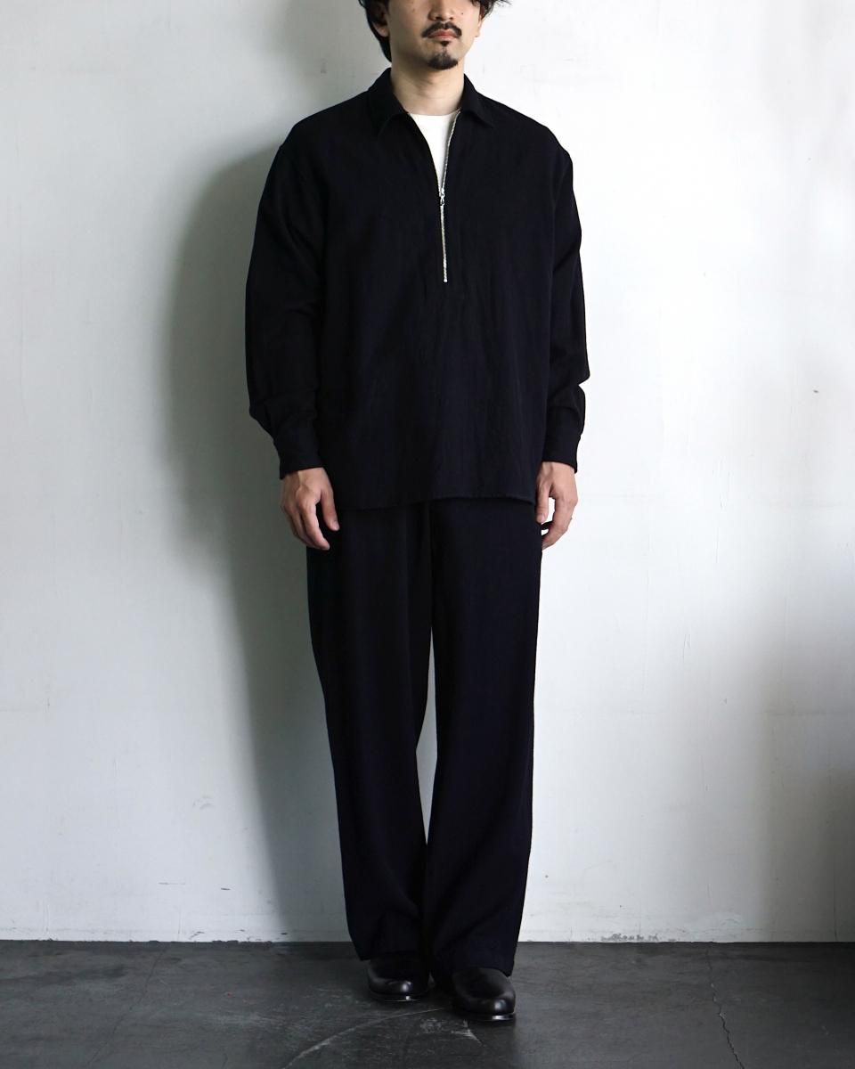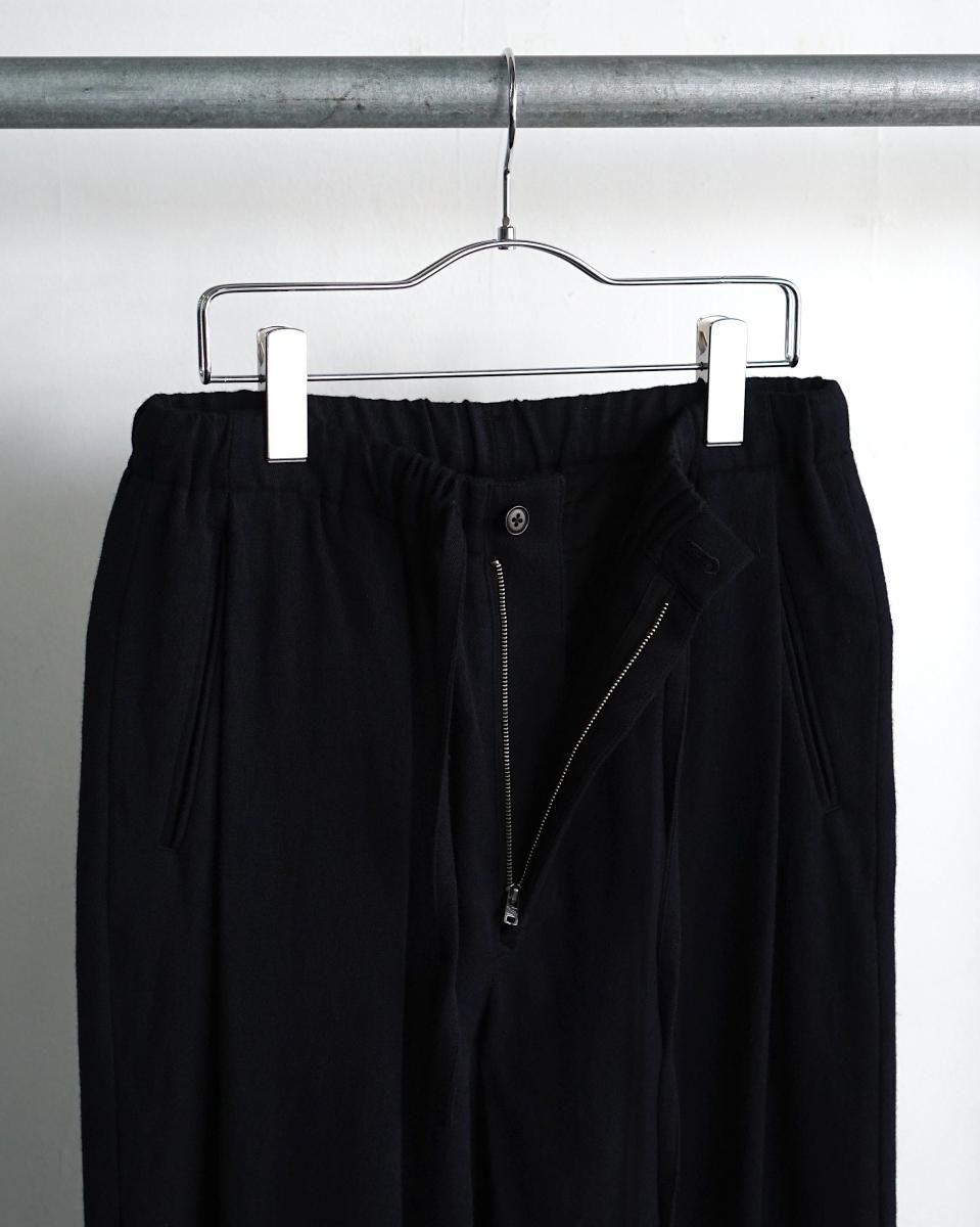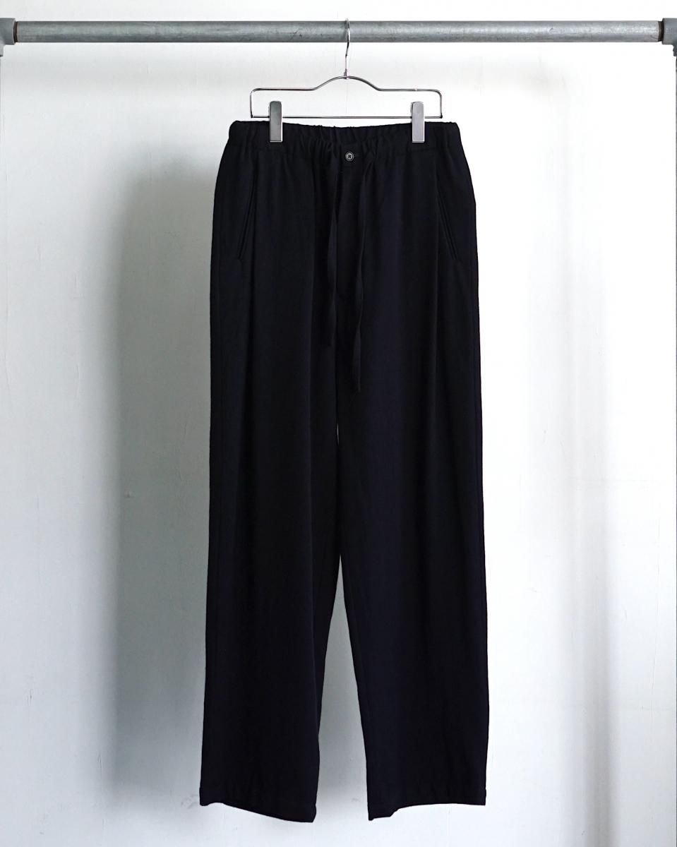 ・ゆとりのある股上と中太ストレートのシルエット、両サイドにさり気なく入った深めのアウトタックが特徴で、ゴムとドローコード仕様のウエストは心地良い着用感を感じられます。