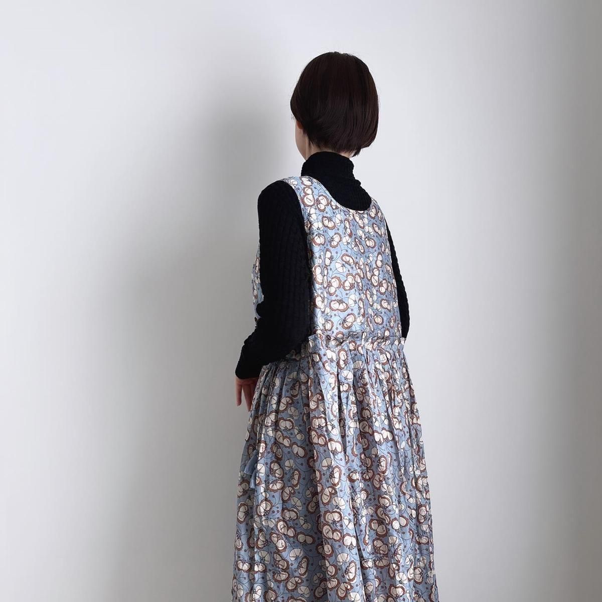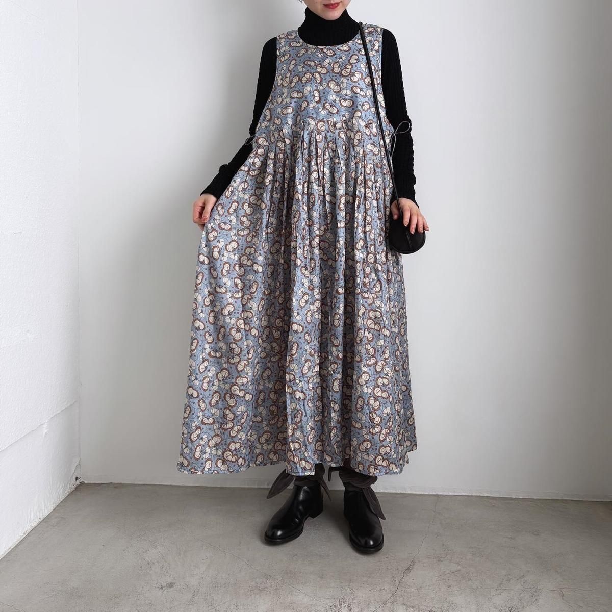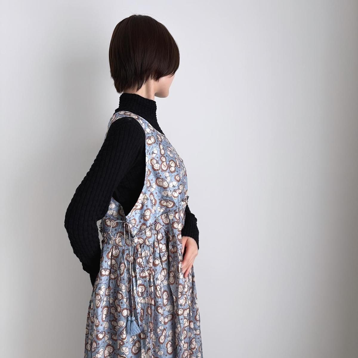 お袖がないのでTシャツなどのカットソーはもちろん、これからの季節はタートルニットなどを重ねてお楽しみいただけます。様々な着こなしでシーズンを通してお楽しみいただける素敵ドレスです。