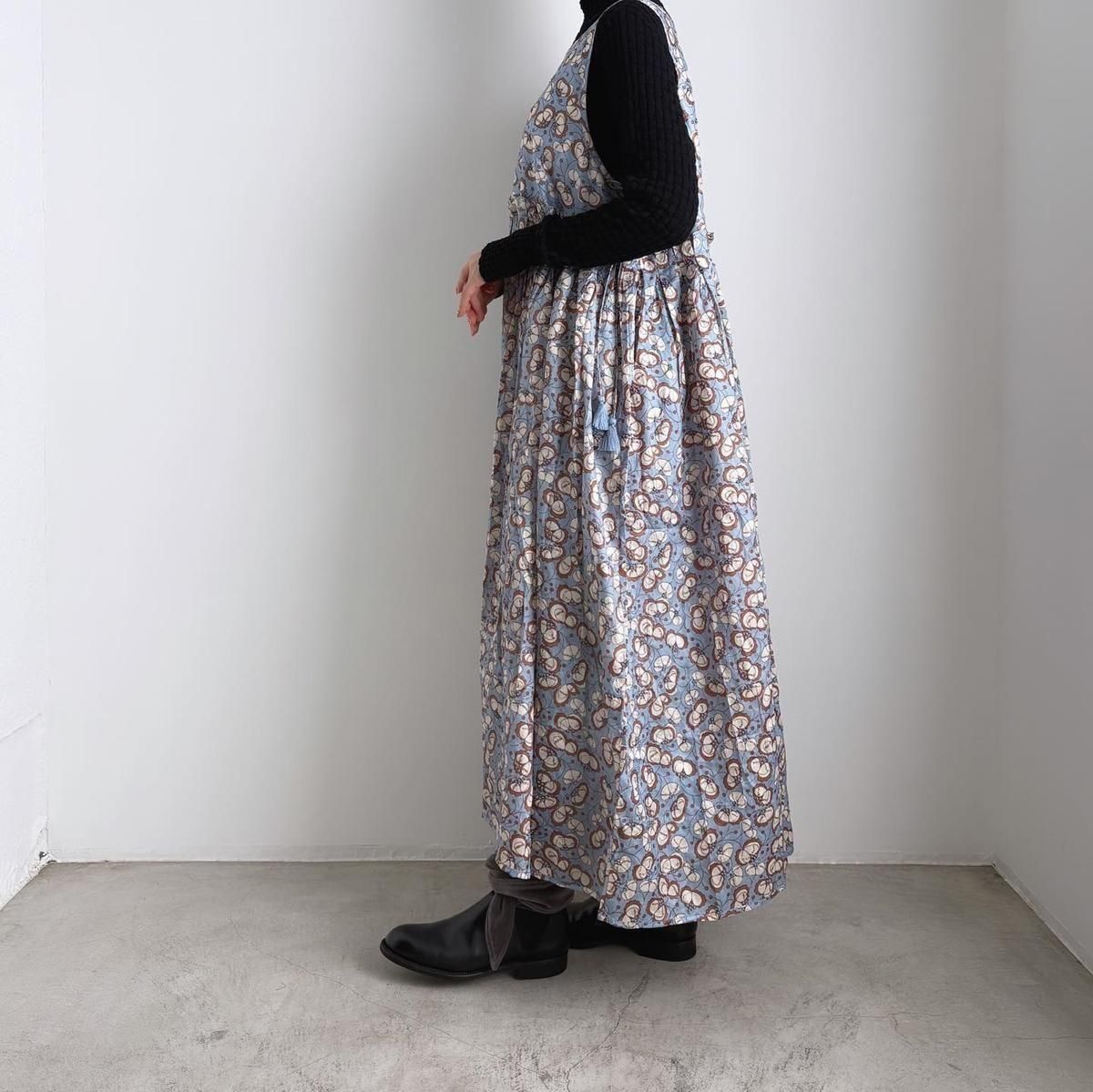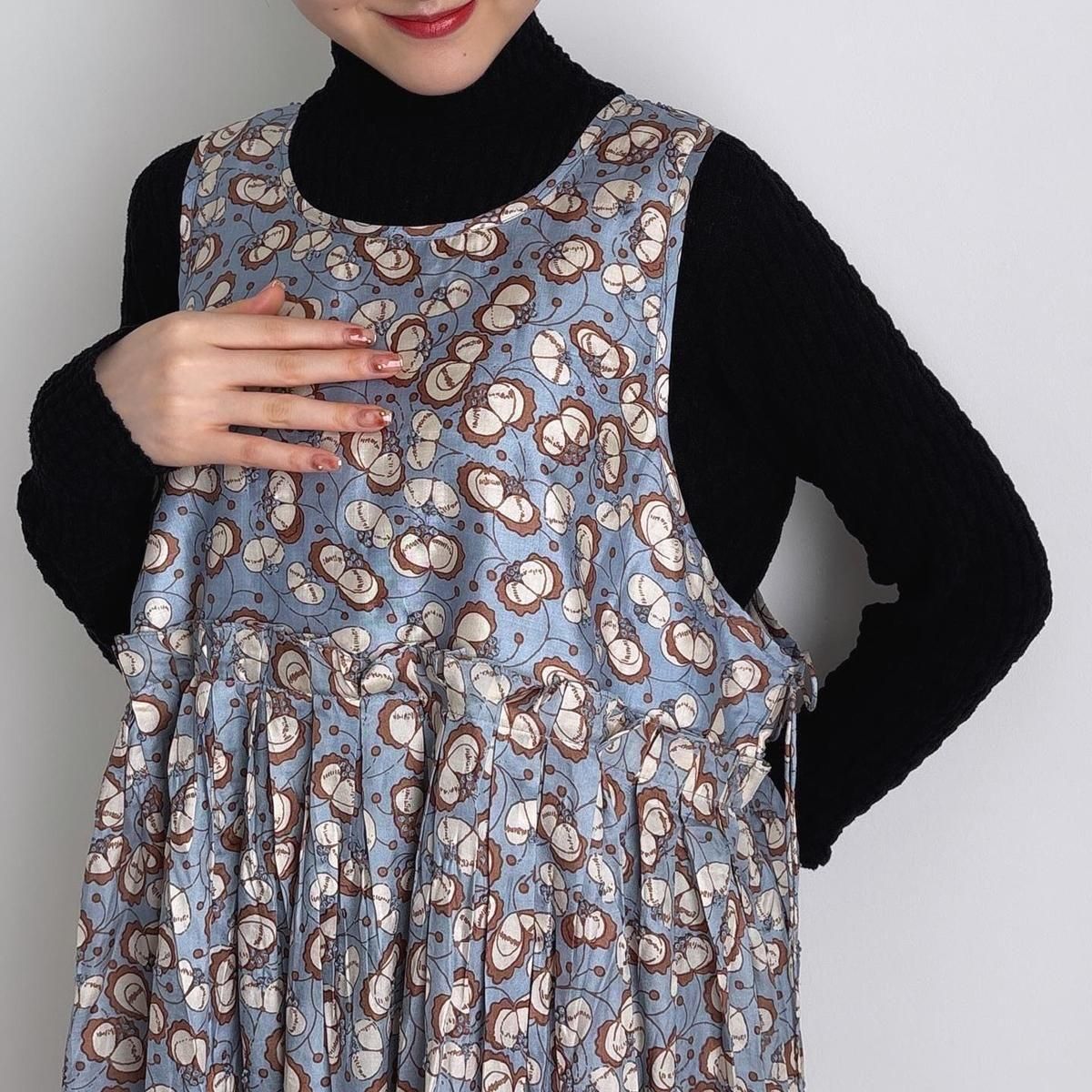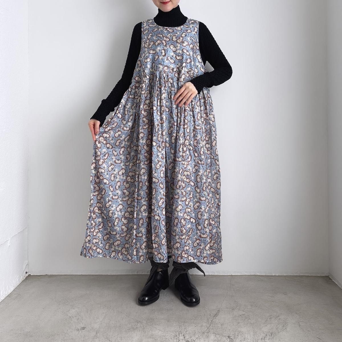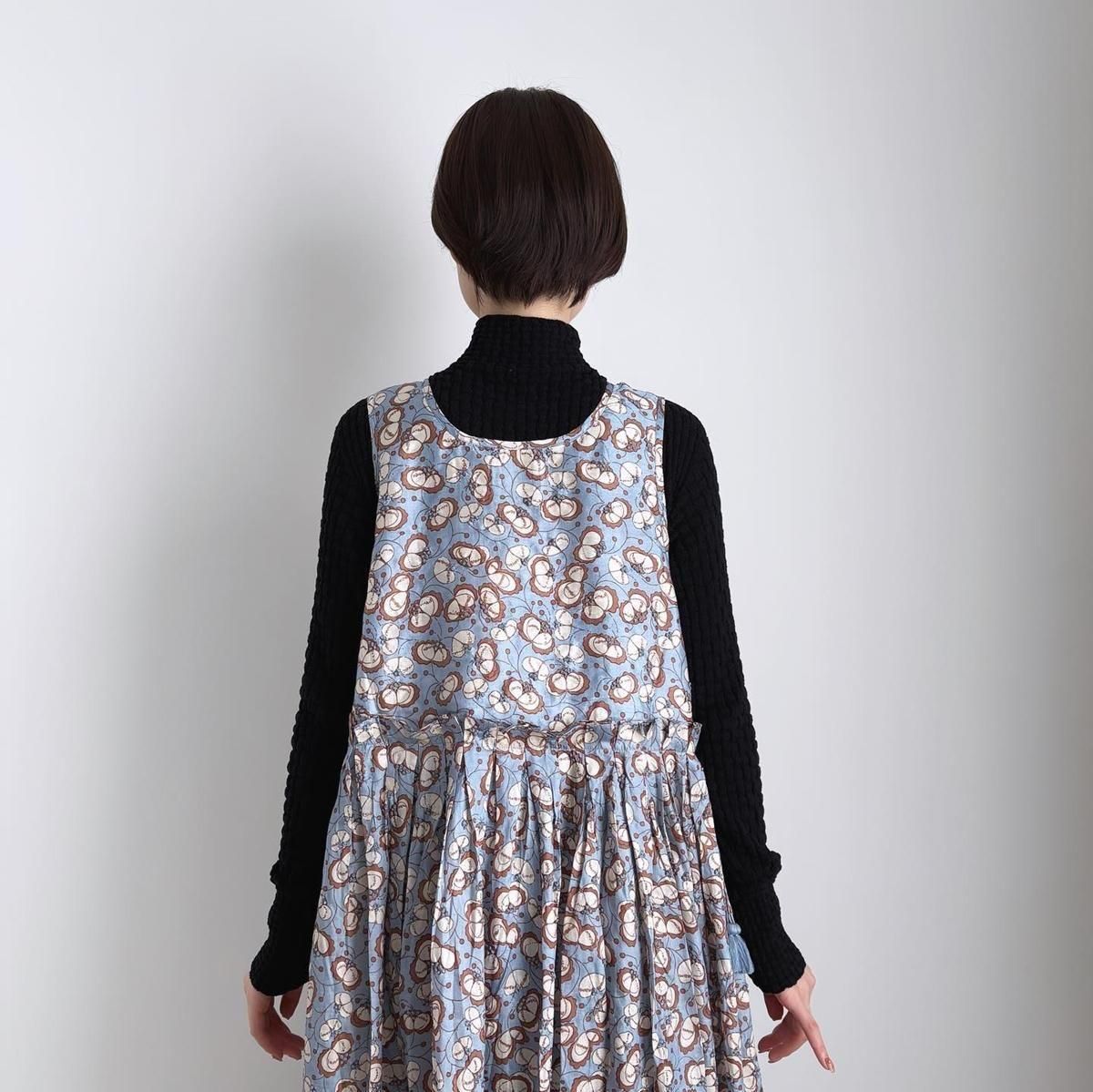 お袖がないのでTシャツなどのカットソーはもちろん、これからの季節はタートルニットなどを重ねてお楽しみいただけます。様々な着こなしでシーズンを通してお楽しみいただける素敵ドレスです。