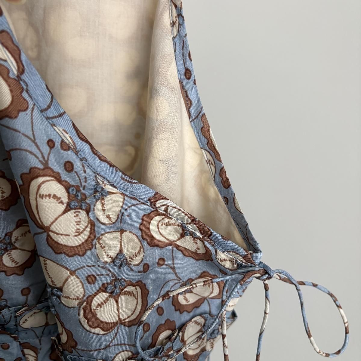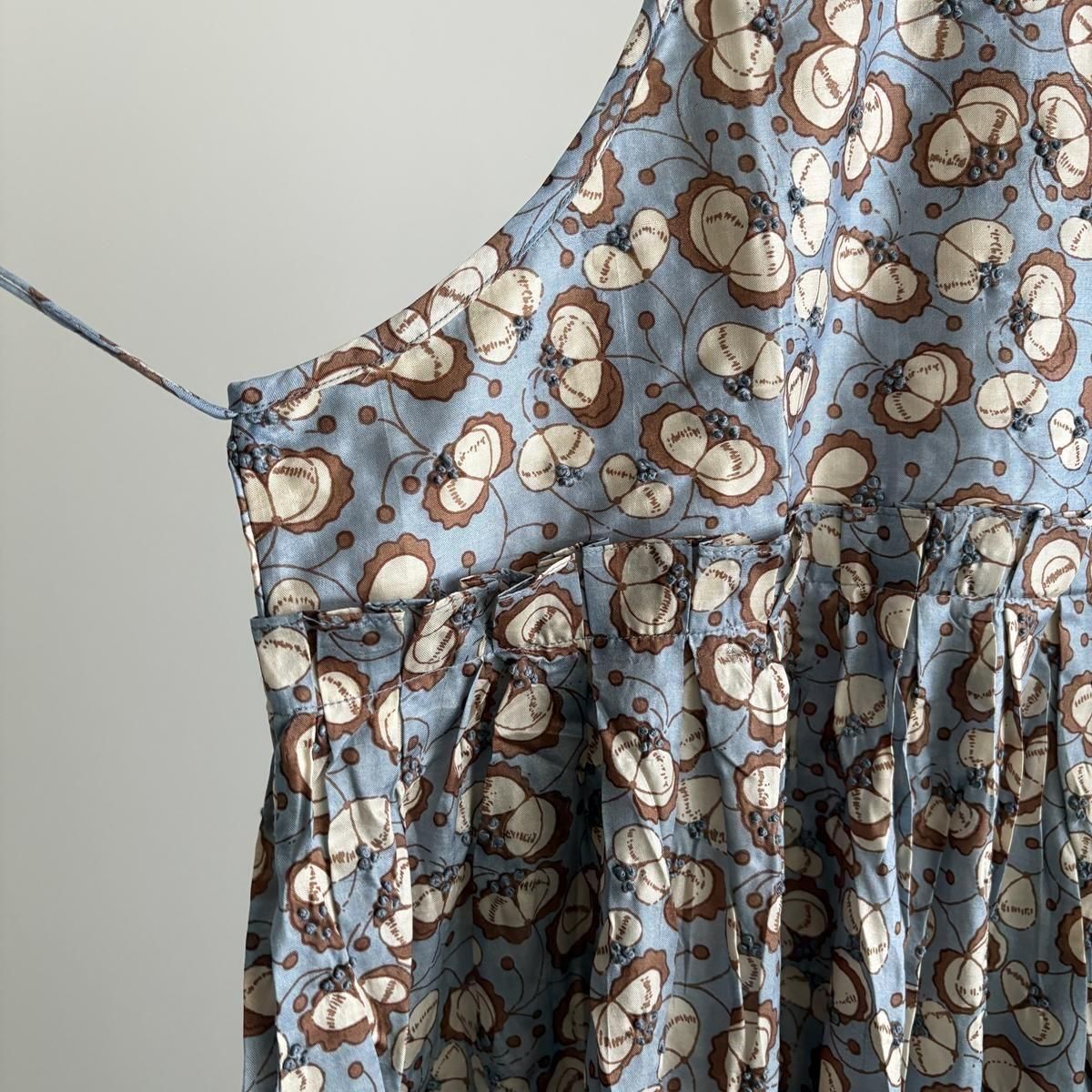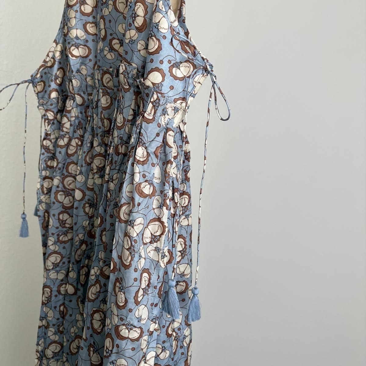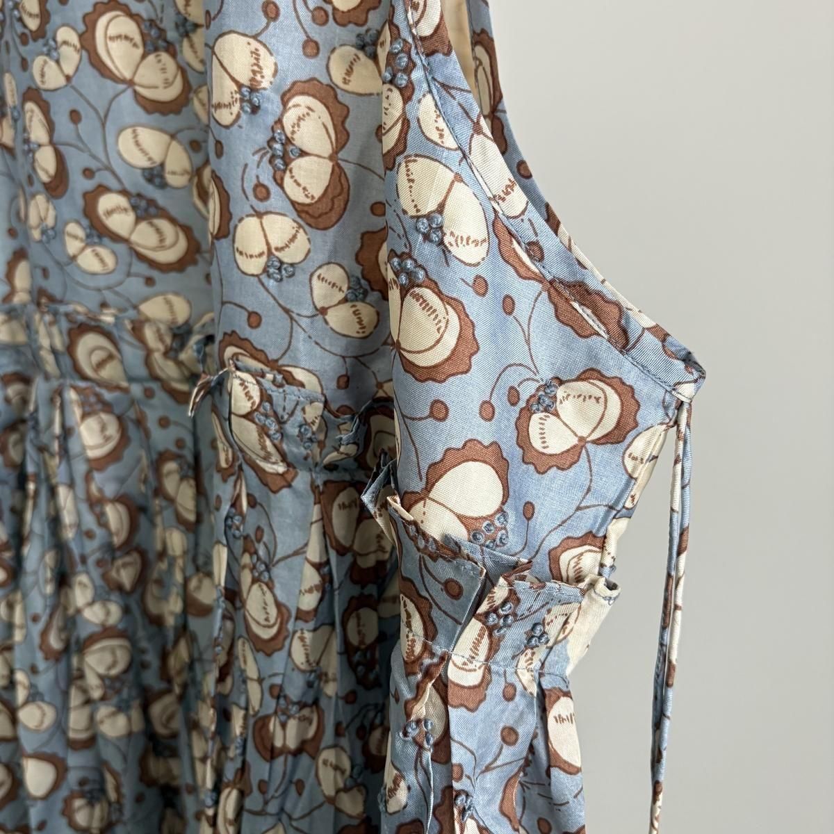 春夏でシルクチュールの生地で展開されていたドレスデザインを今回はBUNONお馴染みのテキスタイルで展開されました!胸元はタックが施され、立体感があり、両サイドの供布紐はタッセル付き。こちらは垂らしていても結んでいても、どちらにしていても素敵。さり気ないディテールですが、ときめきポイントですよね。