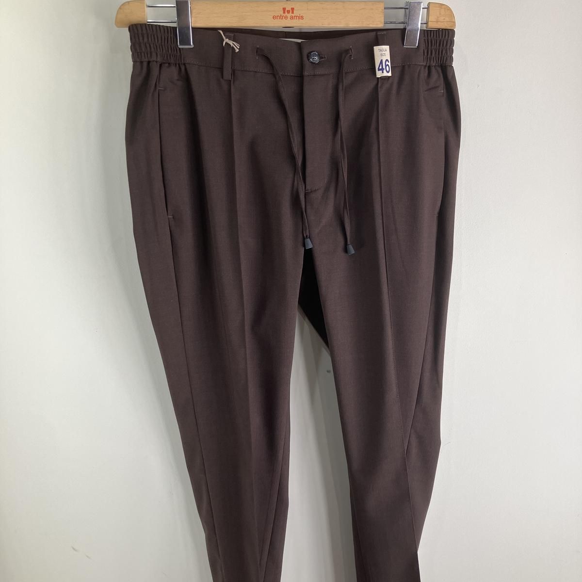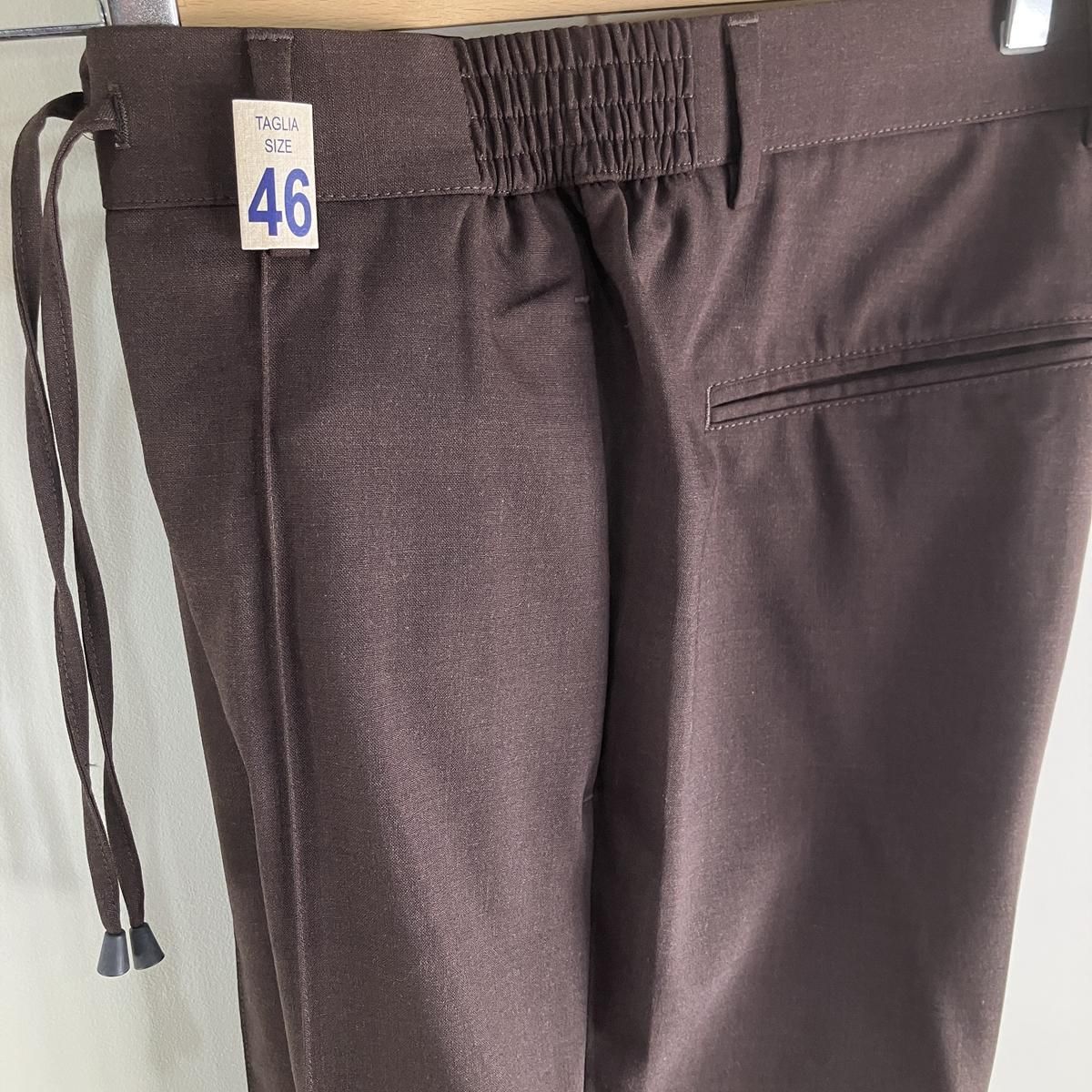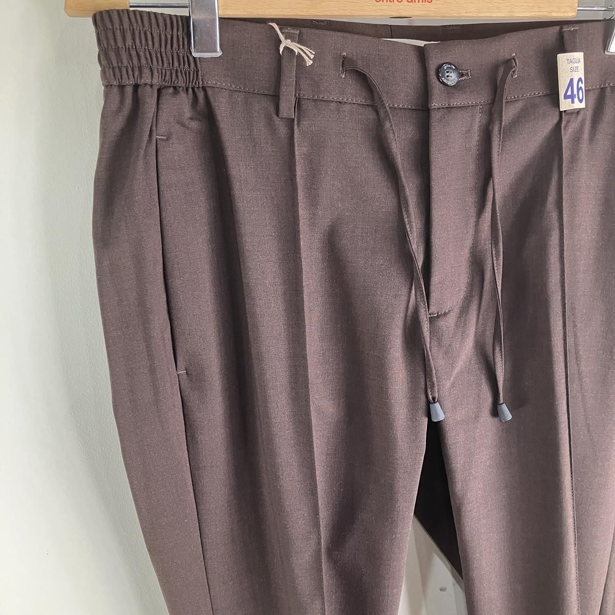 素材はメランジカラーが特徴のポリエステルウールテクノファブリック。適度な目付で通気着用が可能で、ストレッチ入りによる皺になりにくい快適な素材です。スラックスに見間違うくらいに綺麗なシルエットでドローコードは中に落とせばベルト着用も可能。ウエストシャーリングもリラックスして着用できるので嬉しいところです。こちらはセンタークリース付きのマサッチョというモデル。サイドシルエットもテーパードが非常に綺麗でジャケットスタイルにもコーディネイトできる逸品です。