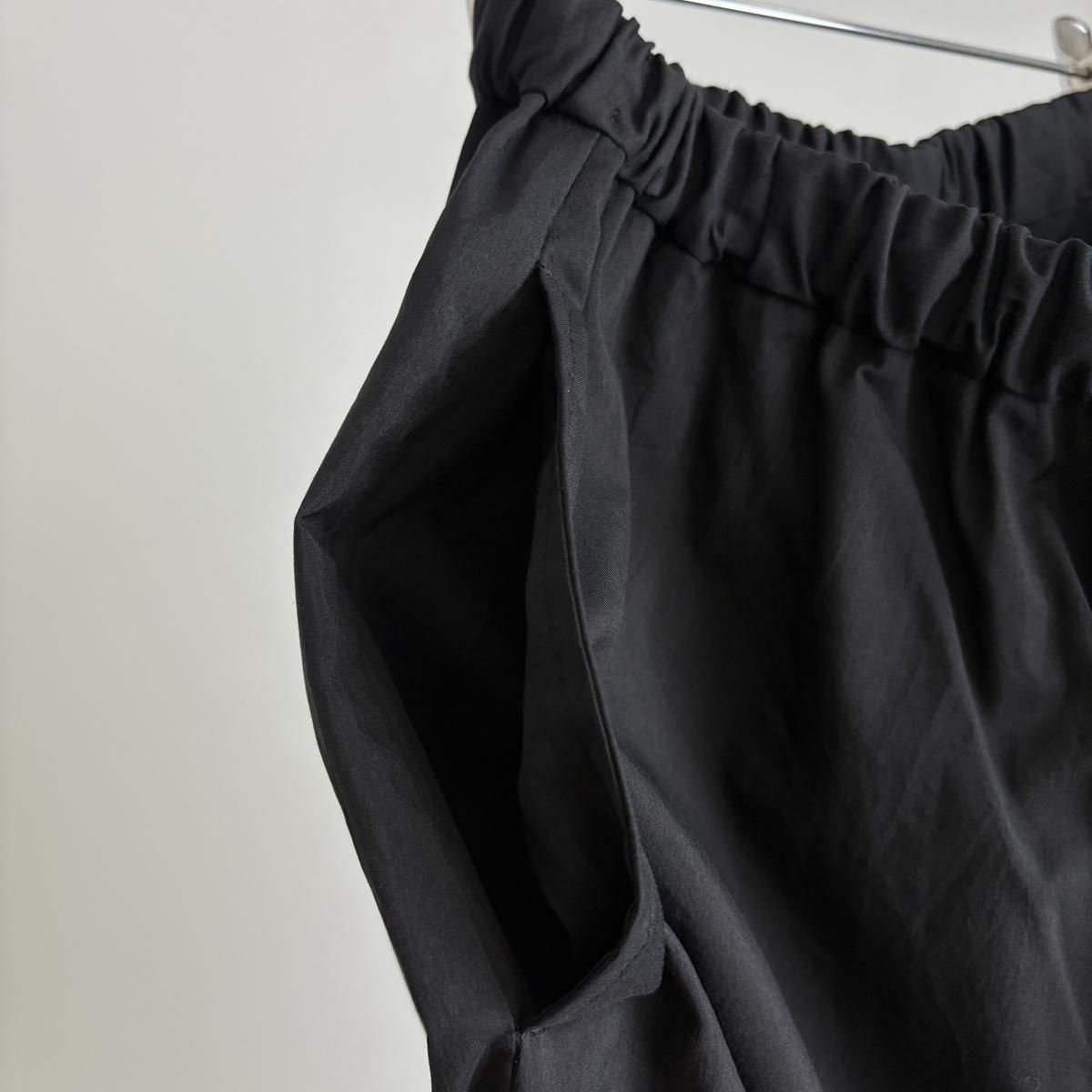 股上深めでウエストは総ゴム両サイドのポケット。紐付きなので微調整がききます。