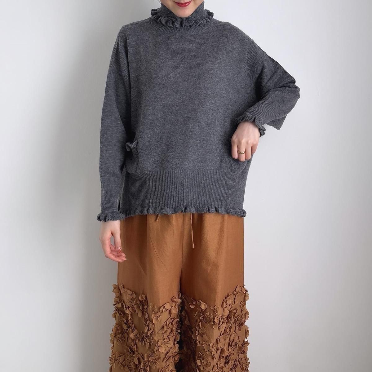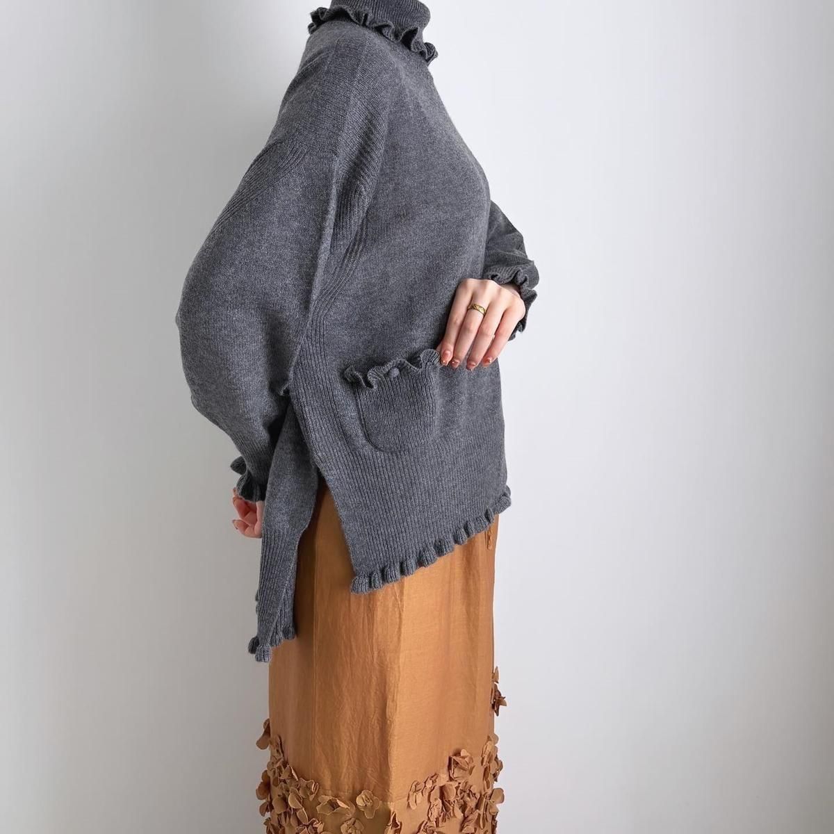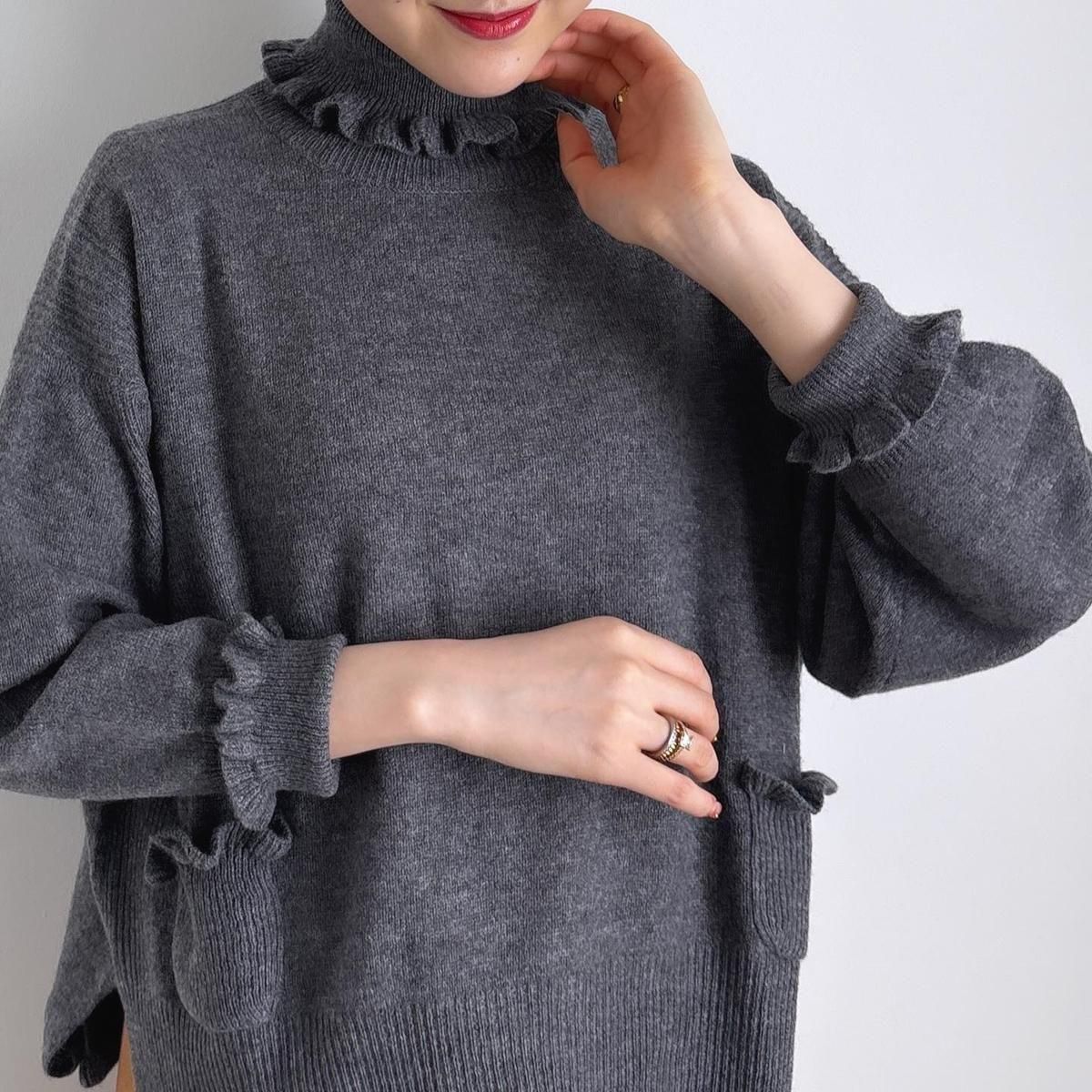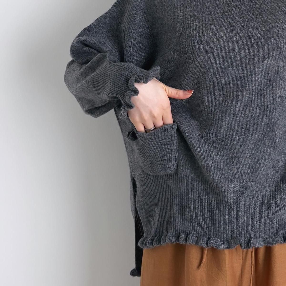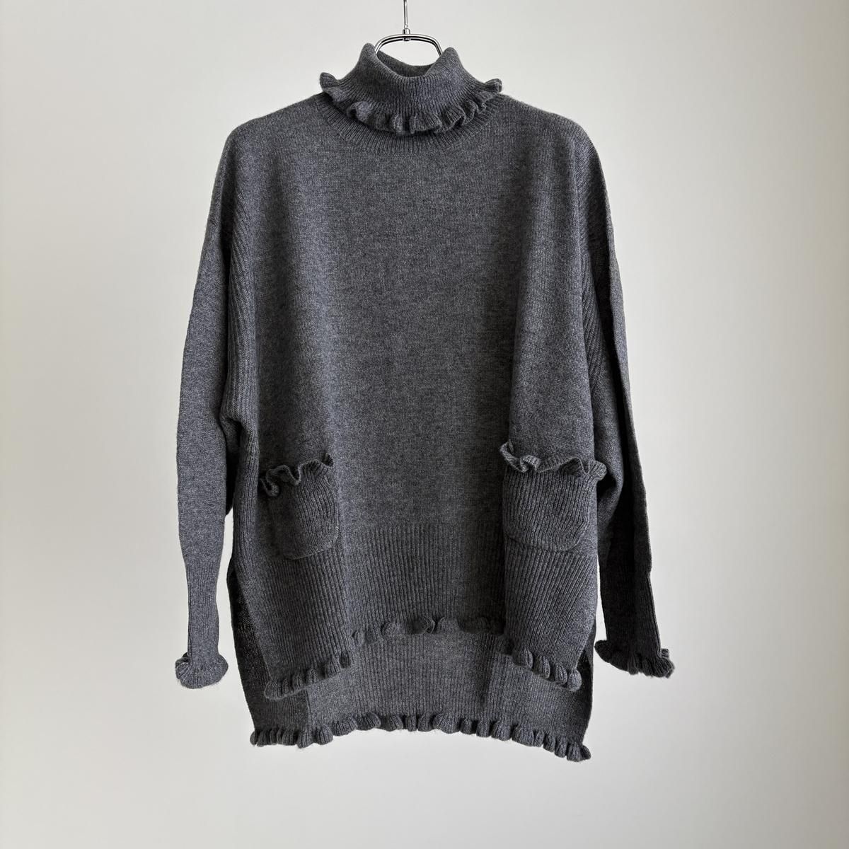 布帛の生地でも同シリーズが展開されていましたがニットになるとまたそのフリルの表現がたまらなく愛らしいディテールへ。タートルネック部分、袖口、裾、ポケットにさり気なくもフリルがあしらわれ、立体感のあるディテールが魅力的。前後で着丈をかえらているので、一枚で着用した時フロントの着丈がすっきりとしているのでバランスがとりやすく、両サイドの見え方も新鮮です。
