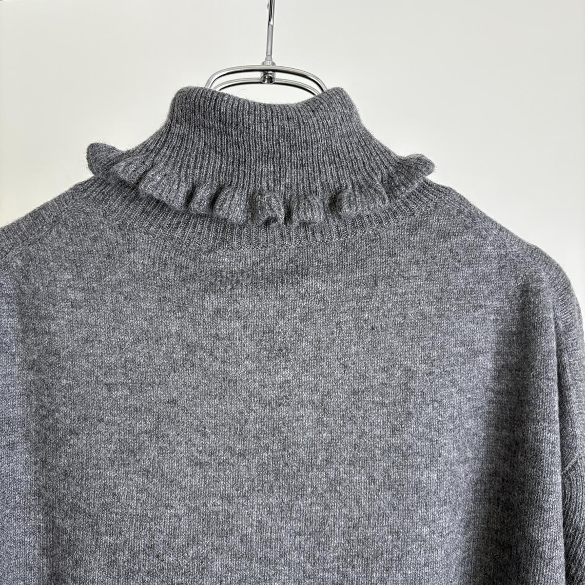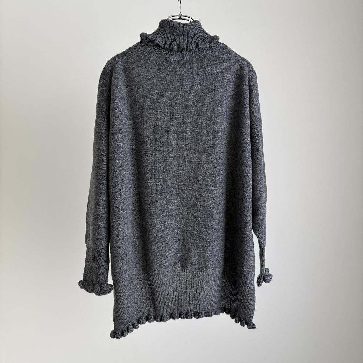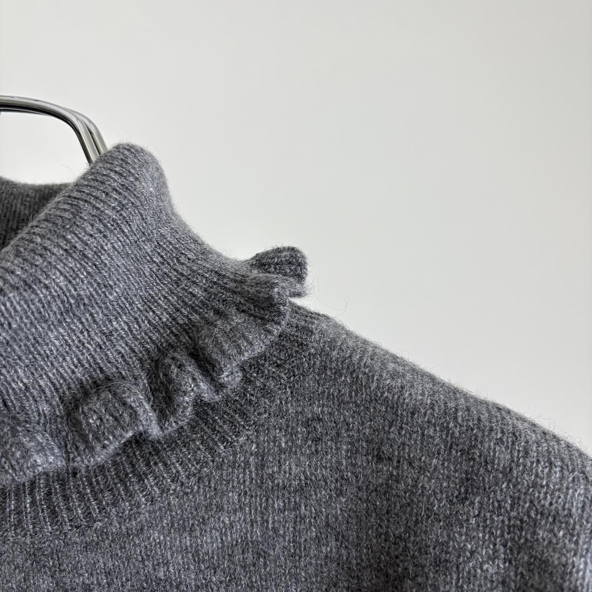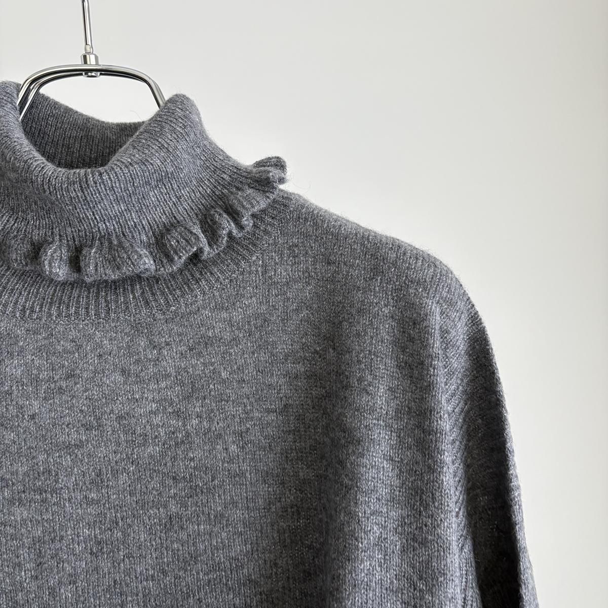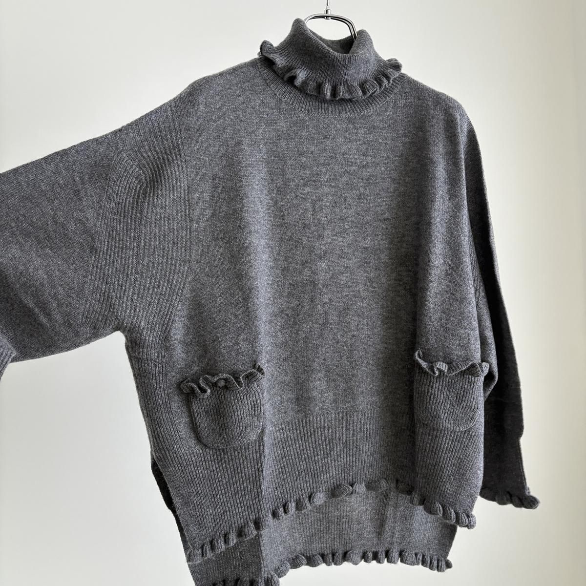 布帛の生地でも同シリーズが展開されていましたがニットになるとまたそのフリルの表現がたまらなく愛らしいディテールへ。タートルネック部分、袖口、裾、ポケットにさり気なくもフリルがあしらわれ、立体感のあるディテールが魅力的。前後で着丈をかえらているので、一枚で着用した時フロントの着丈がすっきりとしているのでバランスがとりやすく、両サイドの見え方も新鮮です。