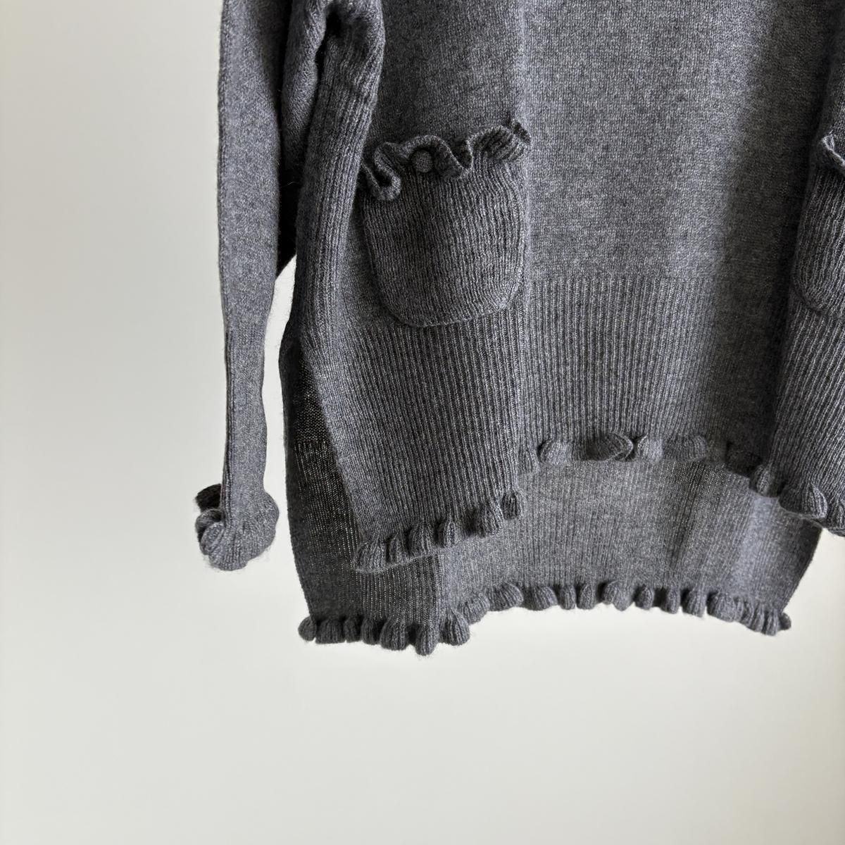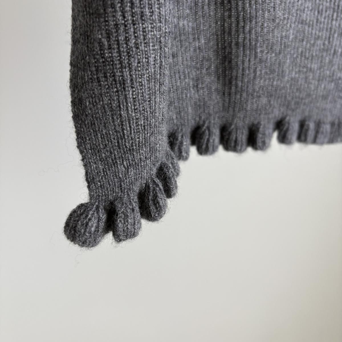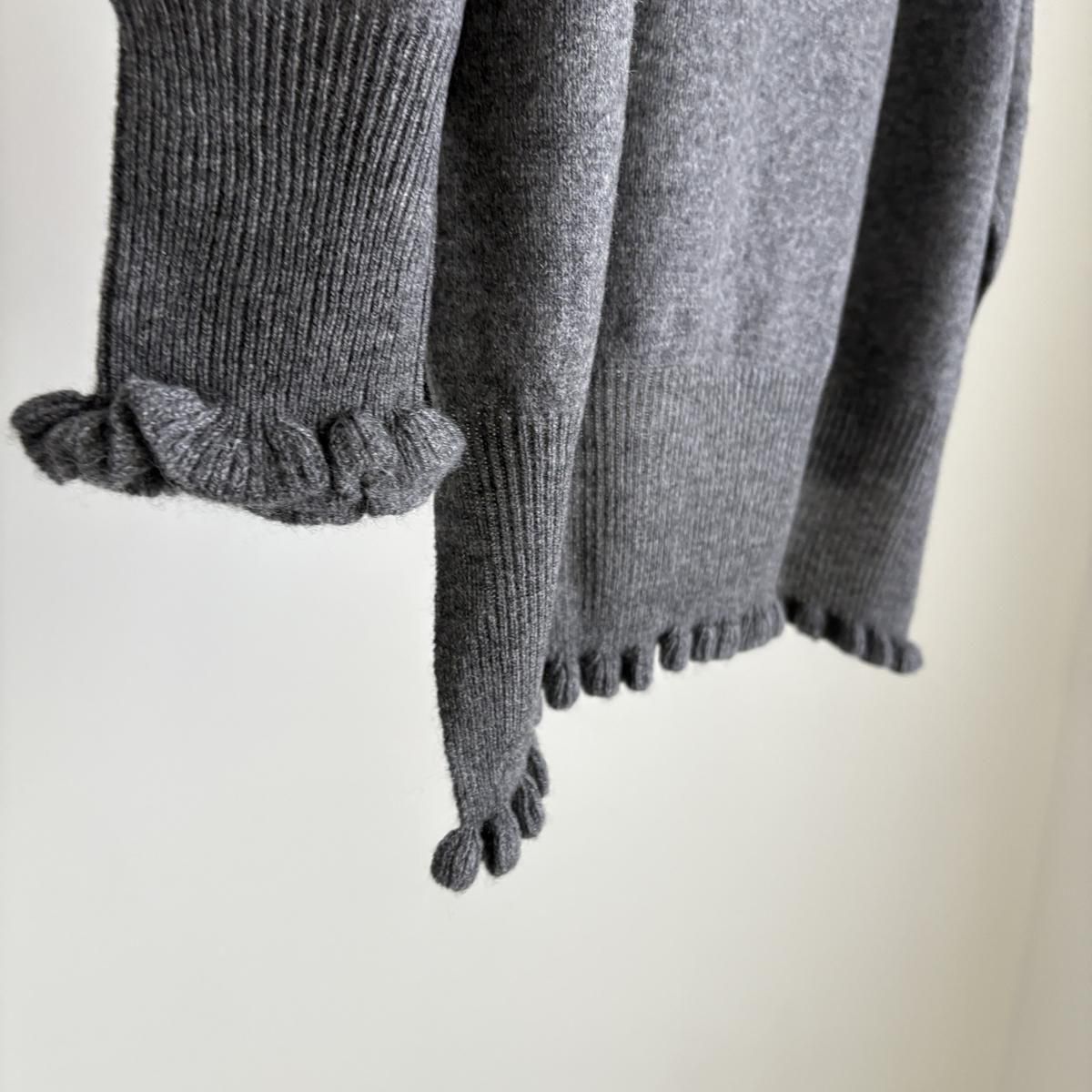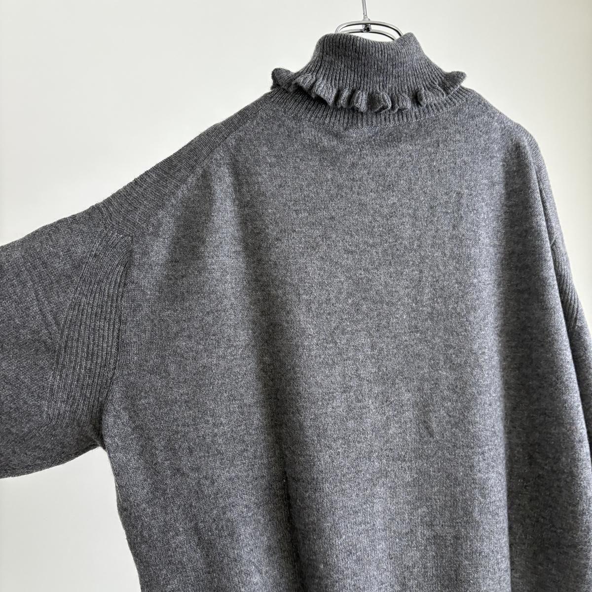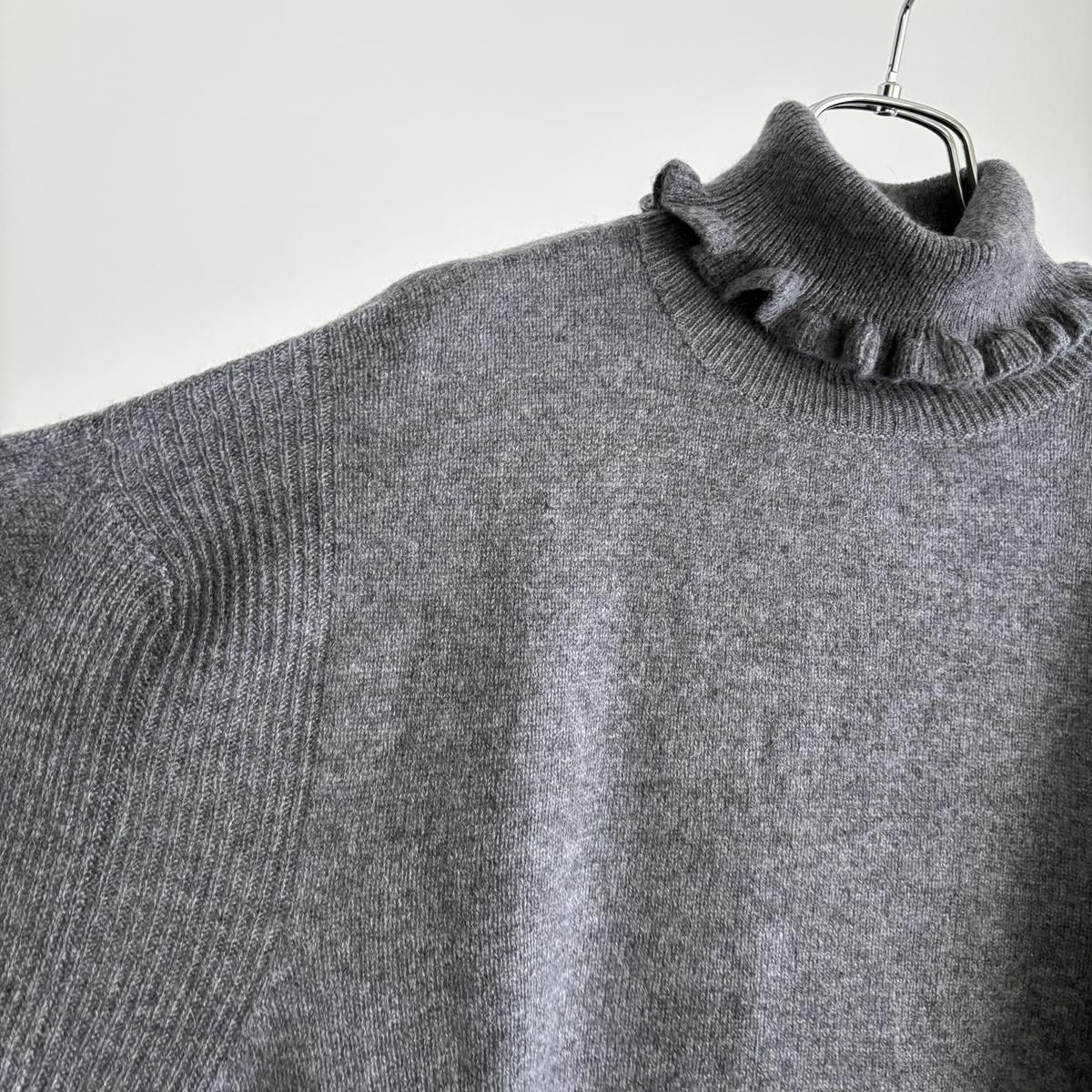 布帛の生地でも同シリーズが展開されていましたがニットになるとまたそのフリルの表現がたまらなく愛らしいディテールへ。タートルネック部分、袖口、裾、ポケットにさり気なくもフリルがあしらわれ、立体感のあるディテールが魅力的。前後で着丈をかえらているので、一枚で着用した時フロントの着丈がすっきりとしているのでバランスがとりやすく、両サイドの見え方も新鮮です。