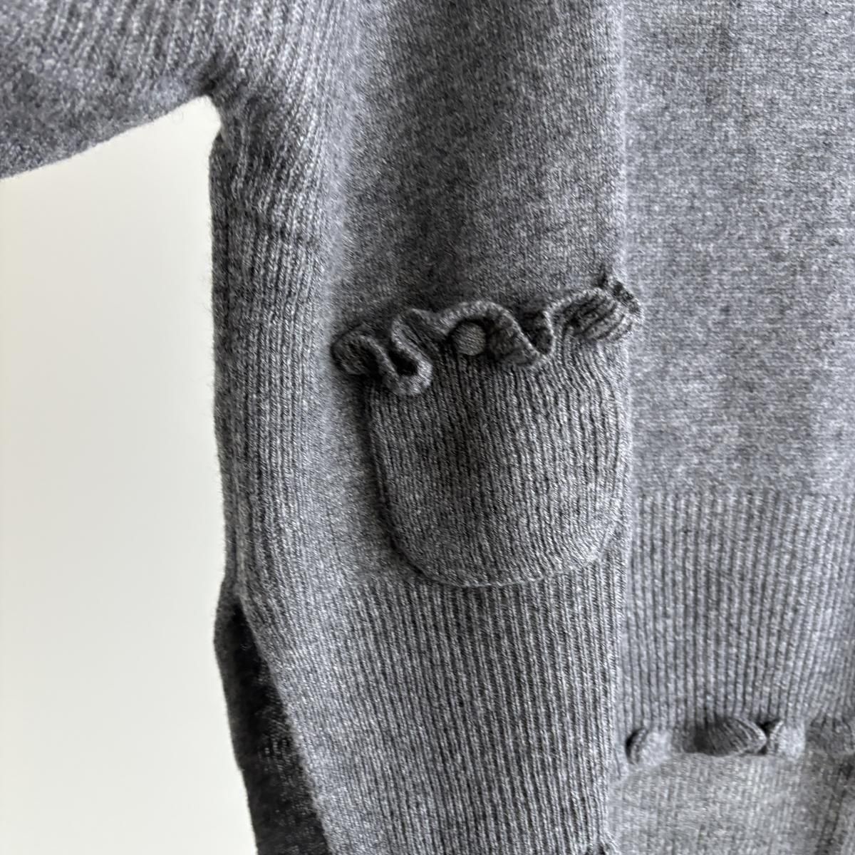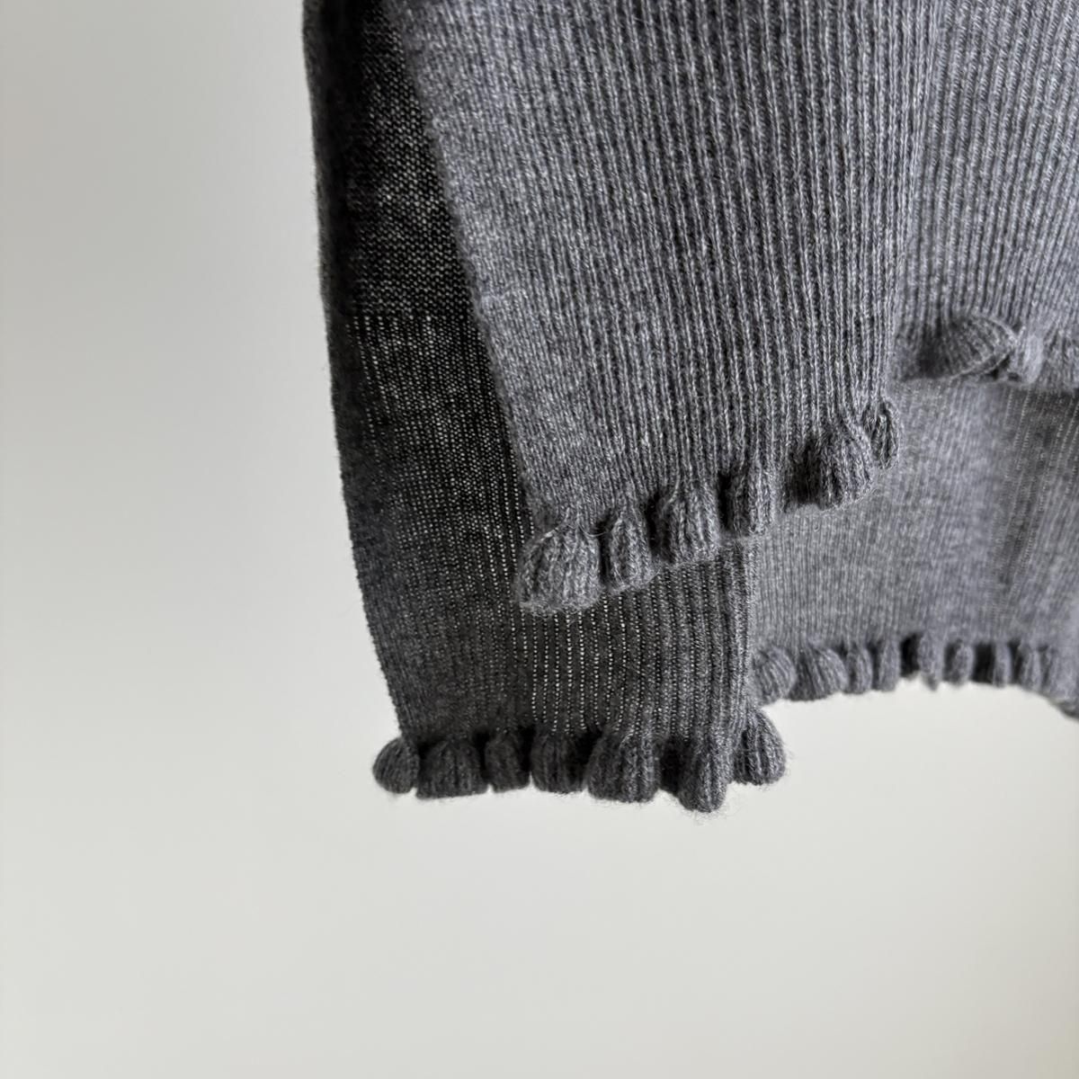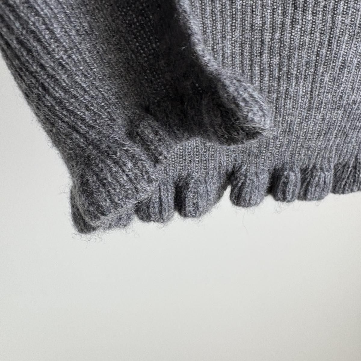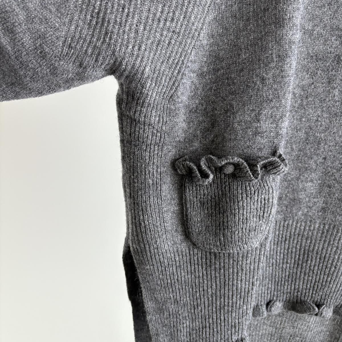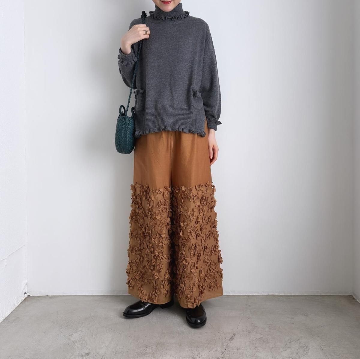 布帛の生地でも同シリーズが展開されていましたがニットになるとまたそのフリルの表現がたまらなく愛らしいディテールへ。タートルネック部分、袖口、裾、ポケットにさり気なくもフリルがあしらわれ、立体感のあるディテールが魅力的。前後で着丈をかえらているので、一枚で着用した時フロントの着丈がすっきりとしているのでバランスがとりやすく、両サイドの見え方も新鮮です。