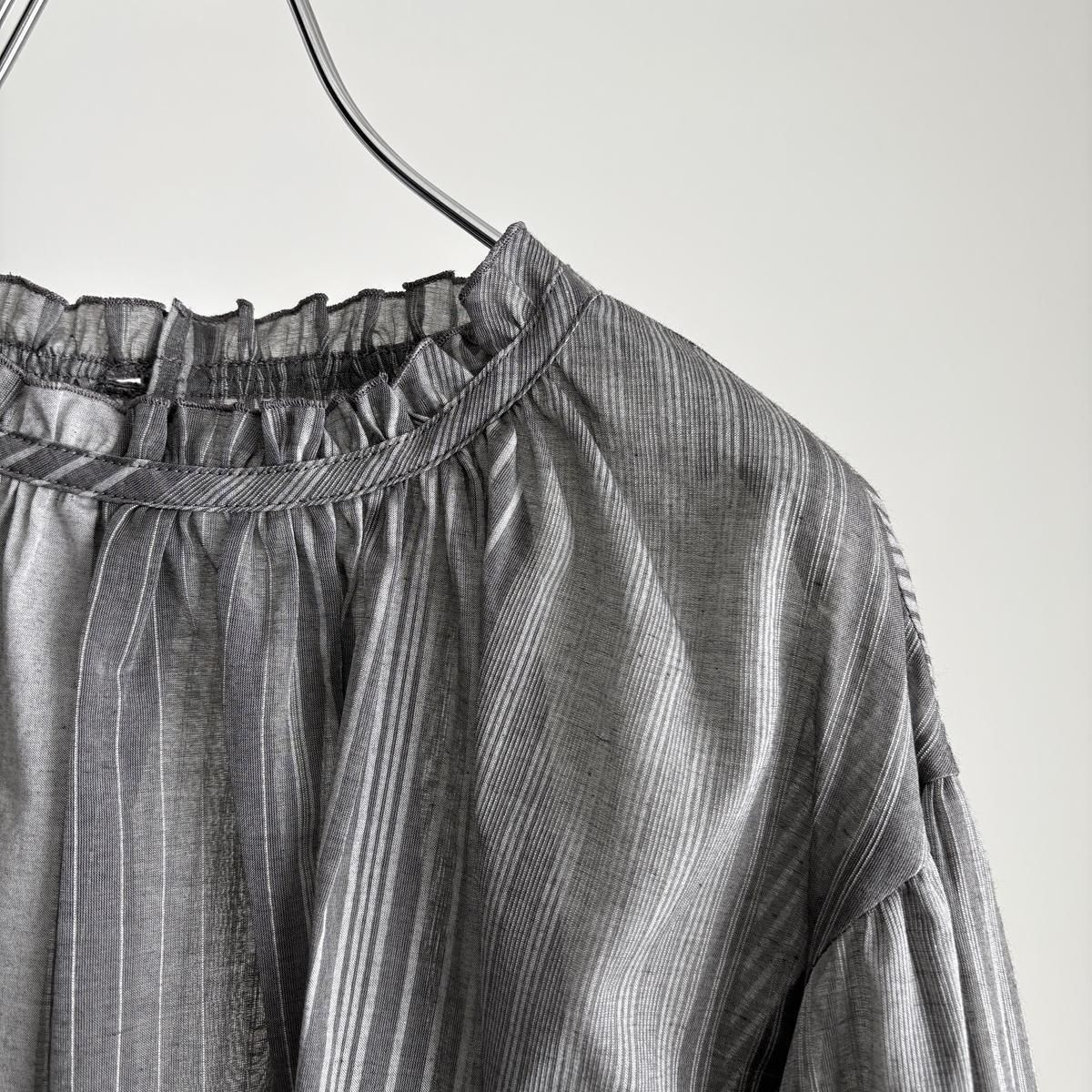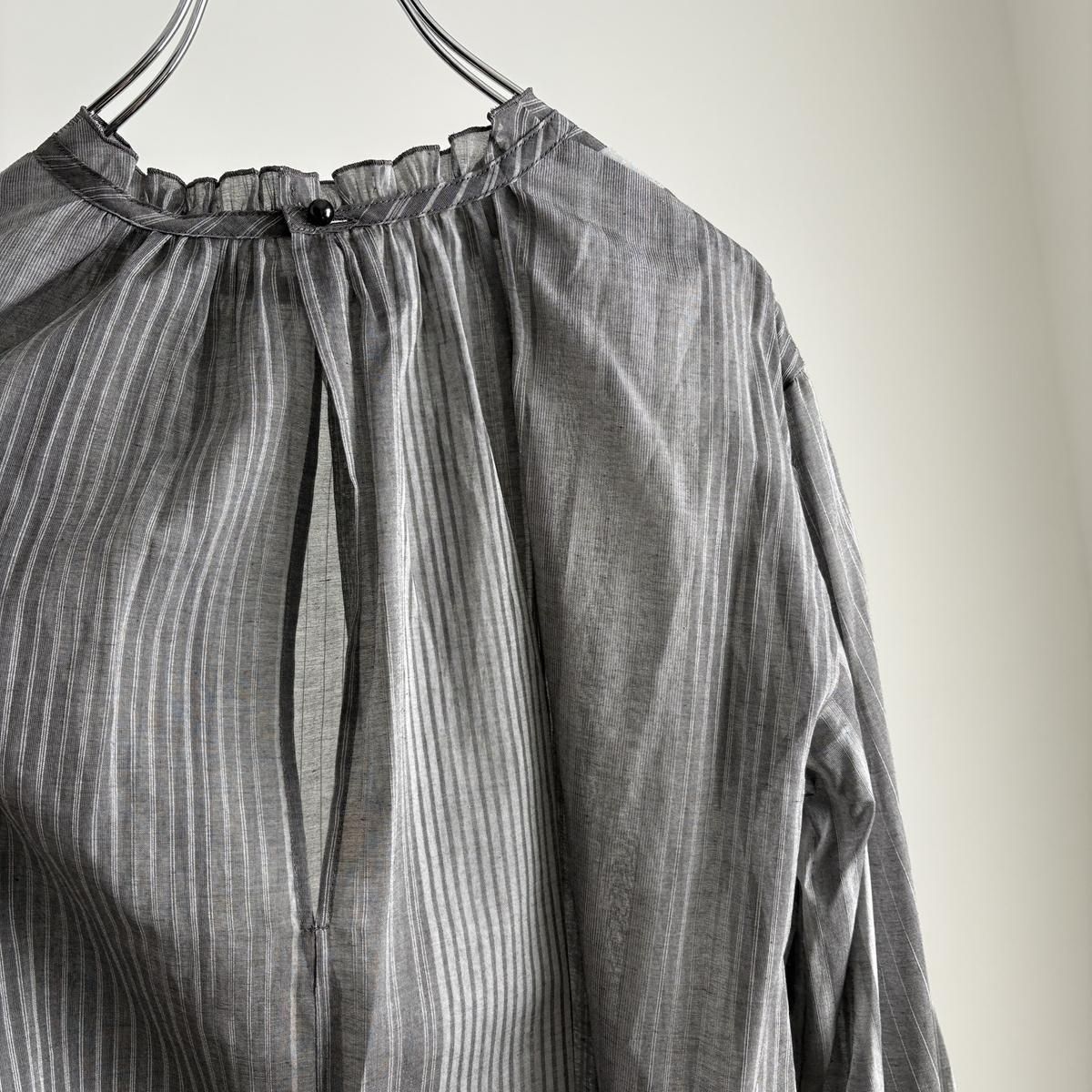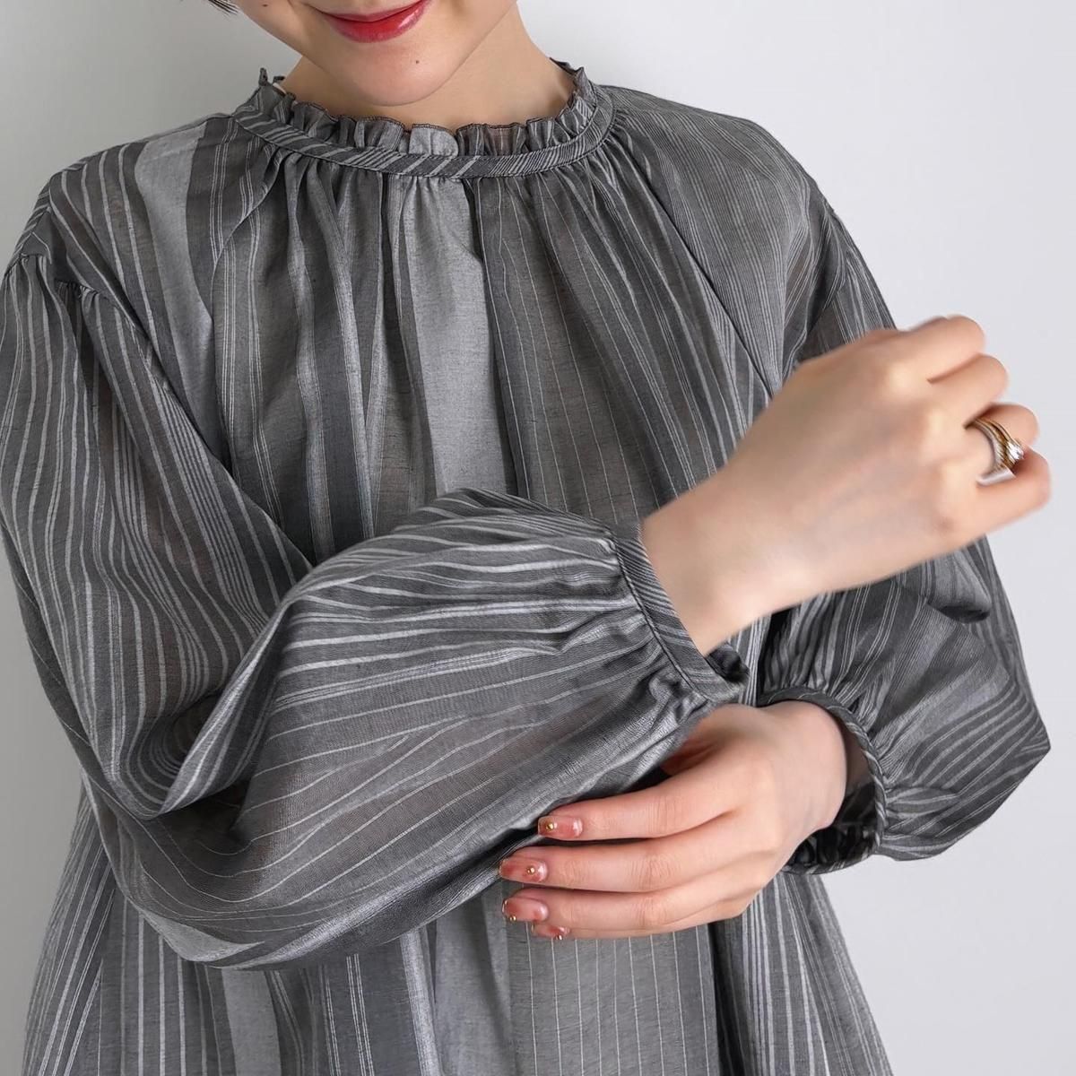 マニッシュな佇まいも感じられる柄ですが、首元のフリルがさり気なくも効いています。