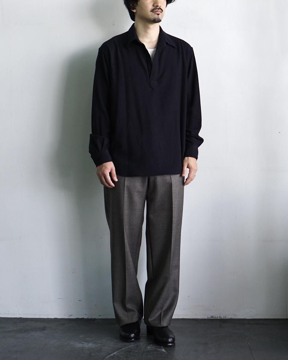・アメリカンなプラケット付きのプルオーバーシャツをベースにボタンレスのスキッパーデザインにアレンジしたゆったりとしたオーバーサイズシルエット。