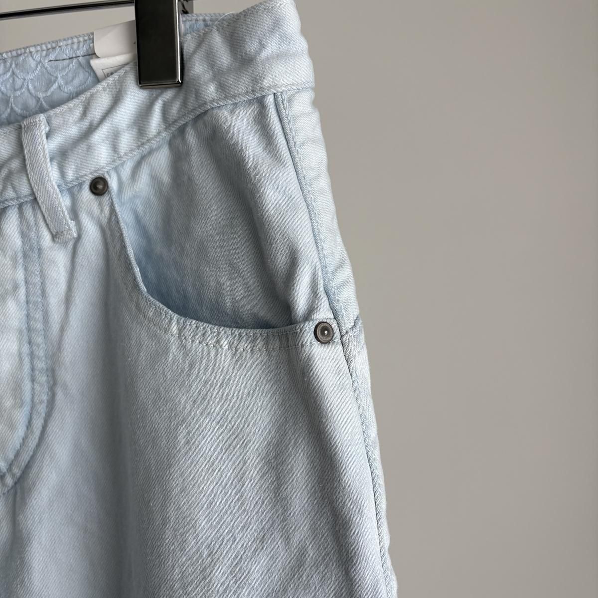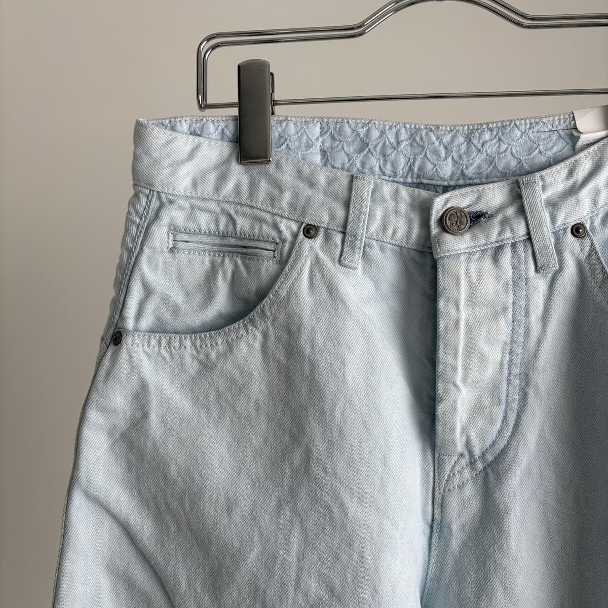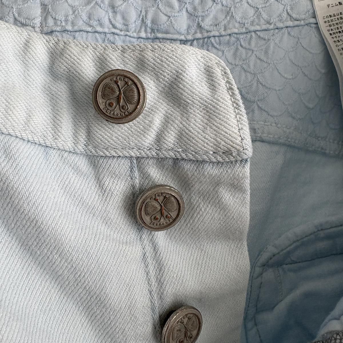 ヒップ、 腿周りにゆとりがあり、まるみのあるシルエットが特徴。フロントはボタンフライ、両サイドのステッチ、ボタンはchouchoの刻印がされ、バッグポケットの内側に“マーメイド”のテキスタイルが施され、拘りがギュッと詰ったデニムに仕上がっています。着用していくとマーメイドのうろこ刺繍のあたりが表にでて、経年変化をお楽しみいただけるデニムです。