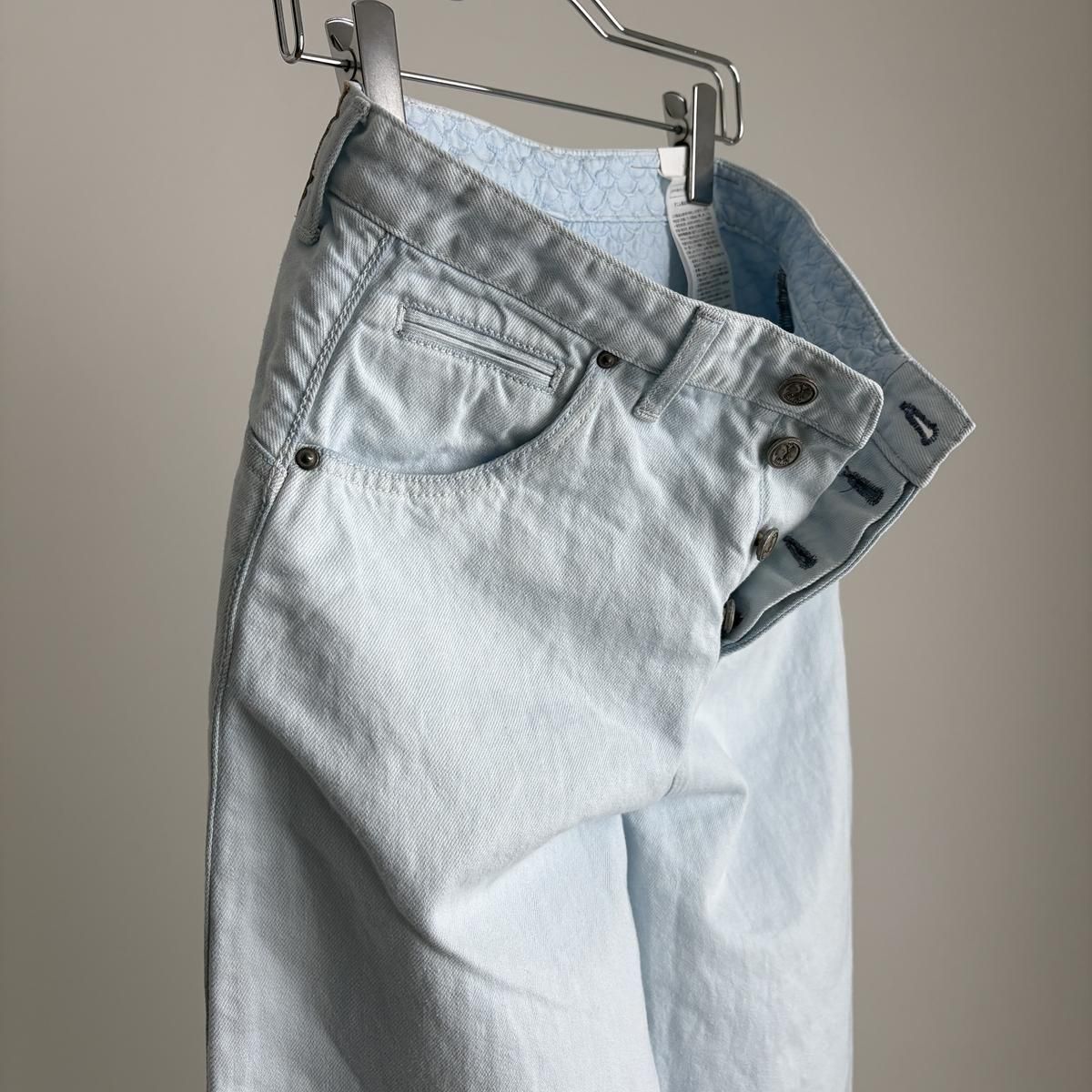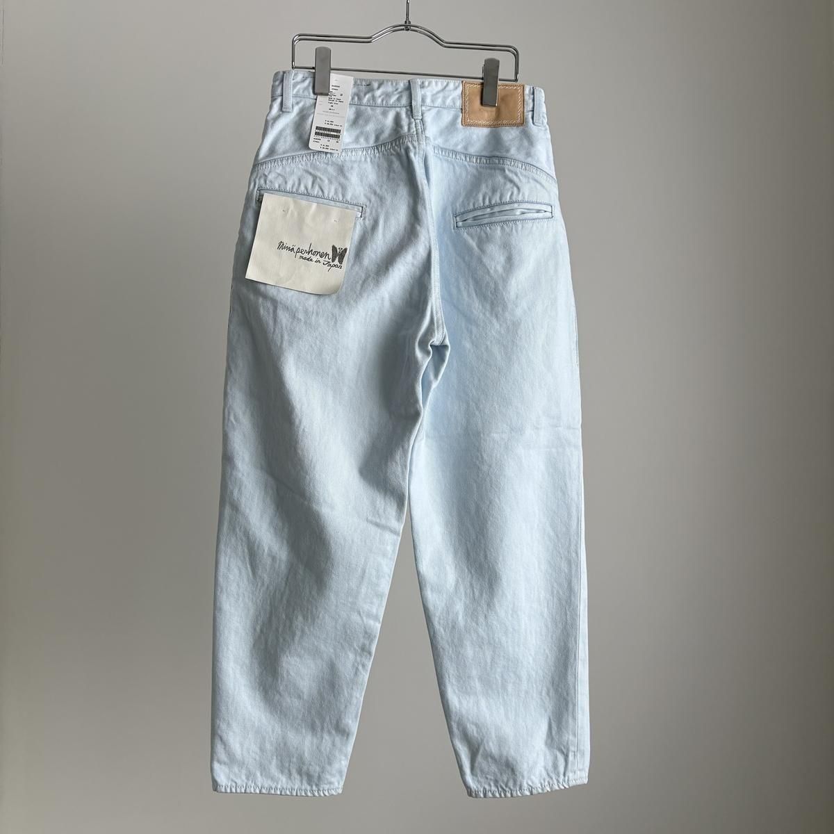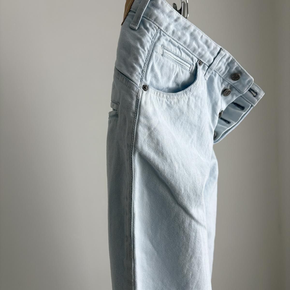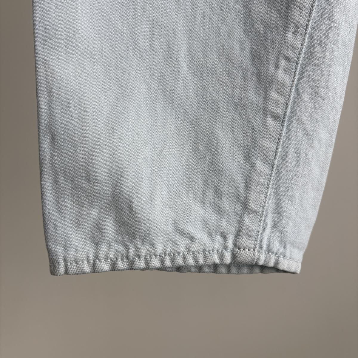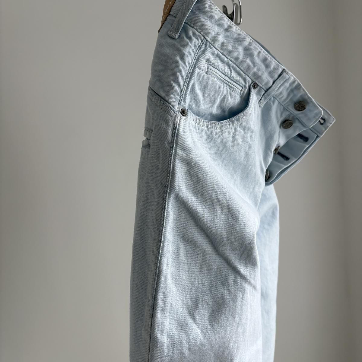 こちらは新しい新色のライトブルーのお色。ただの水色ではないのです。ワンウォッシュのindigoのお色をブリーチさせて白に近い状態してから、ほんのり水色のお色をのせているという、ただ事ではない加工が施されています。単純に他では得難いライトブルーがつくられました!