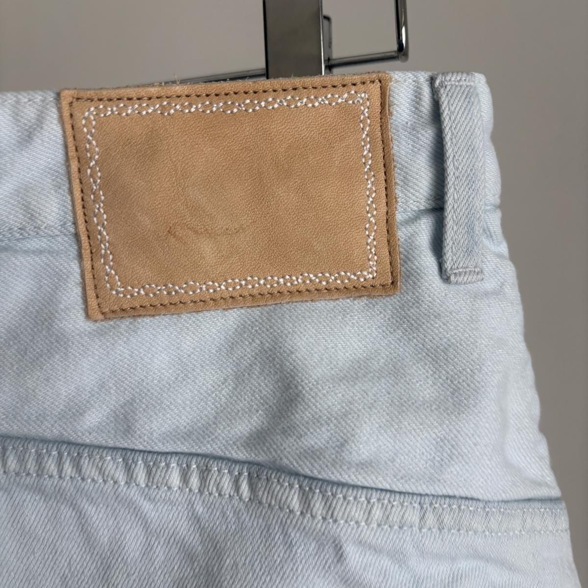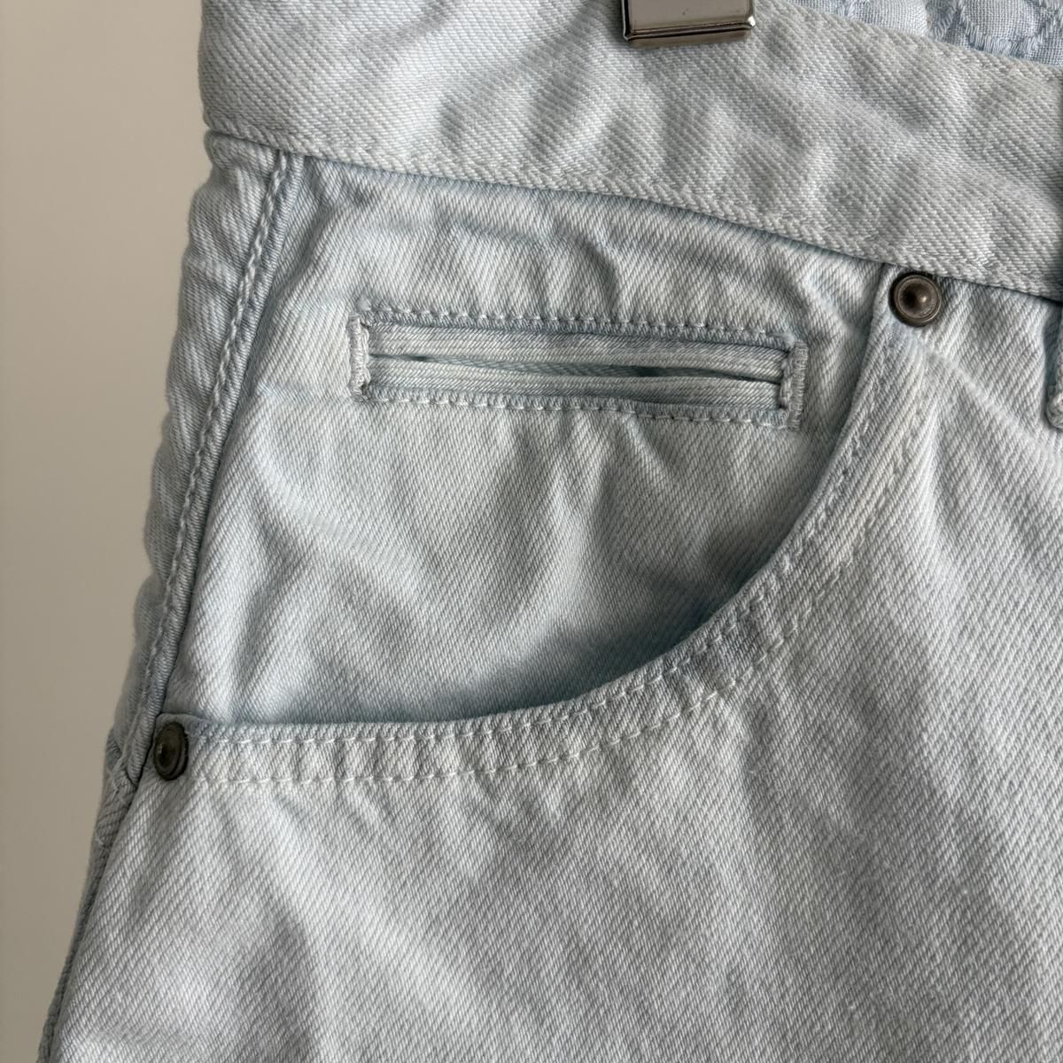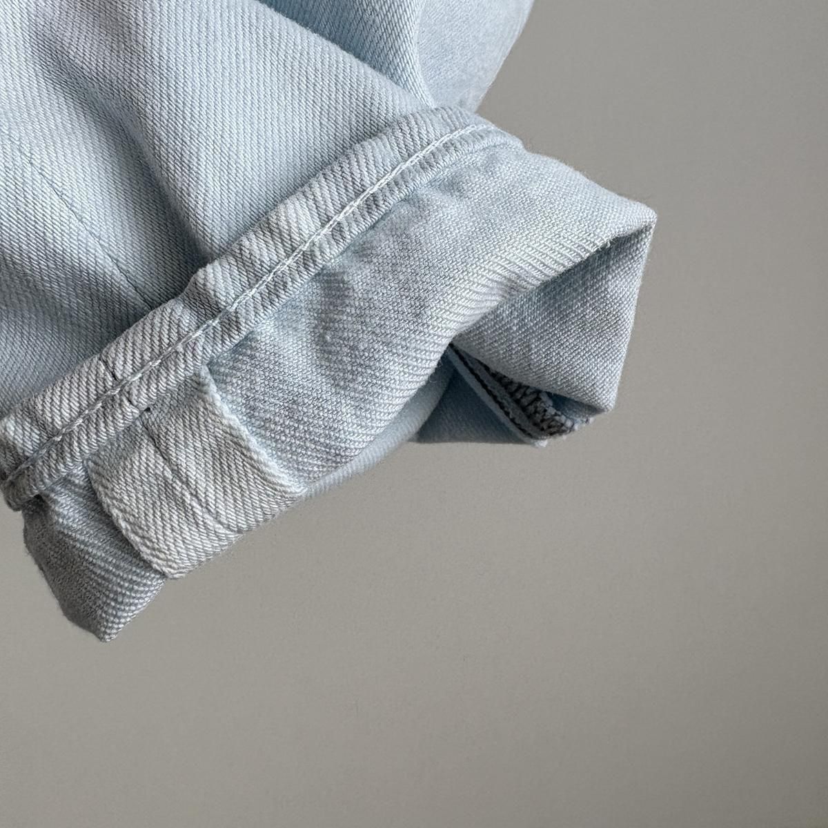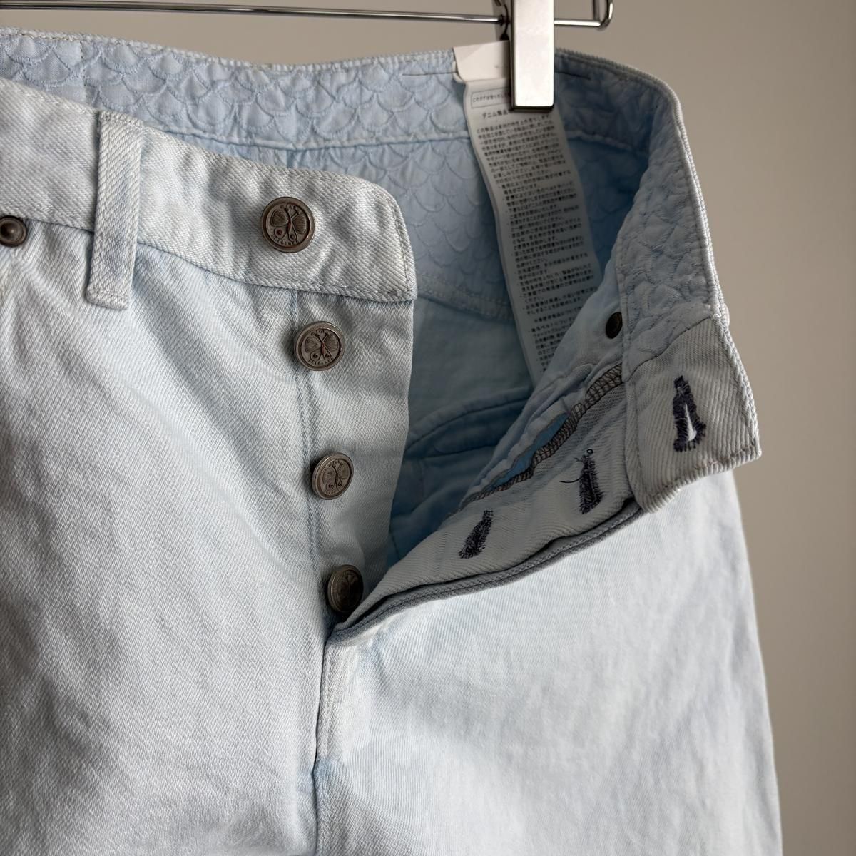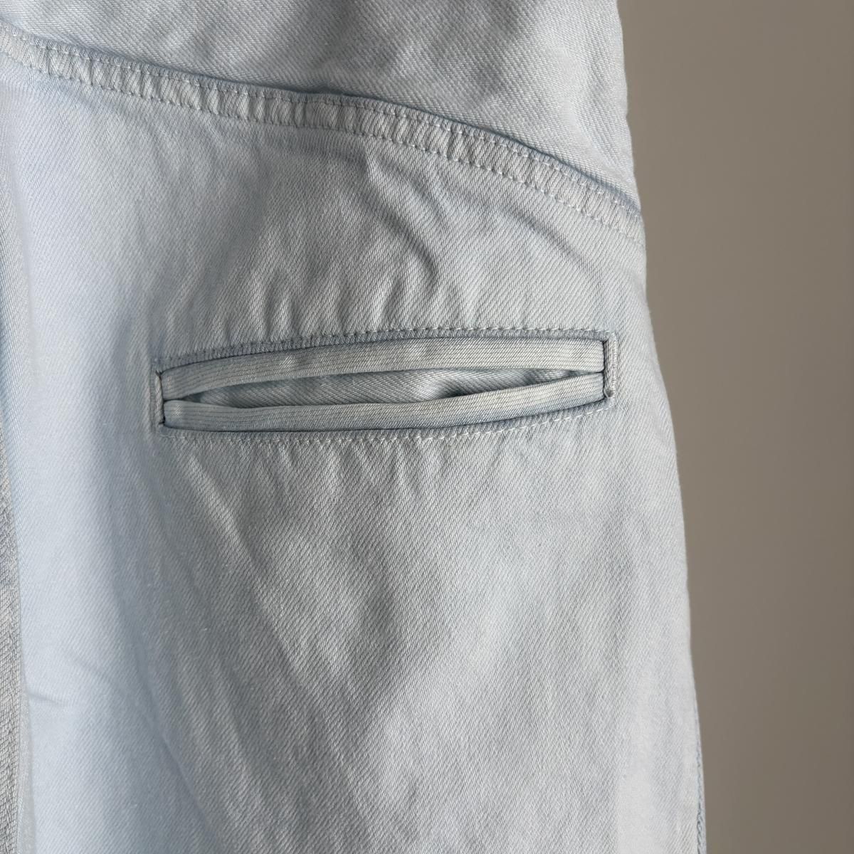 こちらは新しい新色のライトブルーのお色。ただの水色ではないのです。ワンウォッシュのindigoのお色をブリーチさせて白に近い状態してから、ほんのり水色のお色をのせているという、ただ事ではない加工が施されています。単純に他では得難いライトブルーがつくられました!