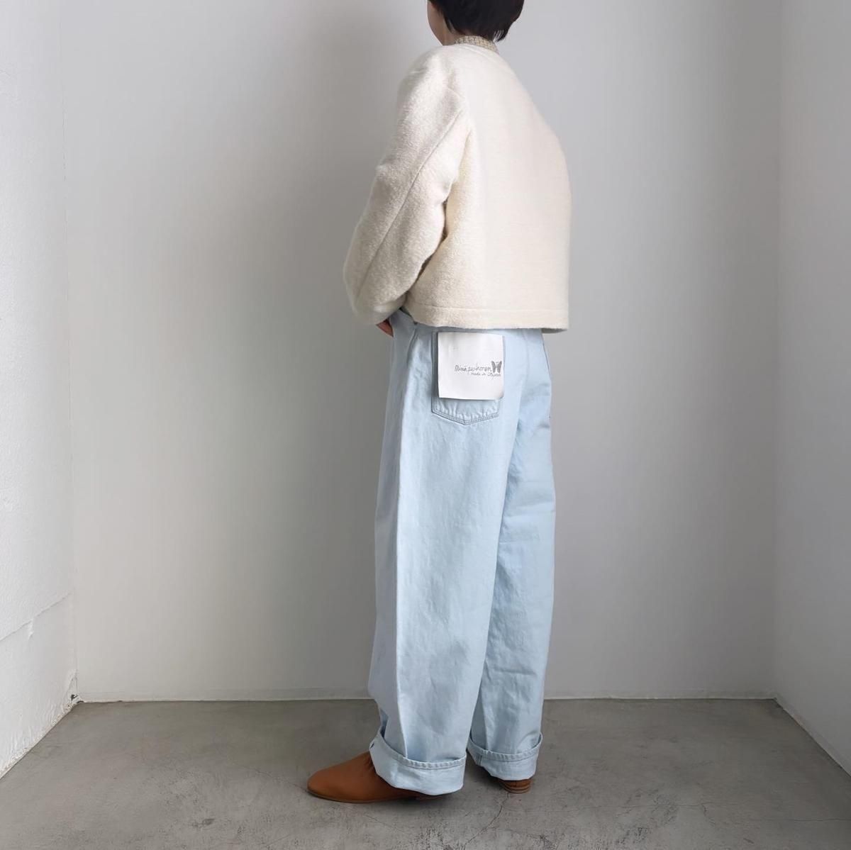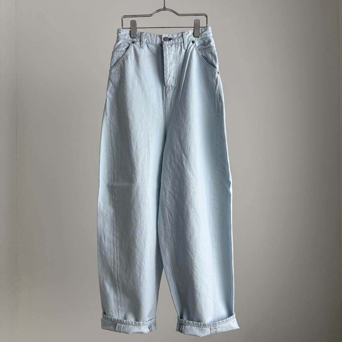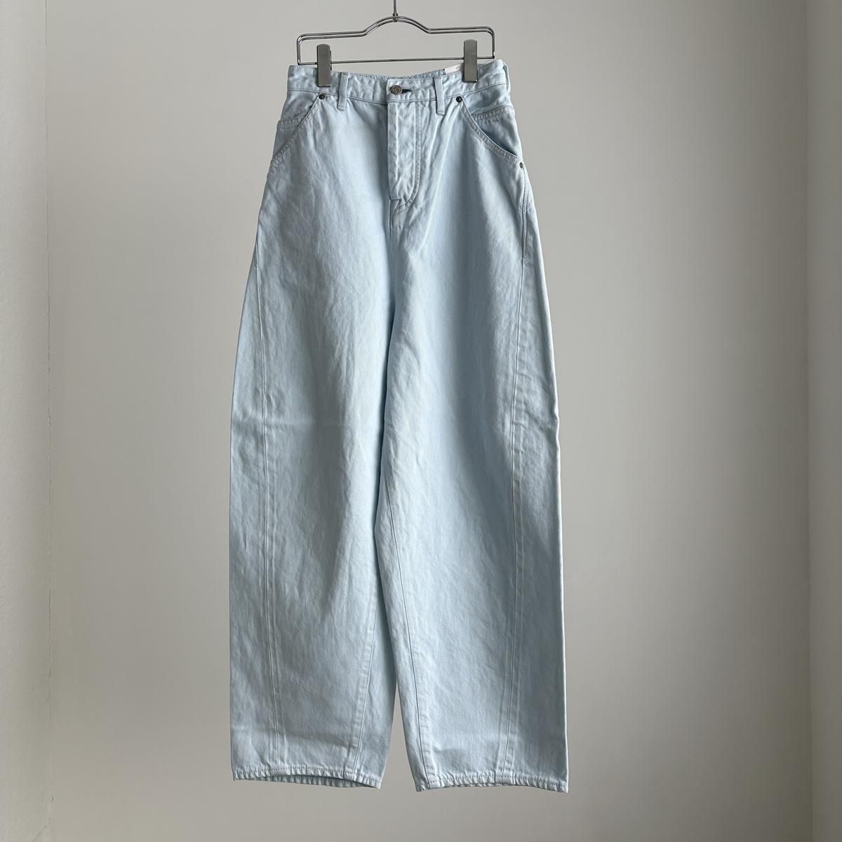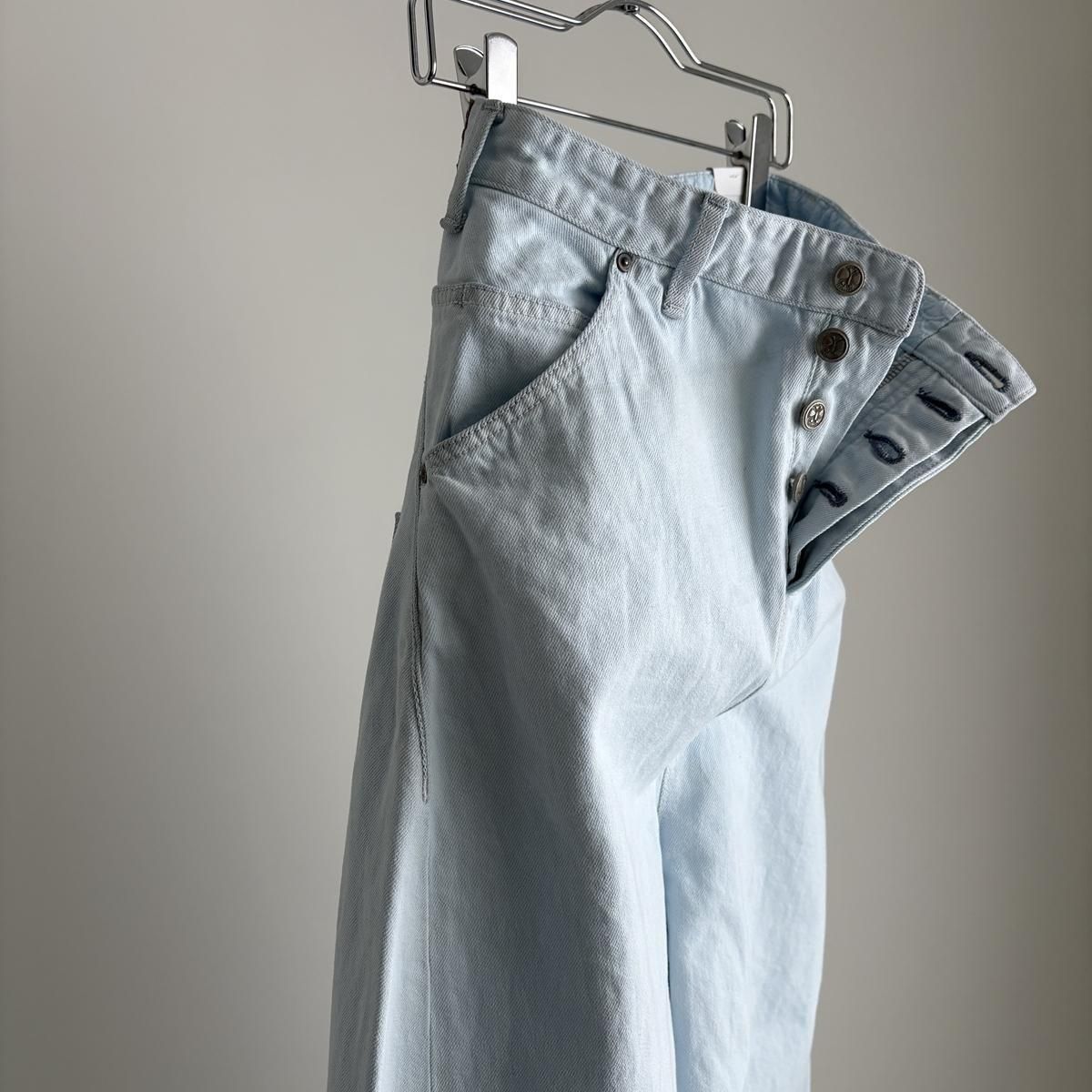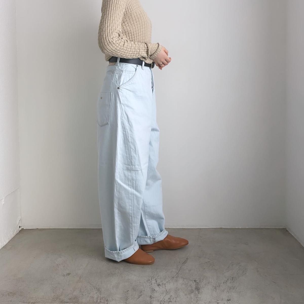 こちらは新しい新色のライトブルーのお色。ただの水色ではないのです。ワンウォッシュのindigoのお色をブリーチさせて白に近い状態してから、ほんのり水色のお色をのせているという、ただ事ではない加工が施されています。単純に他では得難いライトブルーがつくられました!