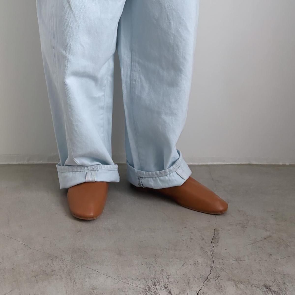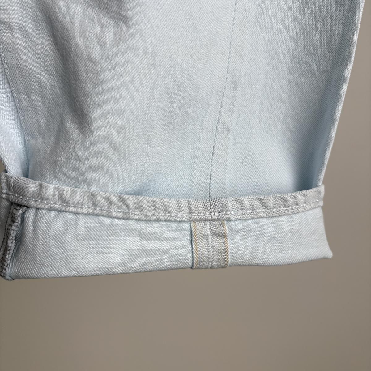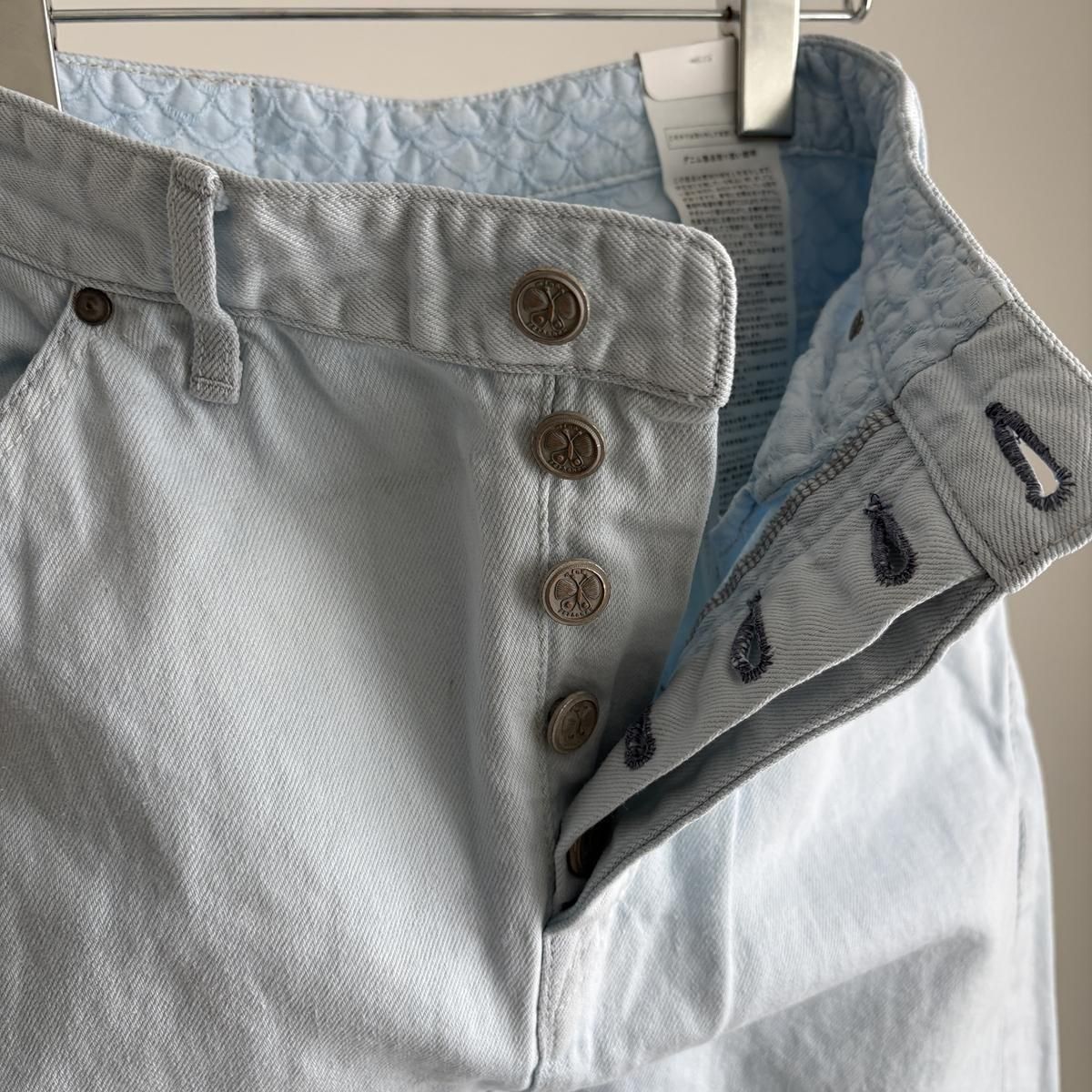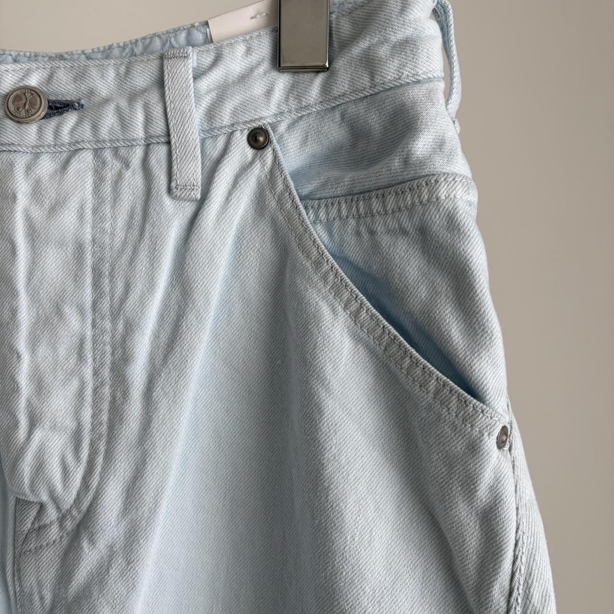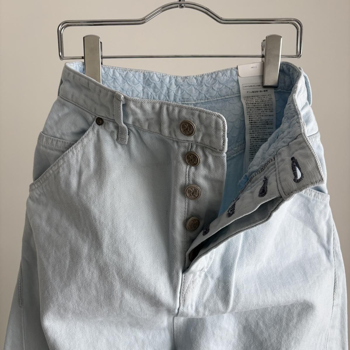 こちらは新しい新色のライトブルーのお色。ただの水色ではないのです。ワンウォッシュのindigoのお色をブリーチさせて白に近い状態してから、ほんのり水色のお色をのせているという、ただ事ではない加工が施されています。単純に他では得難いライトブルーがつくられました!