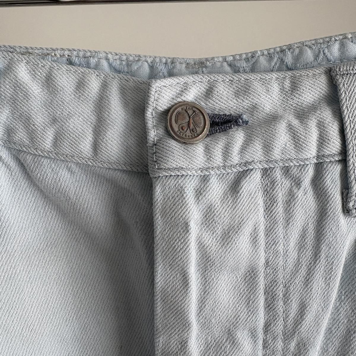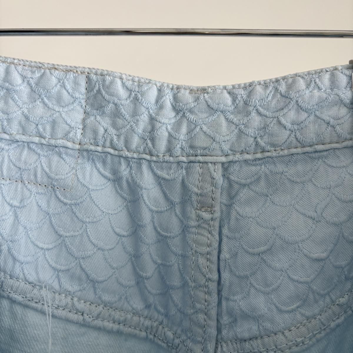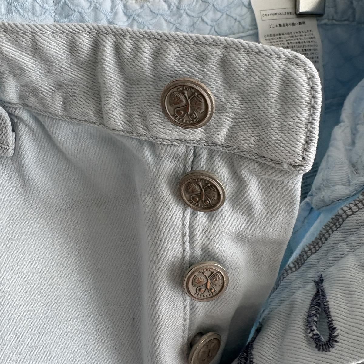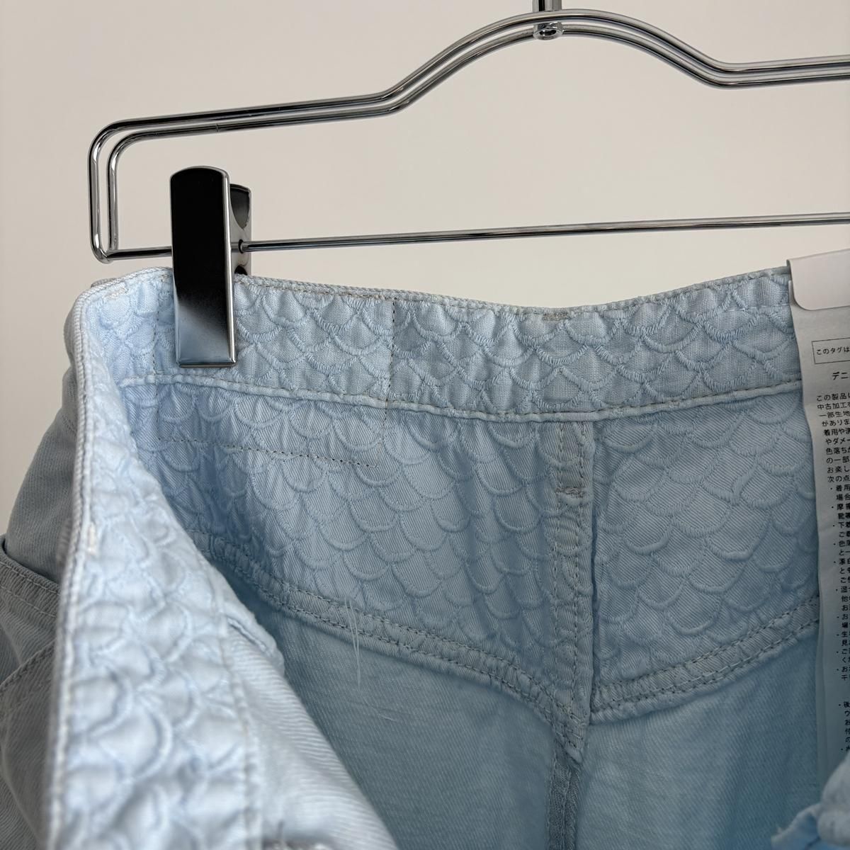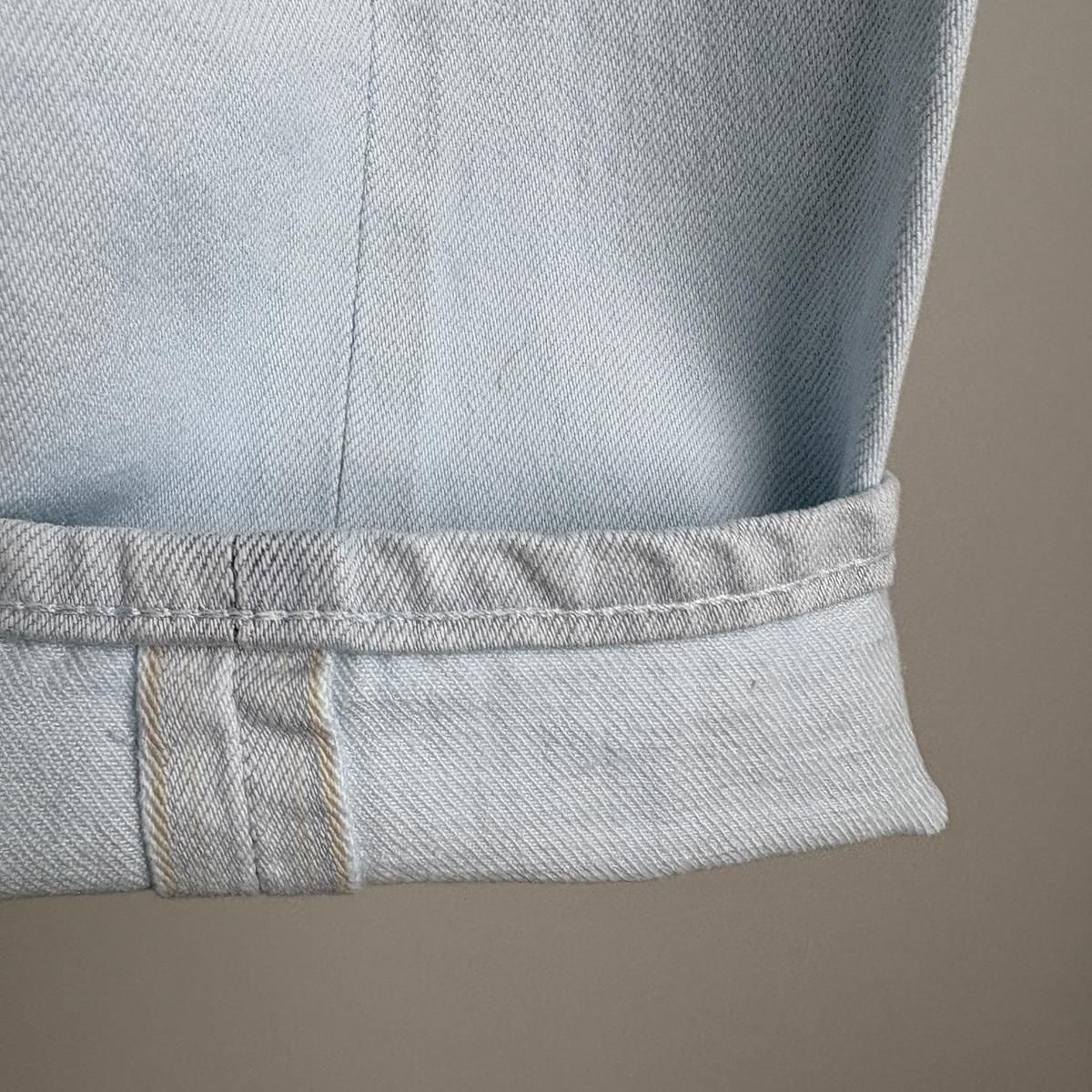 こちらは新しい新色のライトブルーのお色。ただの水色ではないのです。ワンウォッシュのindigoのお色をブリーチさせて白に近い状態してから、ほんのり水色のお色をのせているという、ただ事ではない加工が施されています。単純に他では得難いライトブルーがつくられました!