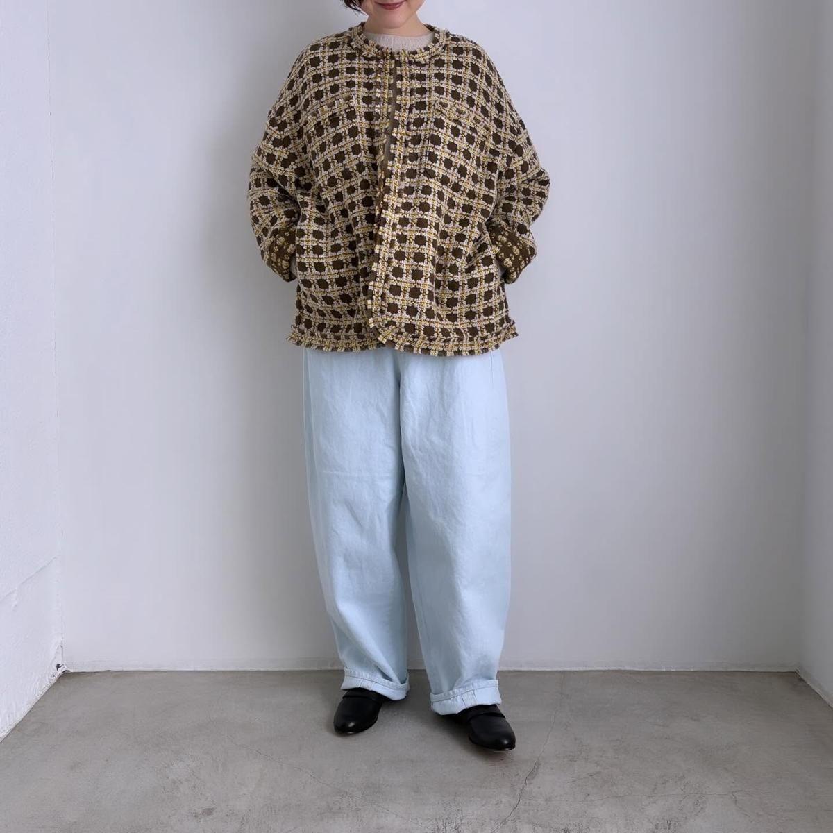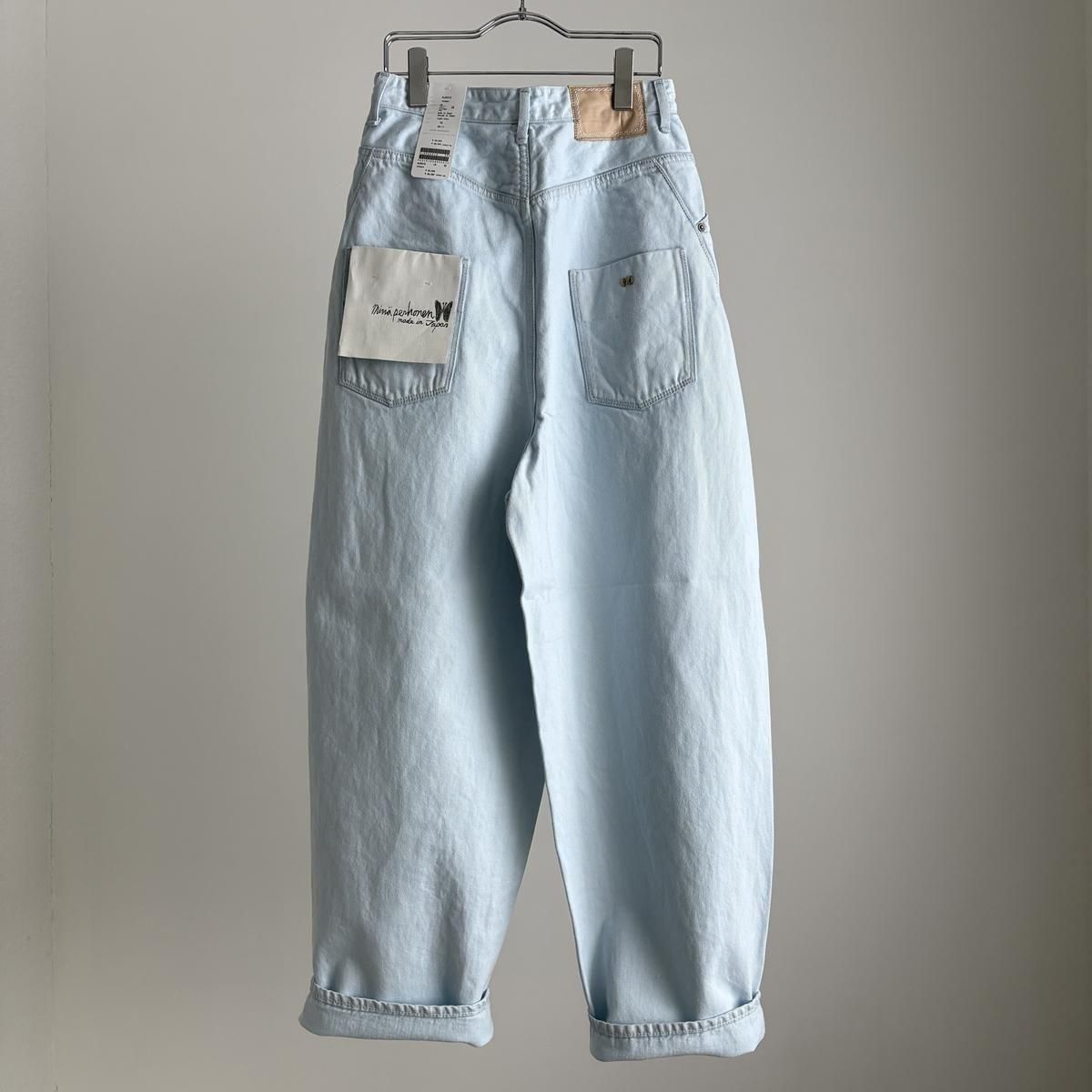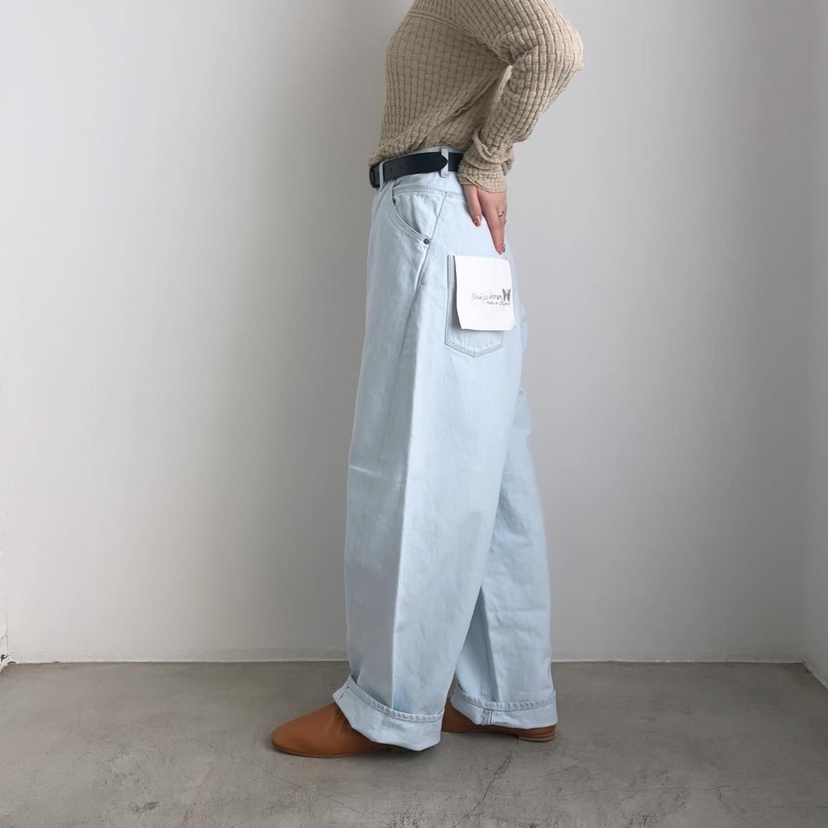 ミナペルホネンスタンダードアイテムの膝が立体的になるボリュームのあるシルエットが特徴のバルーンワイドデニムです。両サイドのセルビッジが、裾に向かって窄まり前の中心にくるようなパターンです。穿き込むと柔らかな風合いになるよう、リネンを横糸に使用したり、chouchoの刻印がされたオリジナルボタンを使ったボタンフライの作りや裾の赤みみ、バックポケットの内側に“マーメイド”刺繍が施された(はいていくことでアタリがでて、表に浮き上がってきて経年変化を楽しめます)作りなどは今までのalwaysデニムシリーズと同じです。ヒップのアウトポケットについたチョウチョモチーフもポイント。男性にもおすすめのデニムです。