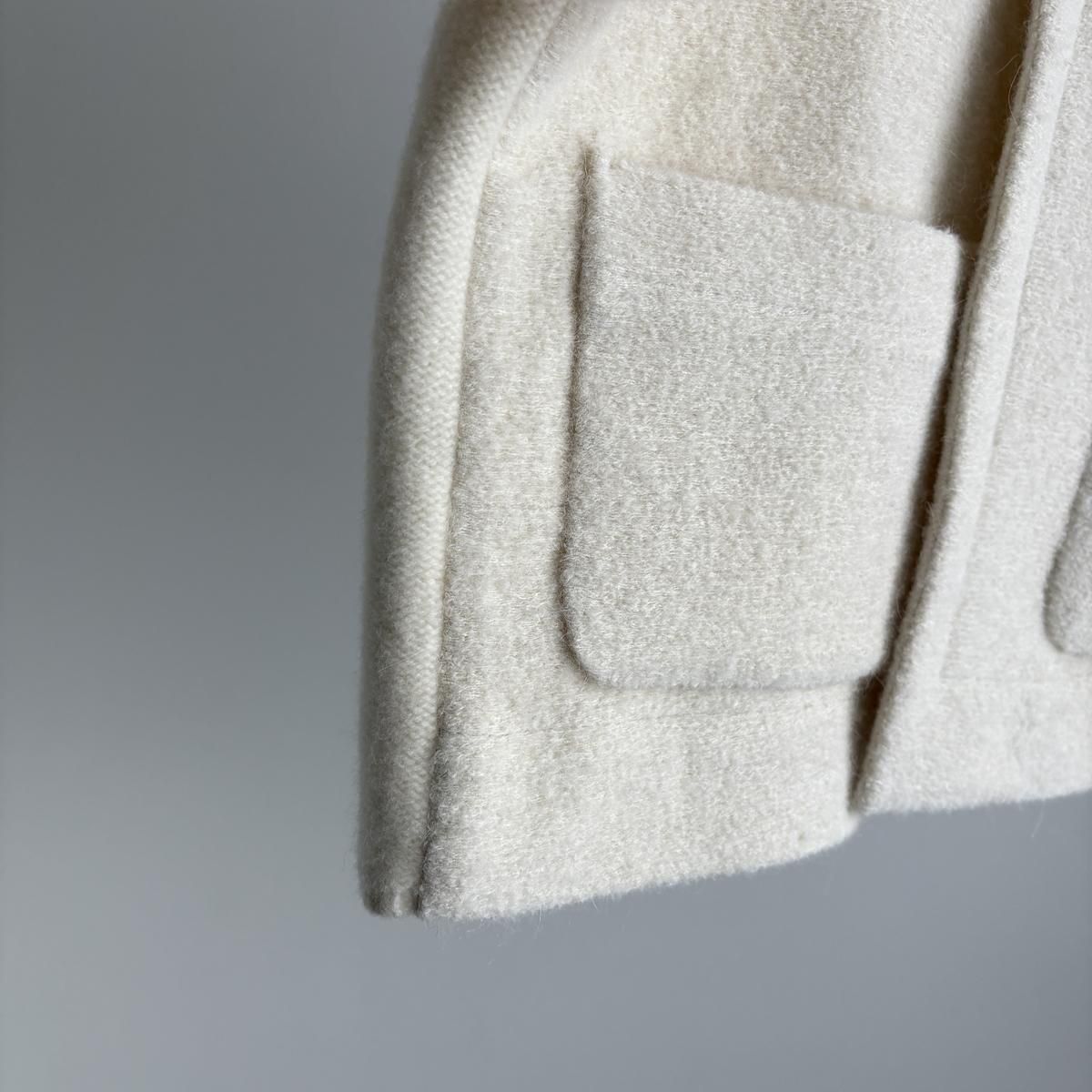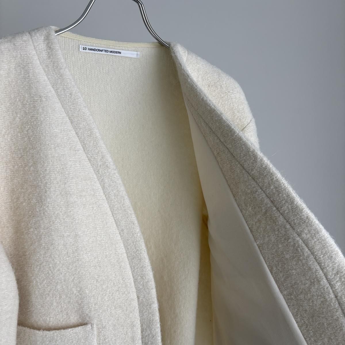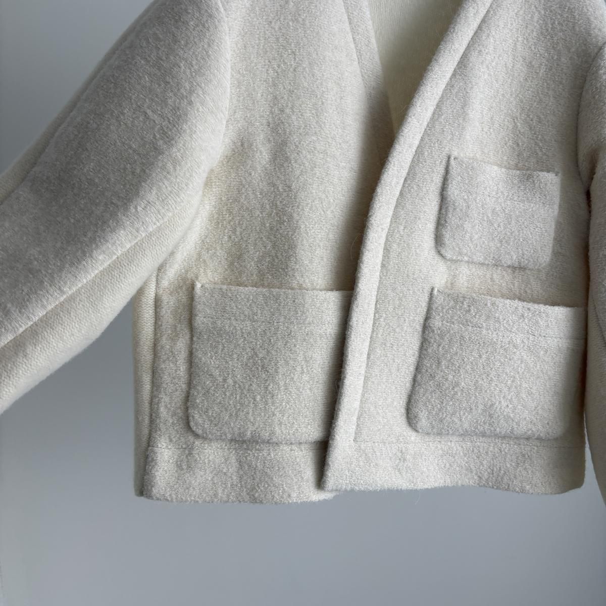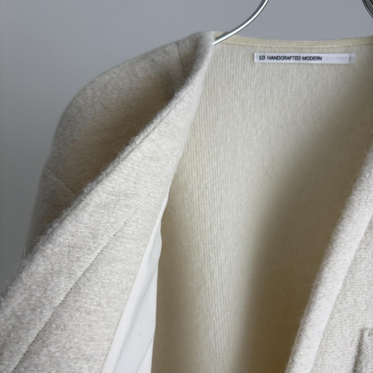TENNEさんオリジナルでつくられた贅沢なアンゴラツィードの生地は品の良さもうかがえつつ、雰囲気ががあります。ボタンレスのジャケットです。身頃ついた外付けの横長ポケットがぷっくりとして、またアシンメトリーなつき方もチャーミング。